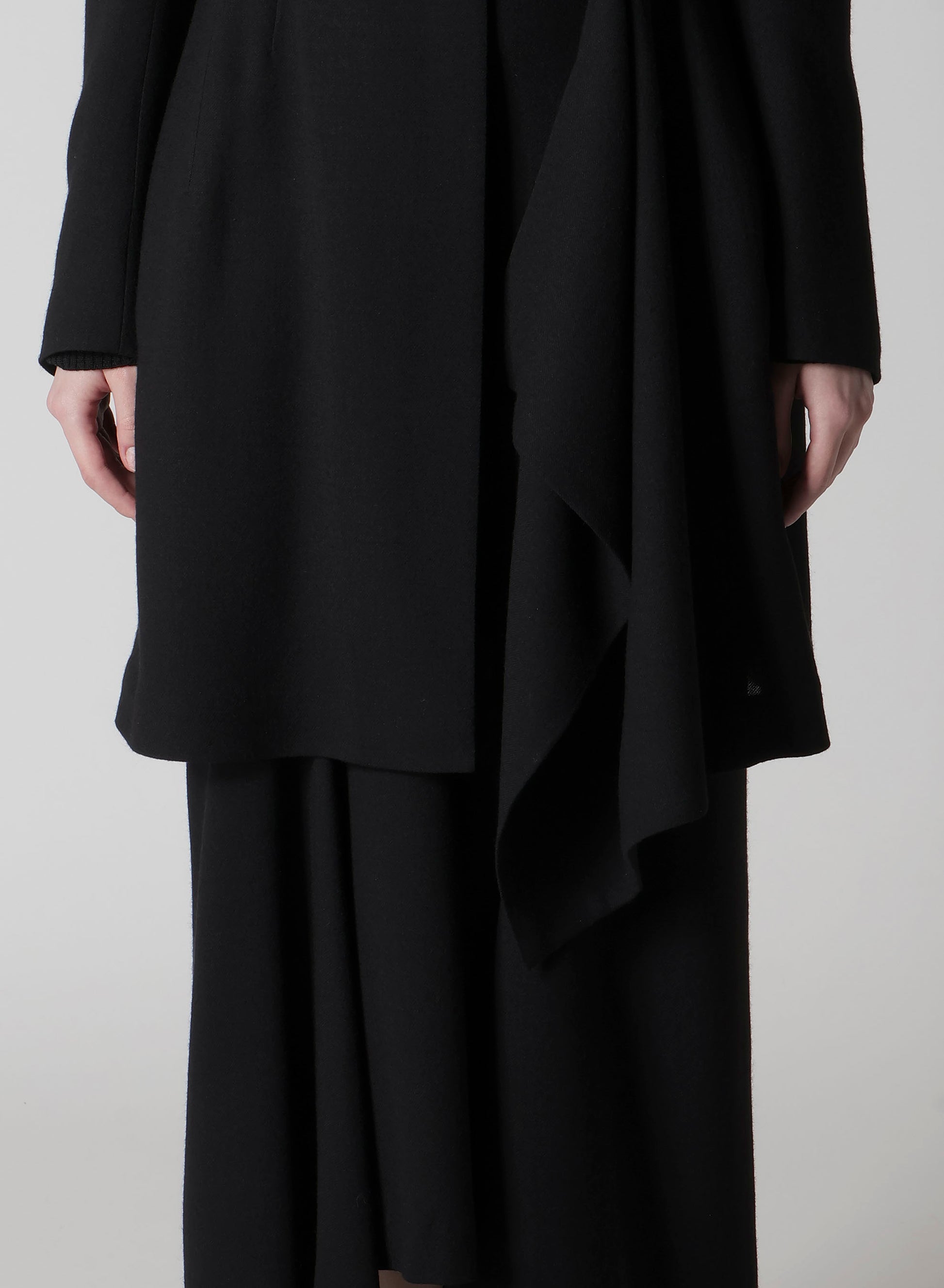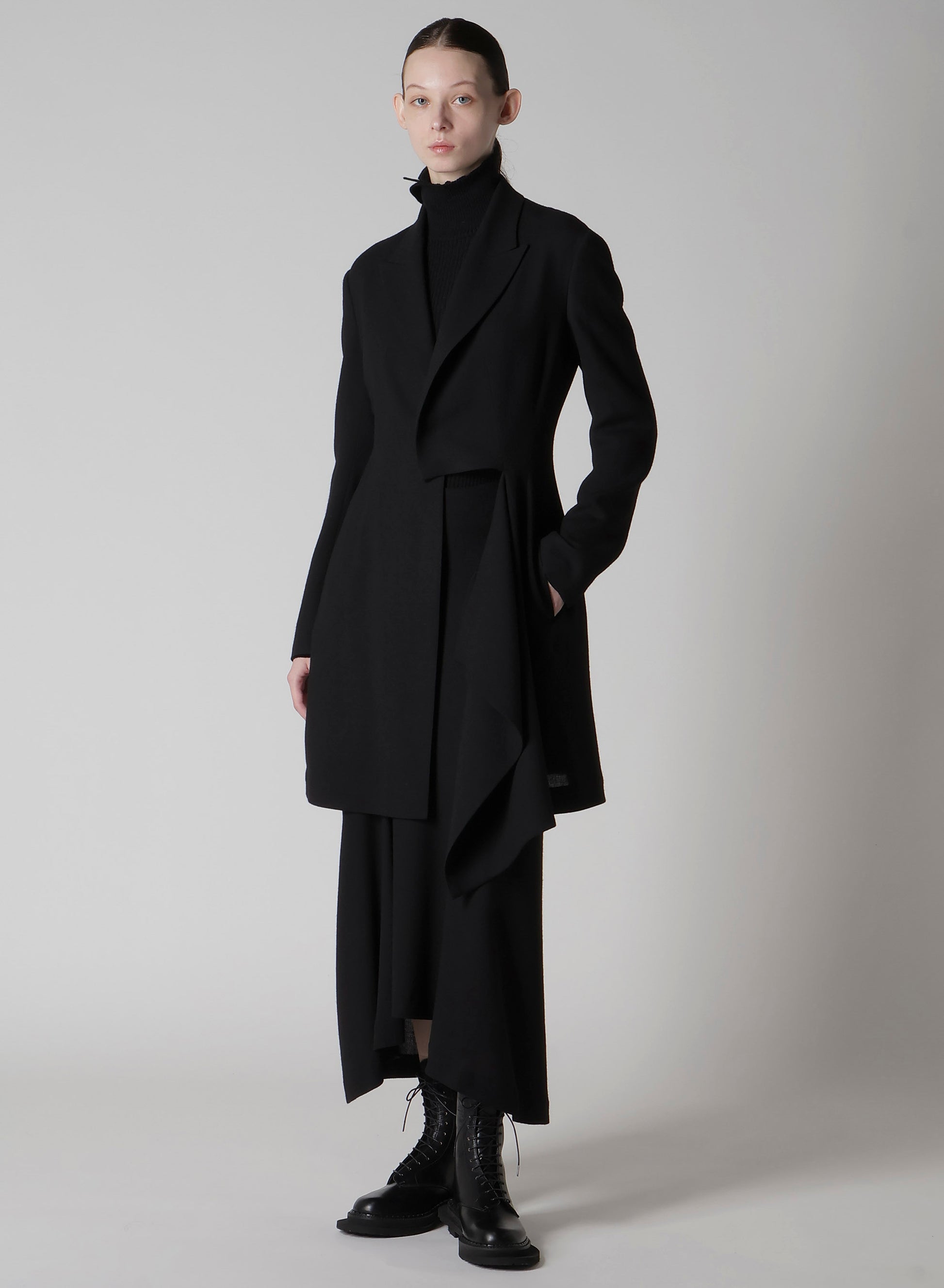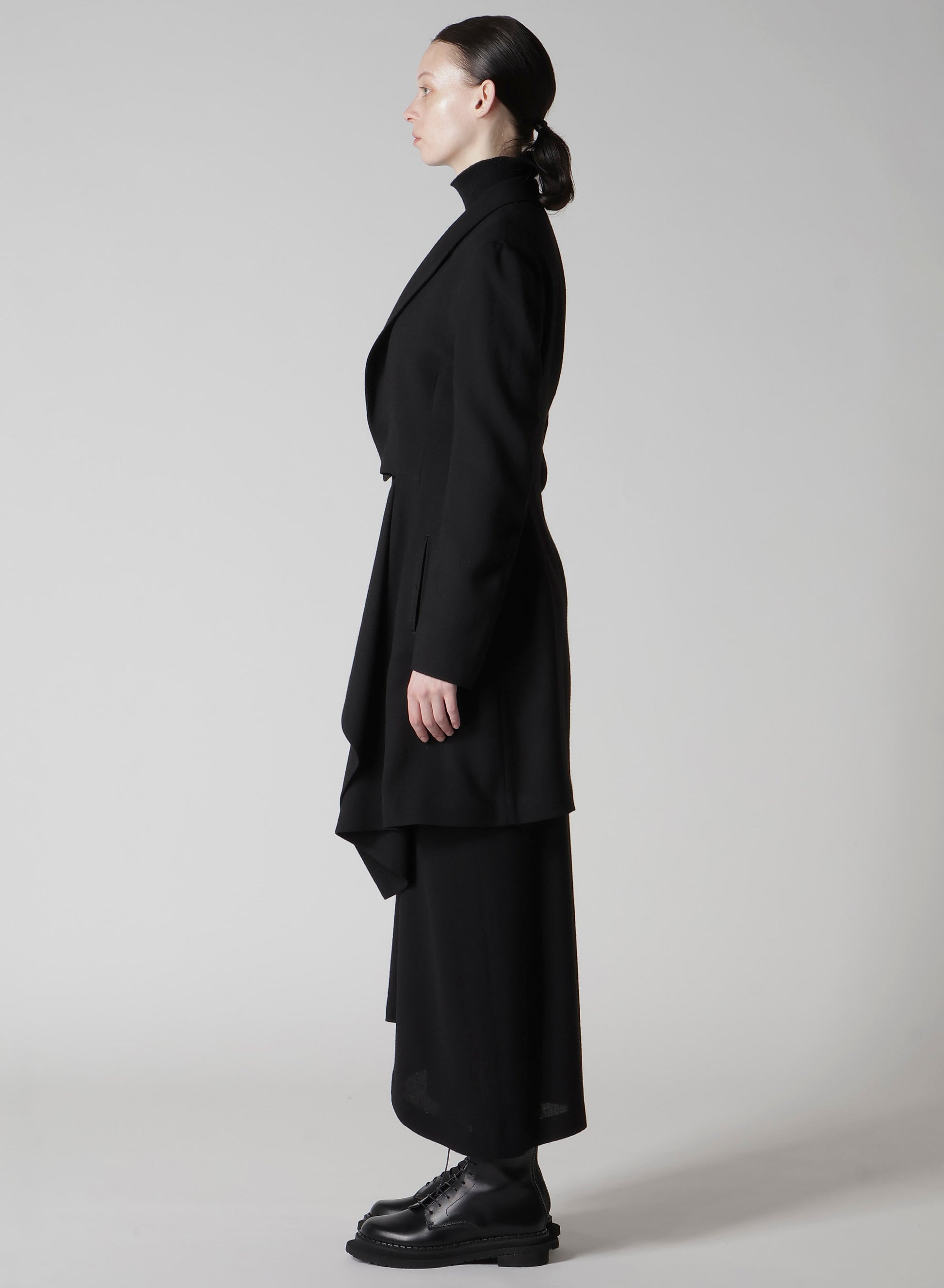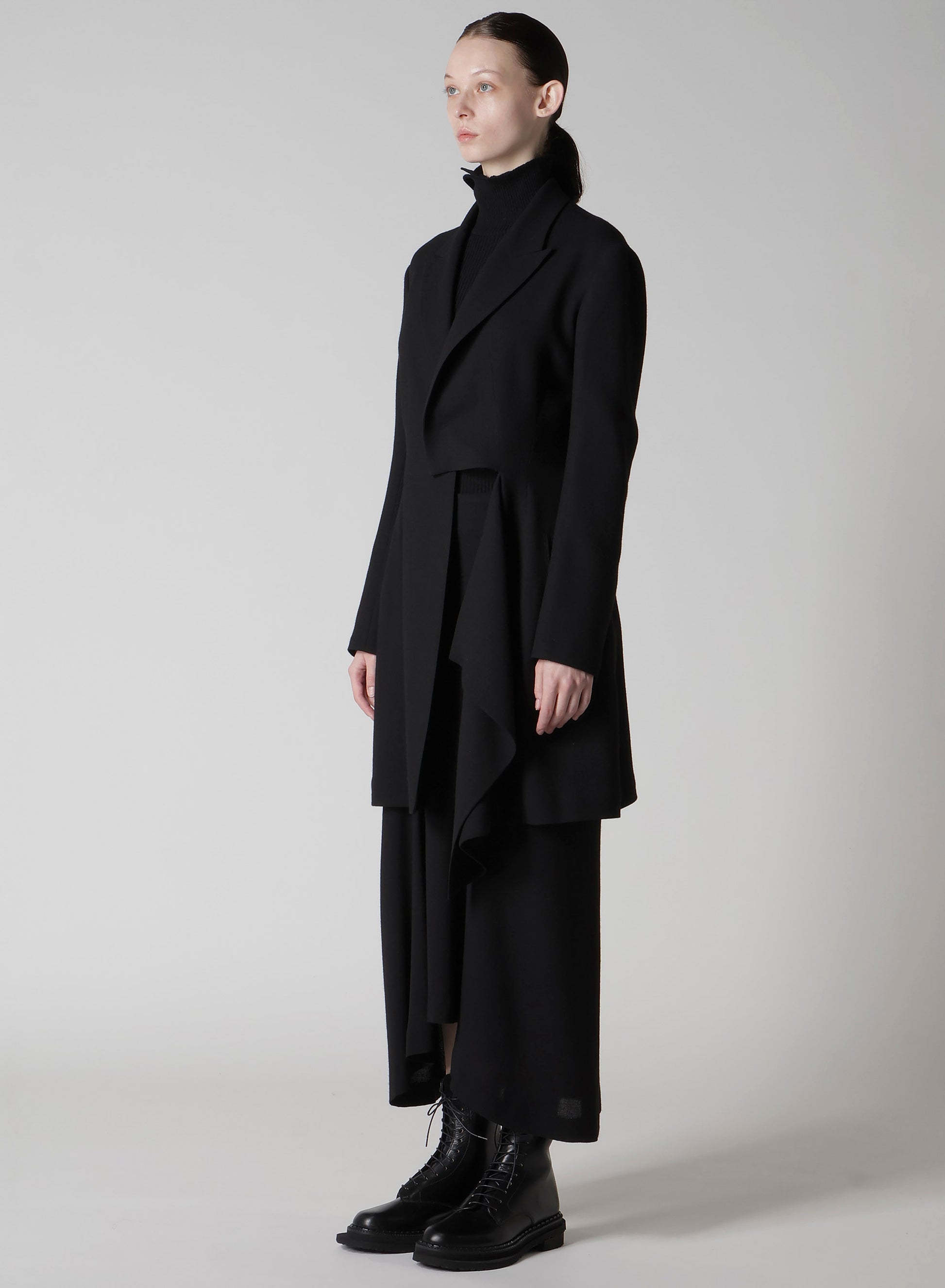 This jacket features a draped design, using wool-rayon gauze with a washer finish for a soft and subtly crisp texture. The fabric's drapery and front cut create a dynamic silhouette. Can be paired with a skirt in the same material for a coordinated look.