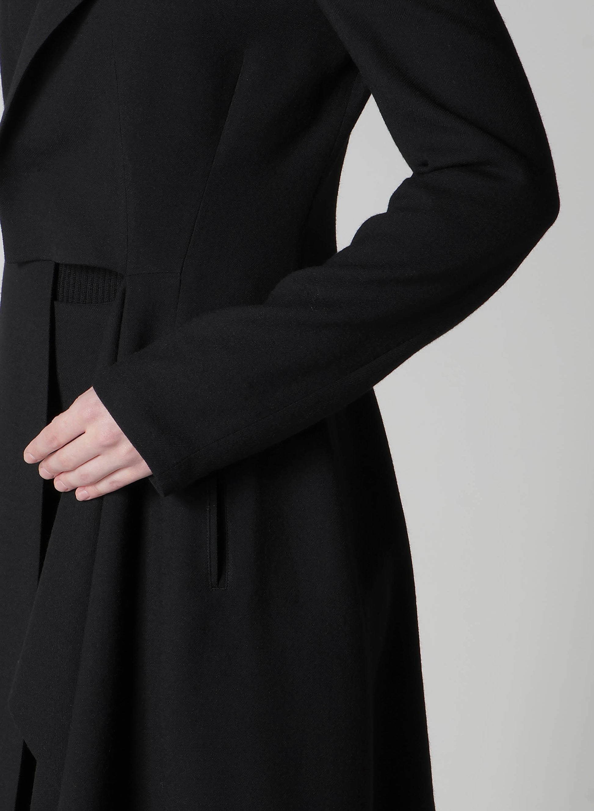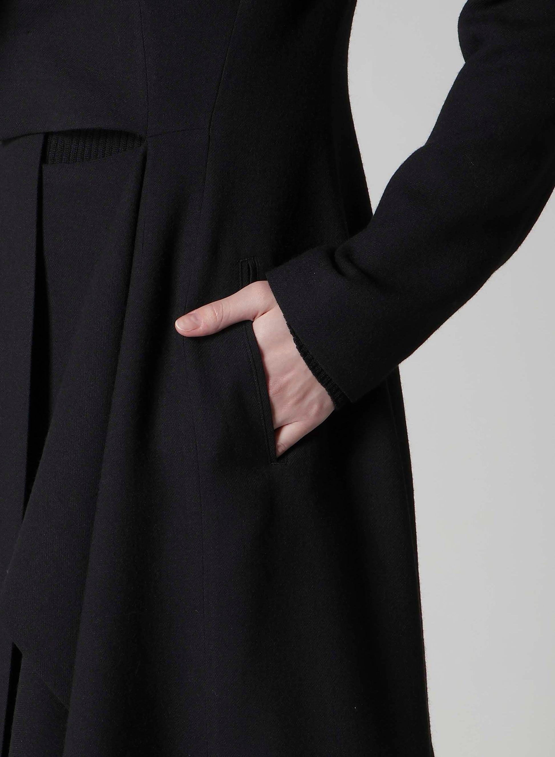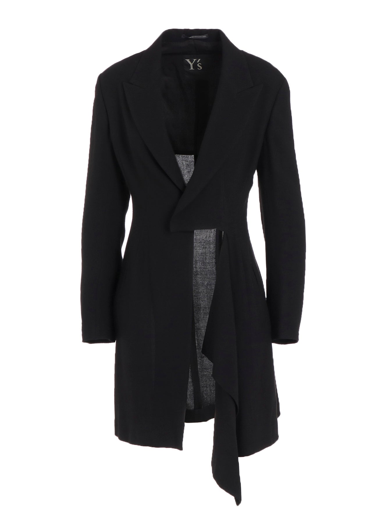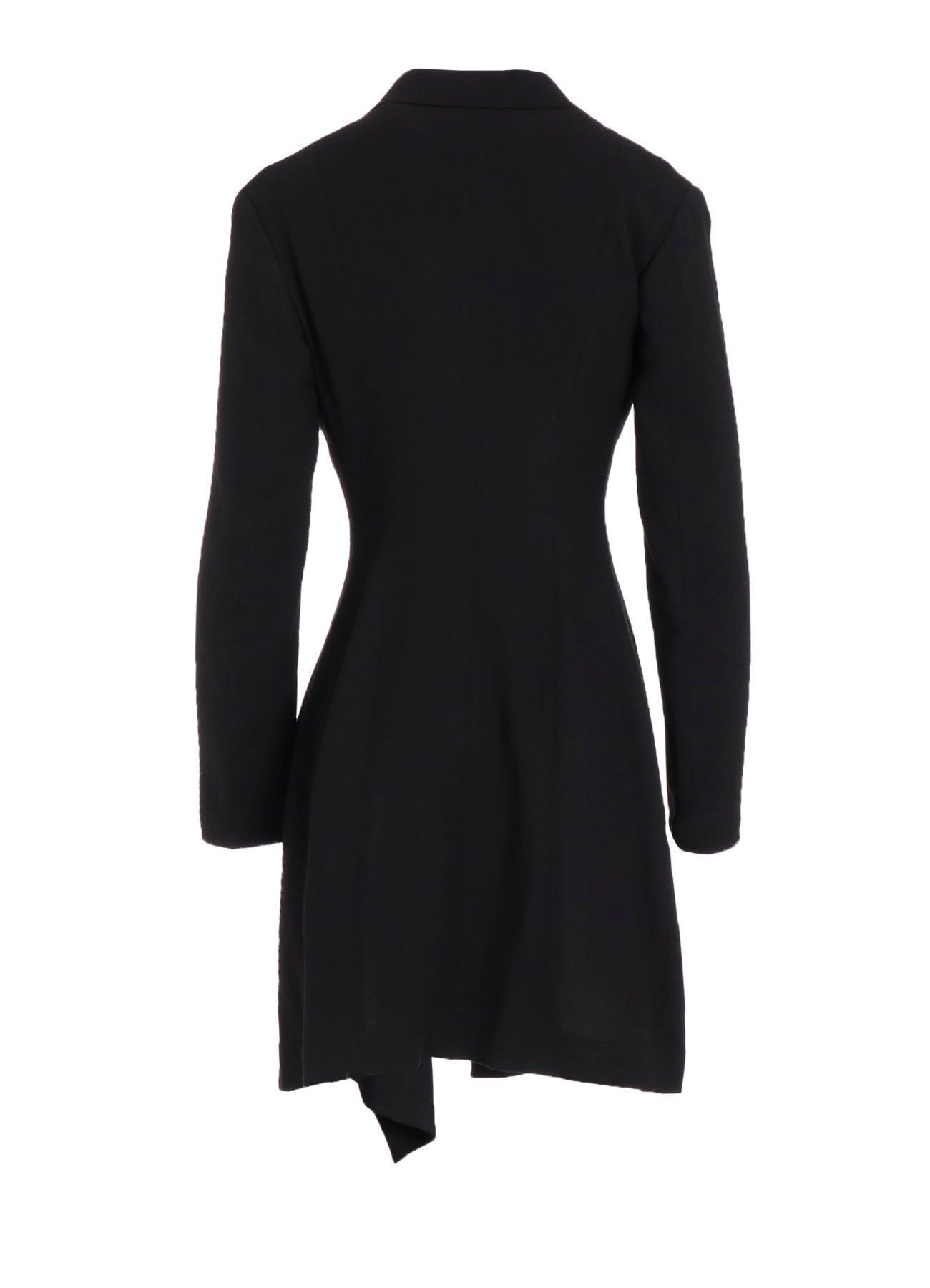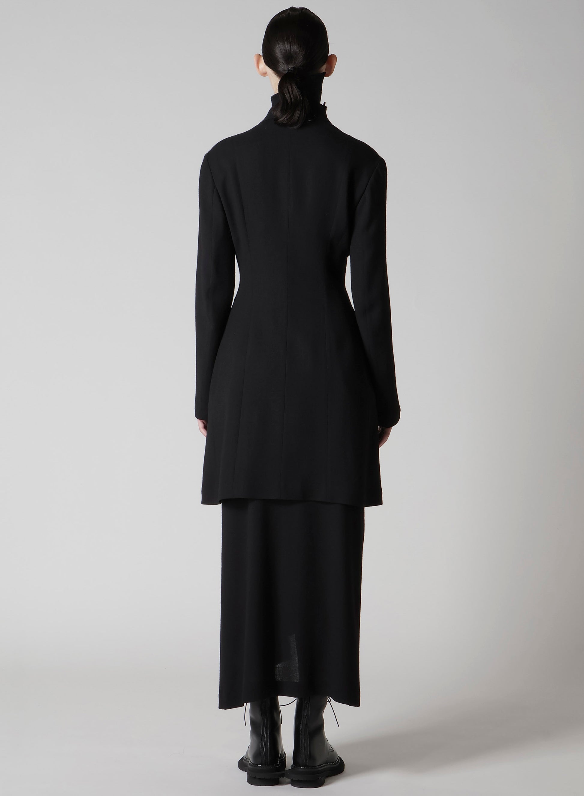 This jacket features a draped design, using wool-rayon gauze with a washer finish for a soft and subtly crisp texture. The fabric's drapery and front cut create a dynamic silhouette. Can be paired with a skirt in the same material for a coordinated look.