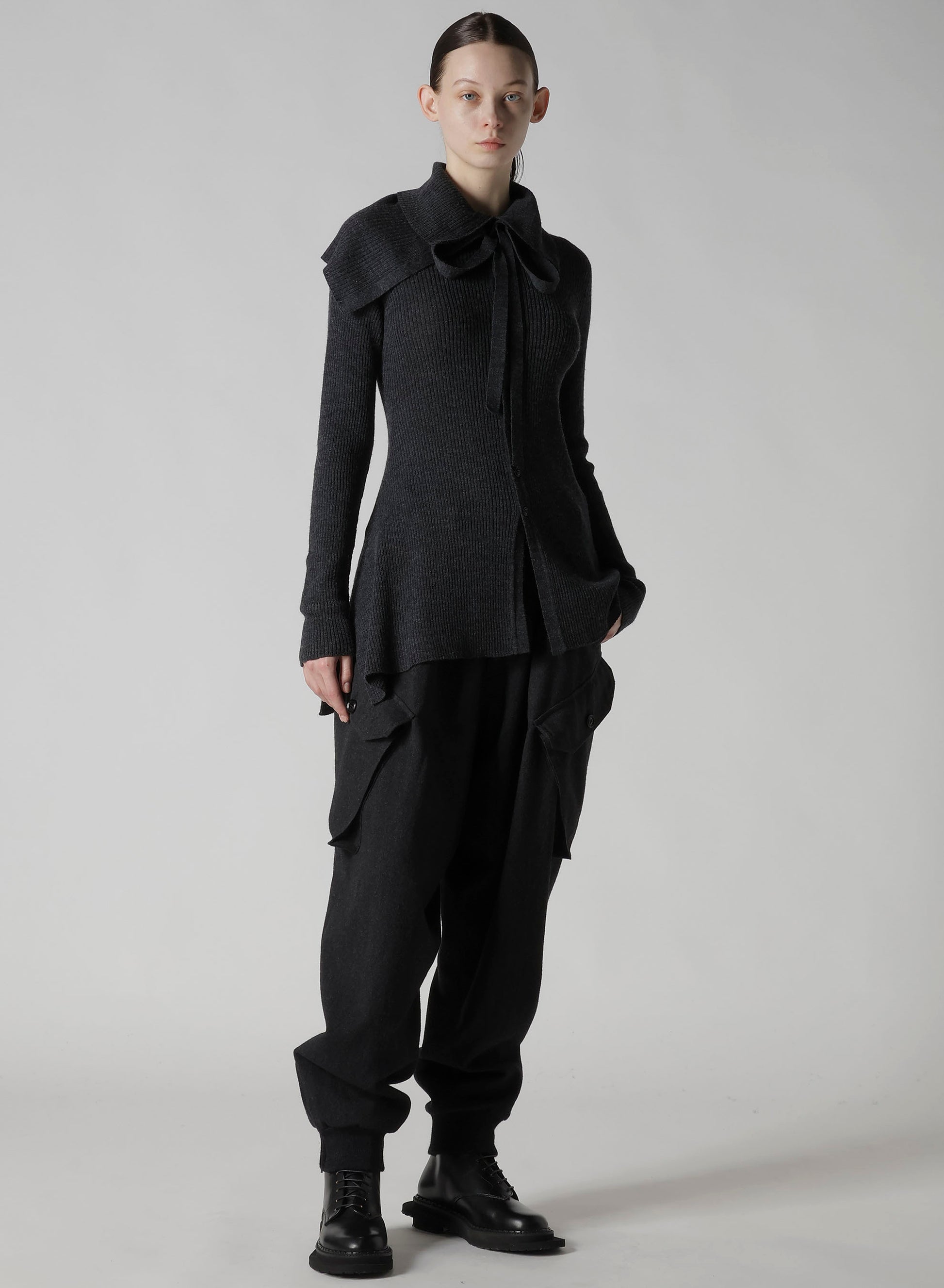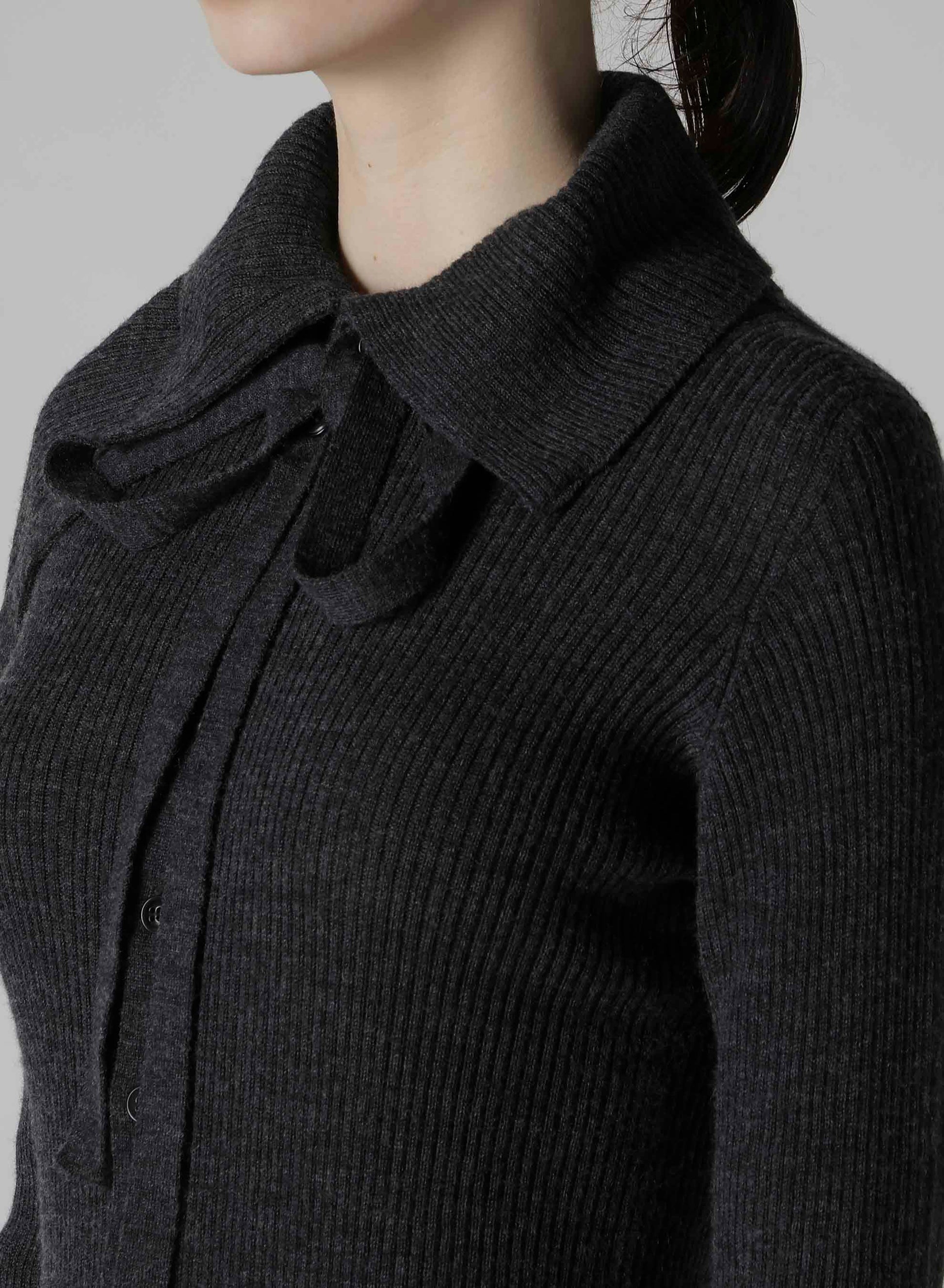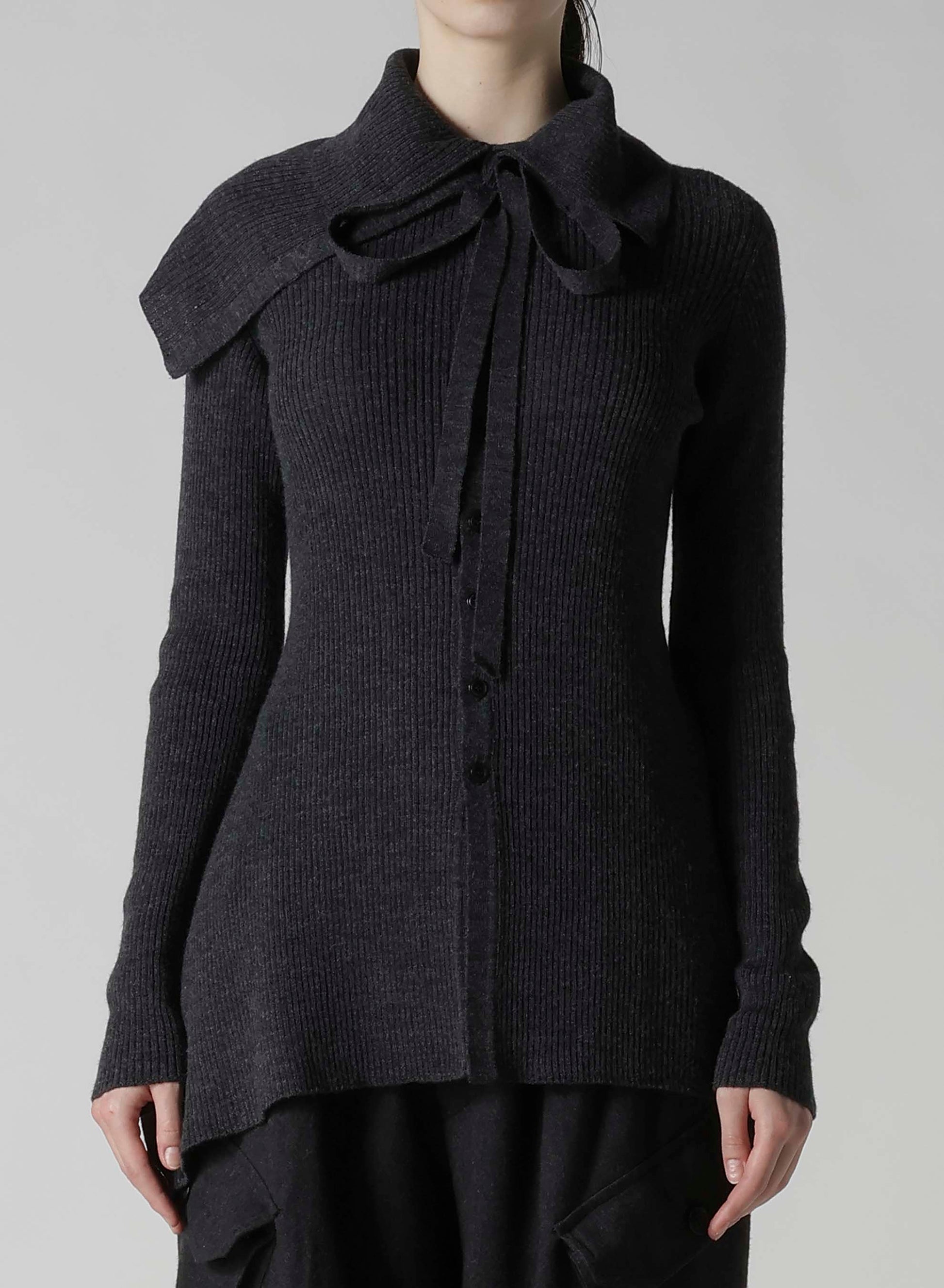 A cardigan featuring a striking design with dual collars layered and a slit section transformed into a flared effect. Except for the collar and Front Placket, it's crafted using "WHOLEGARMENT" technology, ensuring comfort and a perfect silhouette. The long Front Placket can be styled as a bow tie. Made from shiny, stretchy wool.