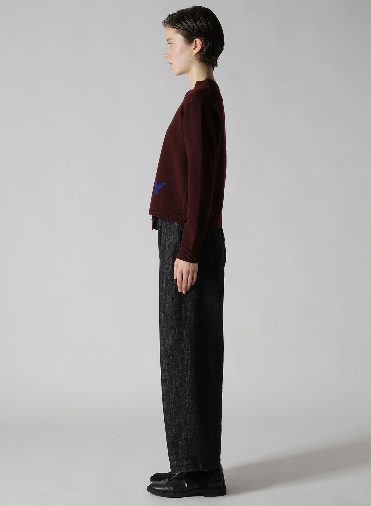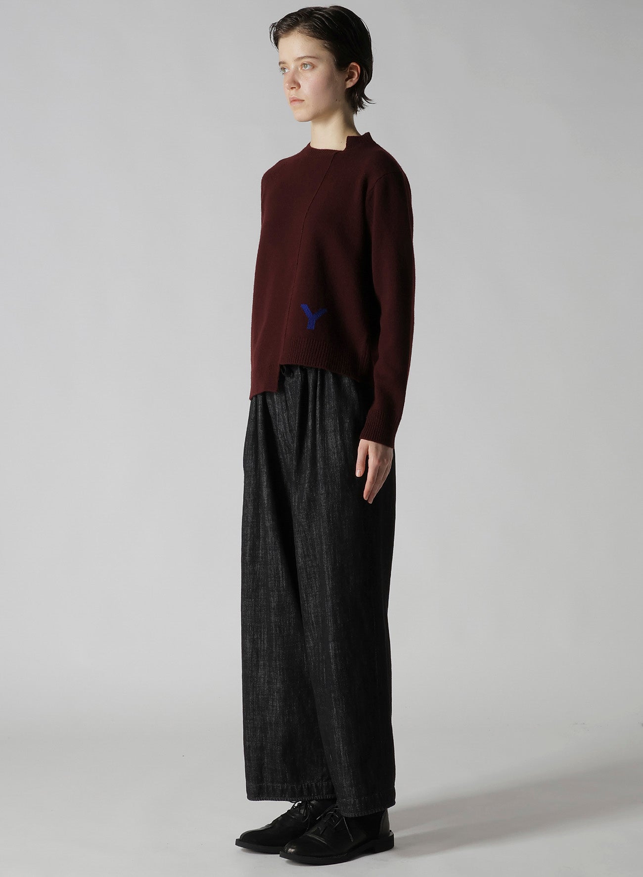 This crewneck knit features a stepped design with a "Y" logo as an accent. Its clean-cut size and sleek silhouette make it effortlessly pairable with any pants, adding versatility to your outfits.