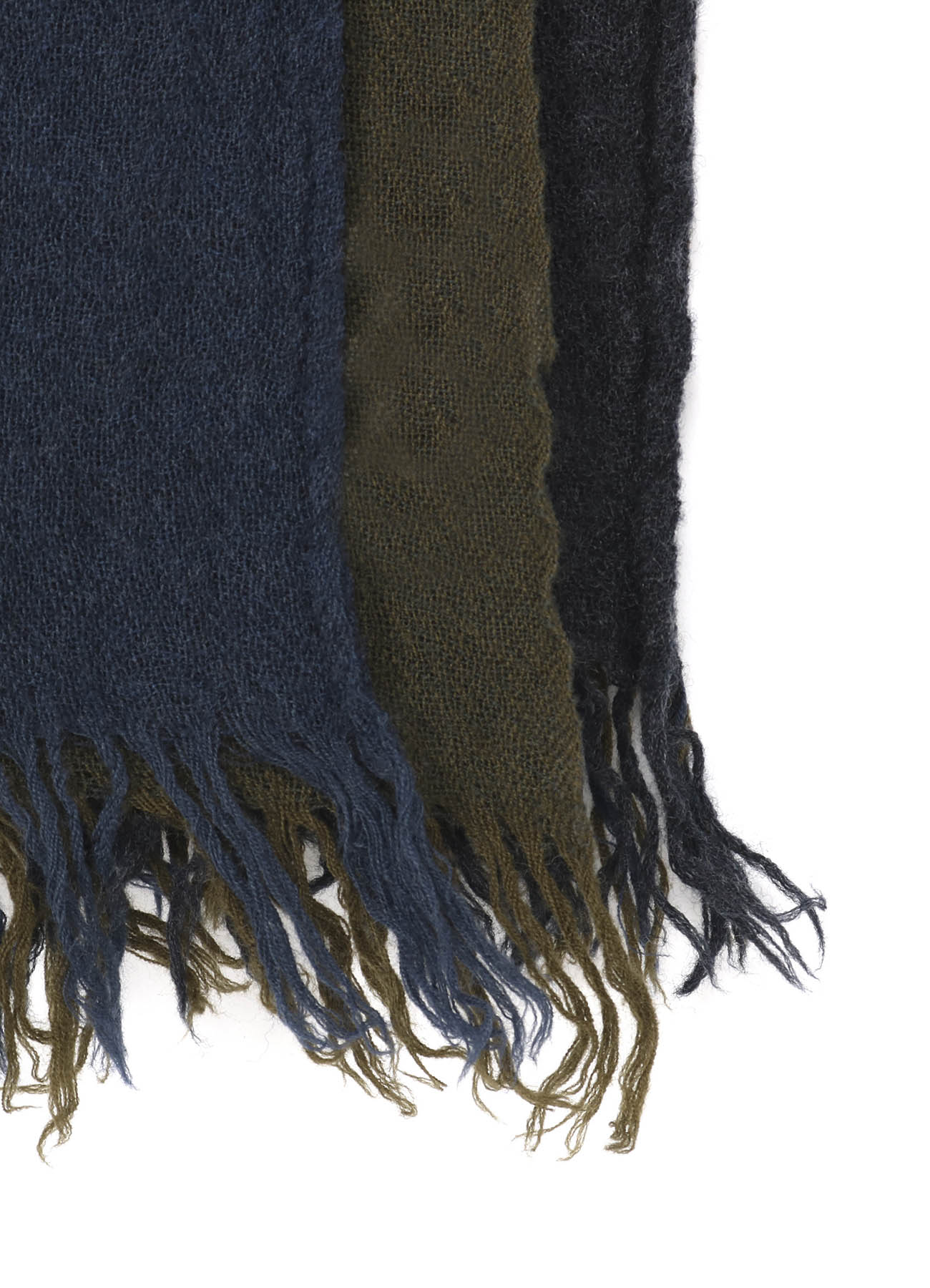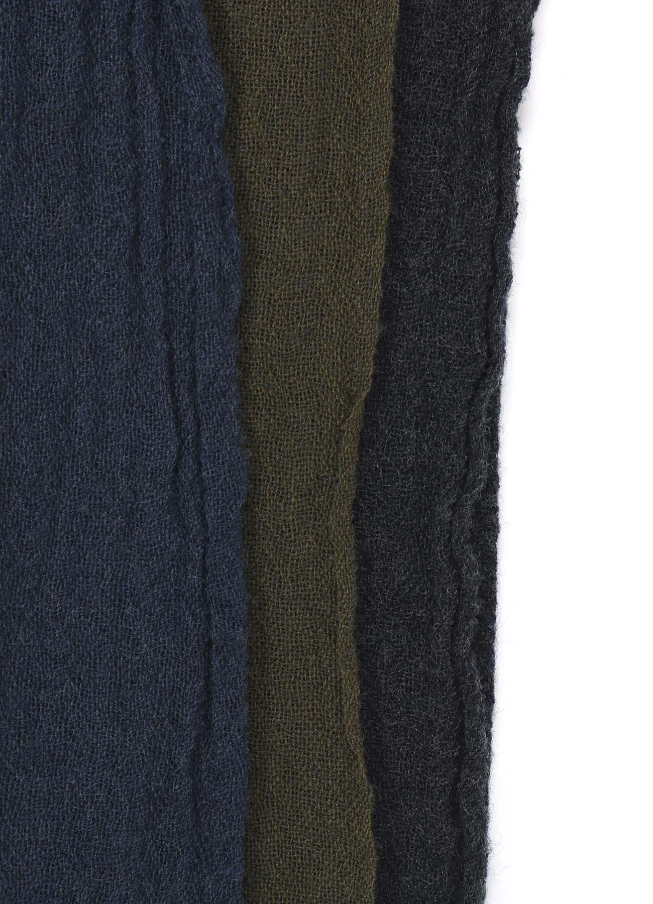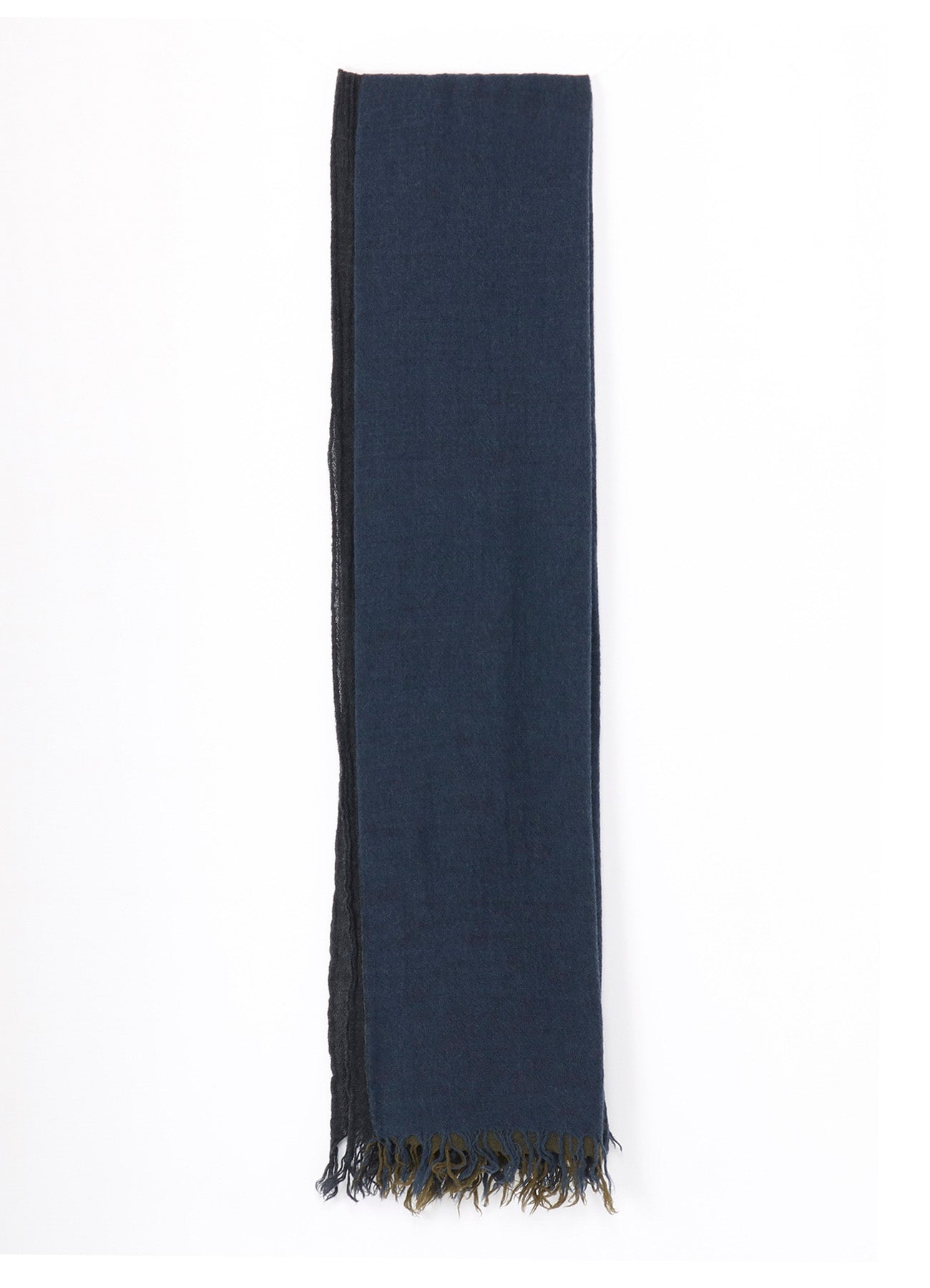 This 3-panel wool stole combines multiple colors, allowing you to vary its appearance by how you wear it. Due to the material's nature, be cautious of friction or snags that may cause pulling or fraying.