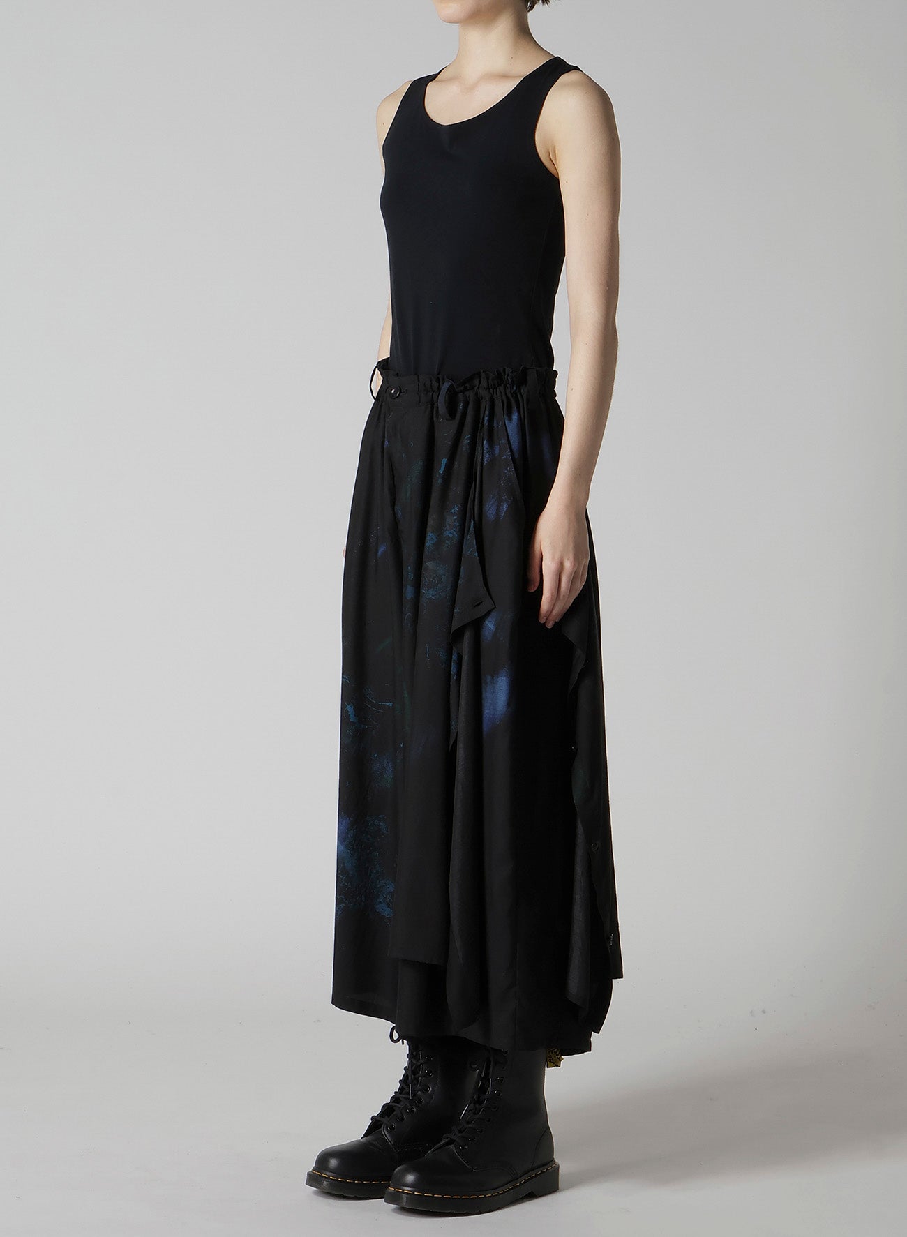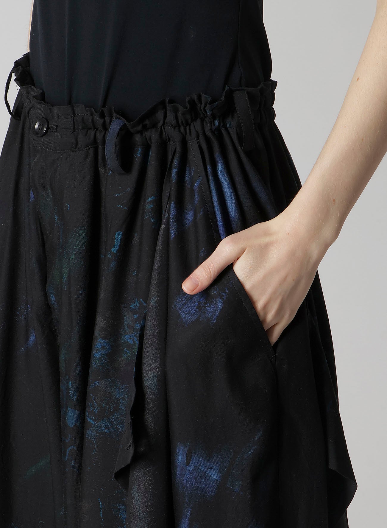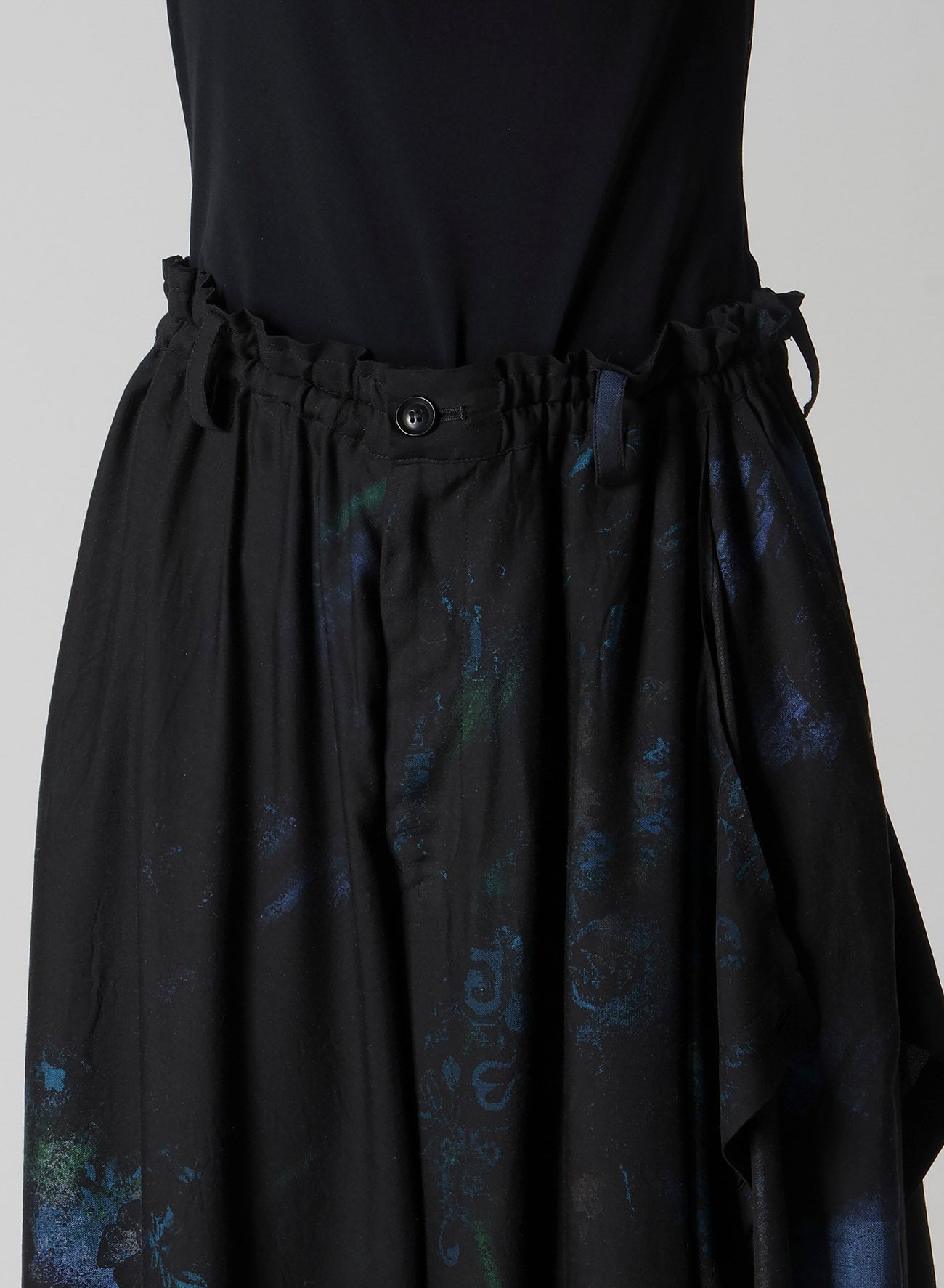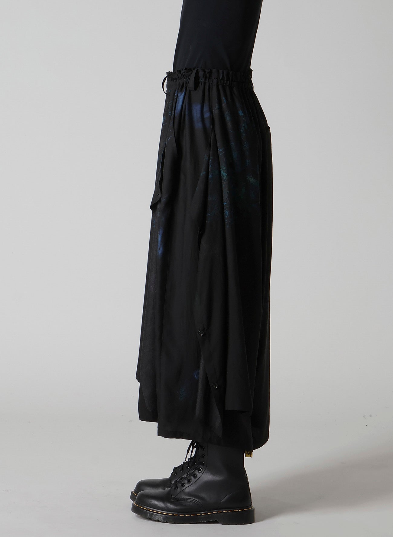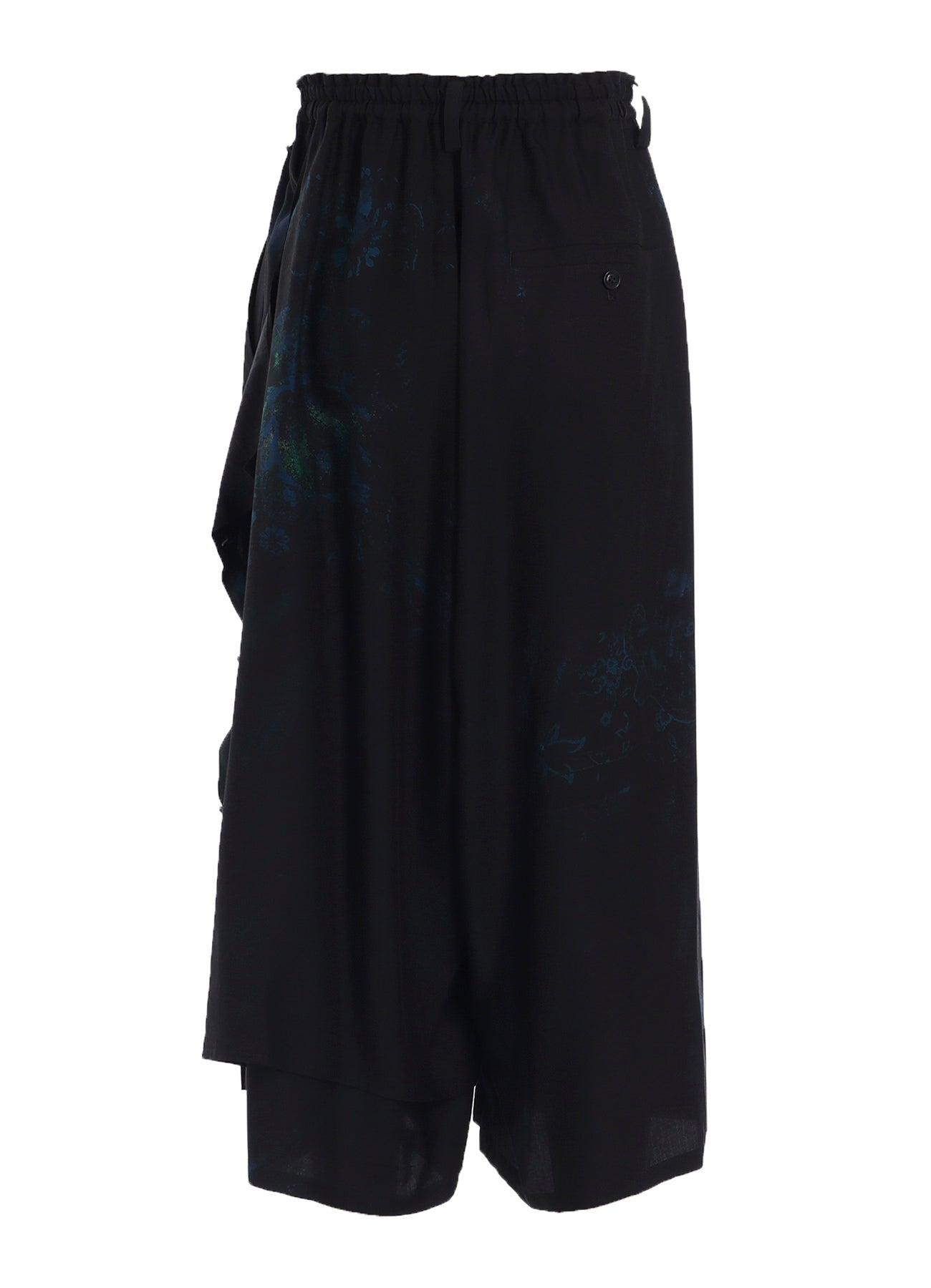 Elegant floral and lace patterned flared pants feature a striking drape along the left side, enhanced by silky cupro fabric. The drape, equipped with buttons, allows styling versatility, while the adjustable waist with elastic and drawstring ensures a customized fit.