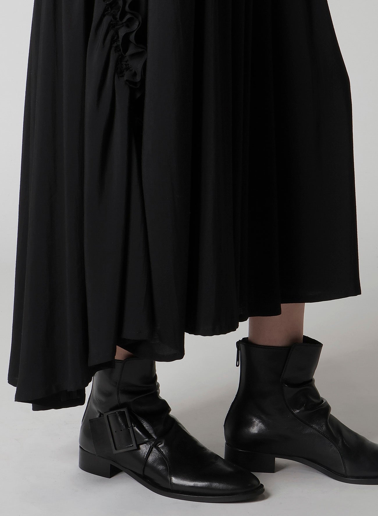 "This skirt features front and back design gathers, made from drapery cupro and rayon fabric. It’s dyed jet black using a circular dyeing machine and air-dried for a natural finish. The silhouette is clean around the waist with volume towards the hem, adjustable with a drawstring, enhancing movement.