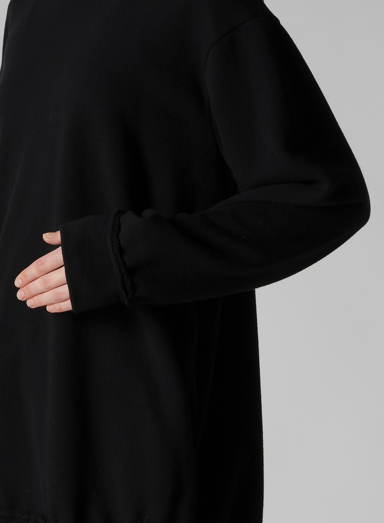 This long-length hoodie features wide ribs that cinch the sides, with a fleece fabric and raw edges for a casual feel. Soft and drapey, it maintains a refined look. It has a relaxed shoulder line and one pocket on the left side.