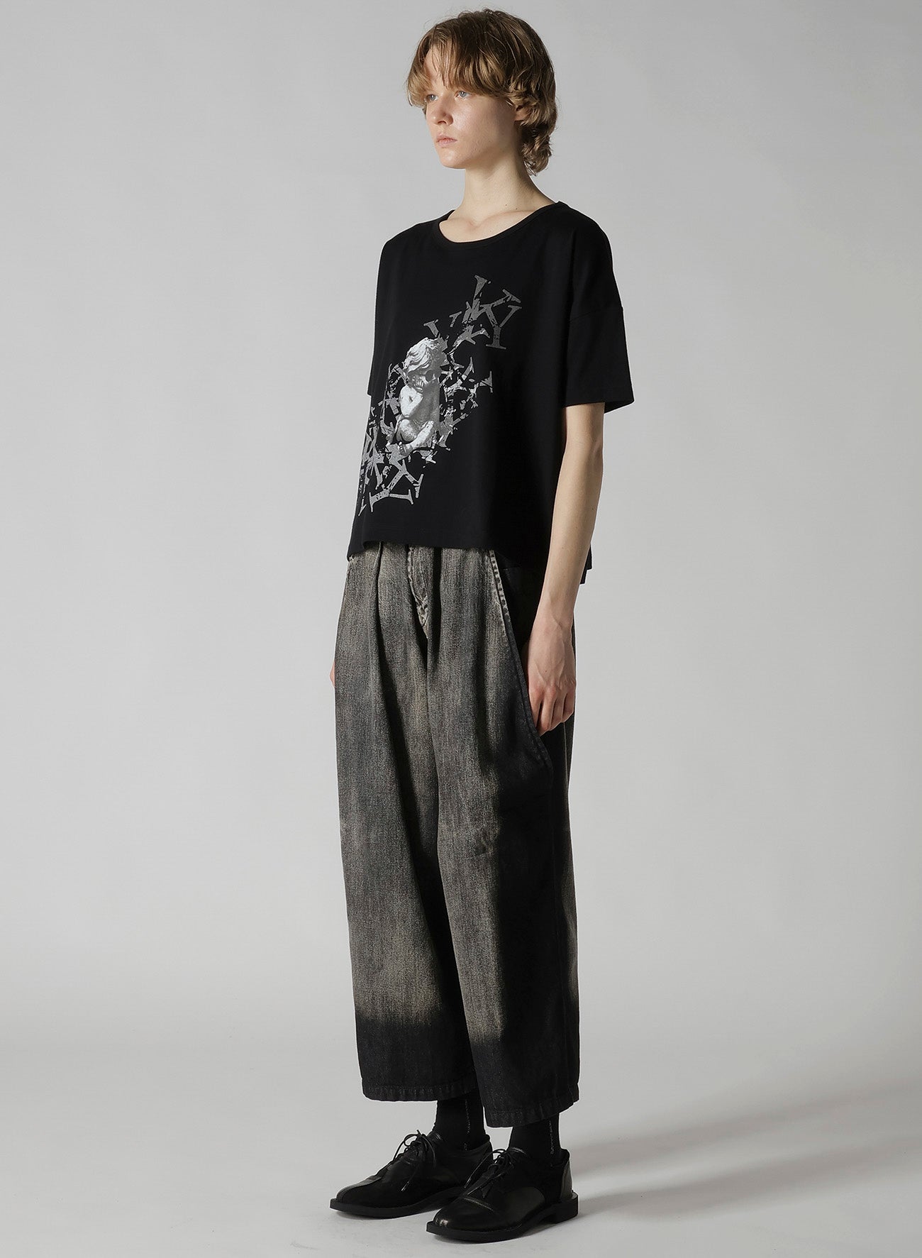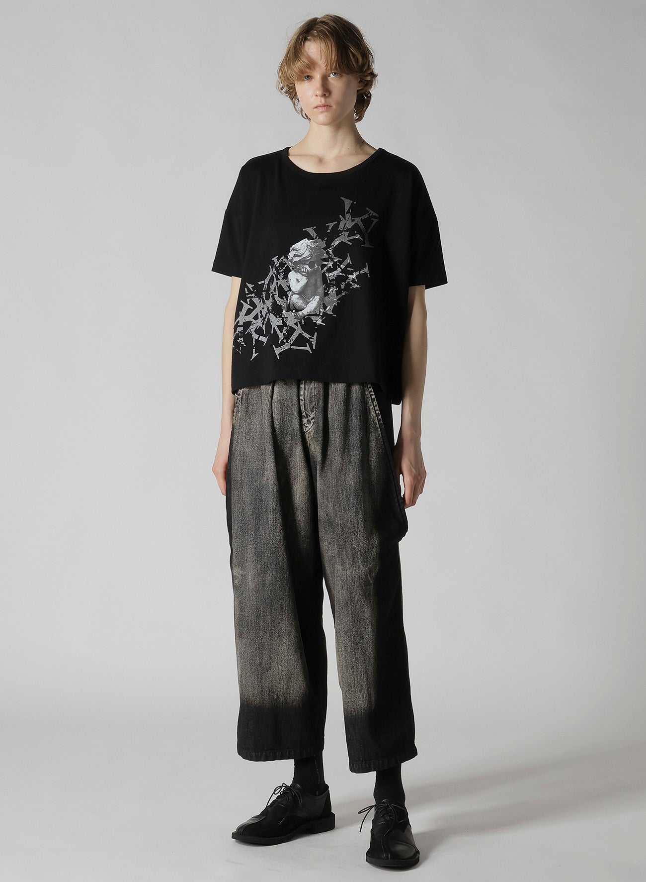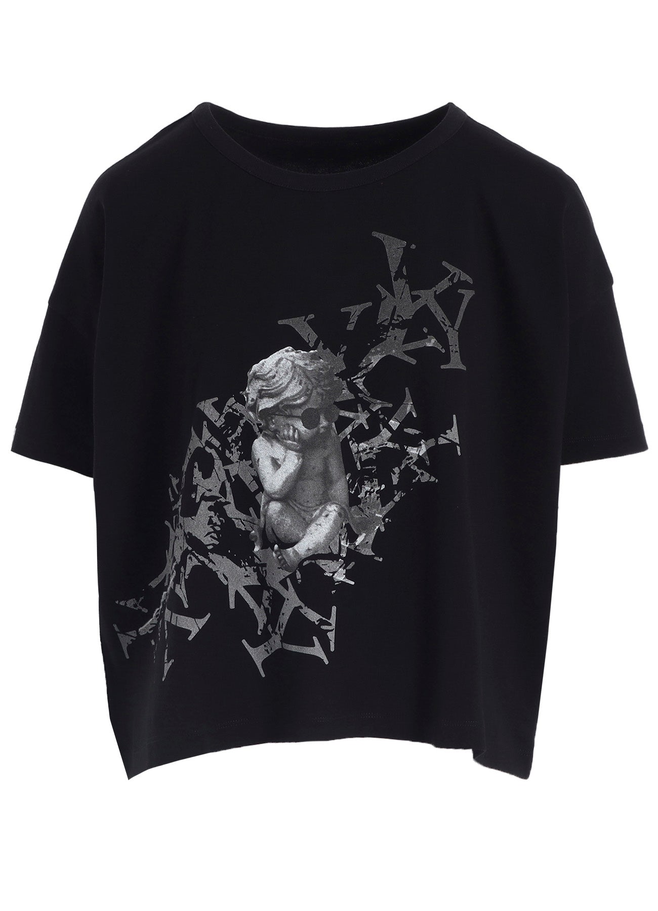 This top features a whimsical, discord-inspired print of a sulking angel perched on a fragmented 'Y'. The garment is made from a smooth fabric that offers comfort and a gentle touch. Its relaxed fit and shorter length make it easy to pair with any pants, becoming a versatile piece for any outfit.