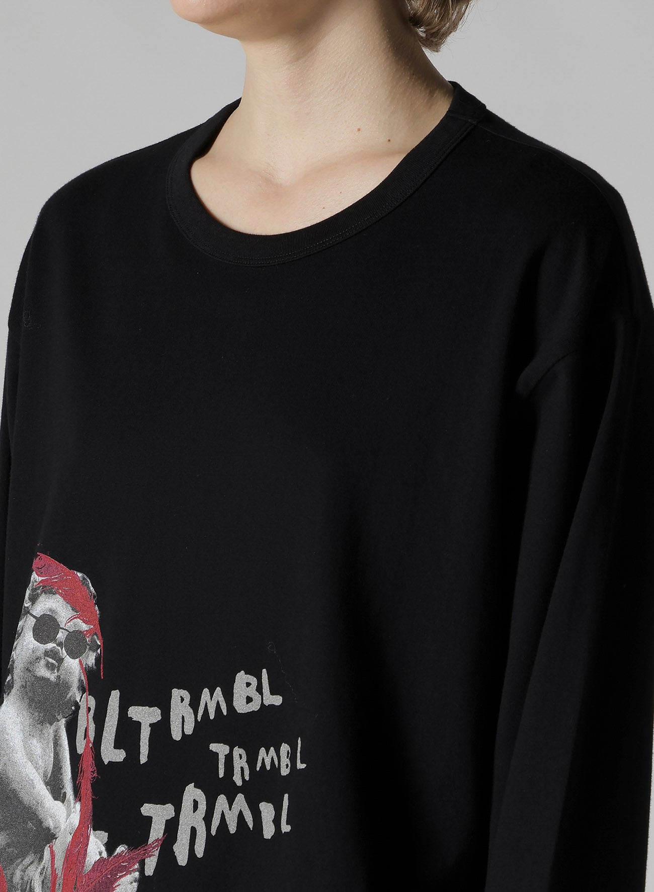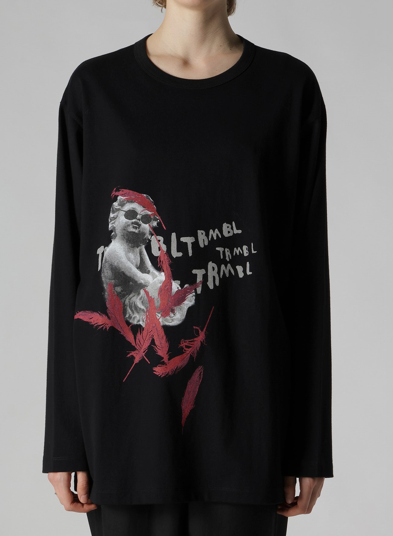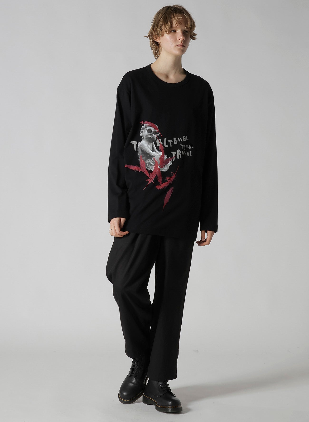 This angel-printed top features a soft texture and comfortable fit. The design incorporates English onomatopoeia behind the angel. With a relaxed size, it's recommended for all genders.