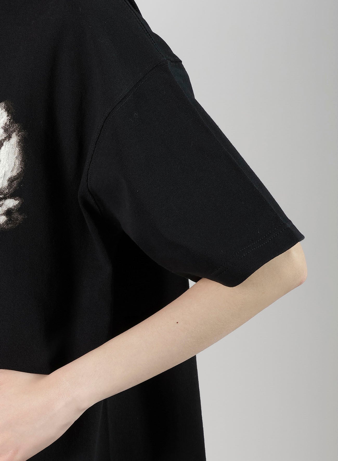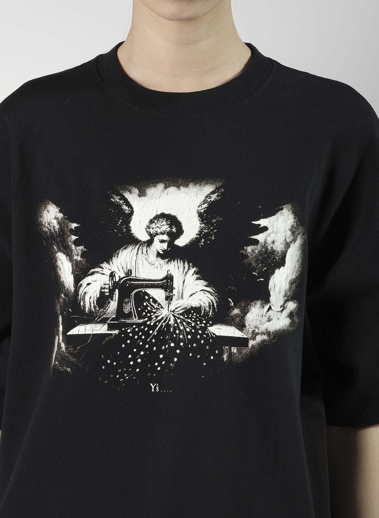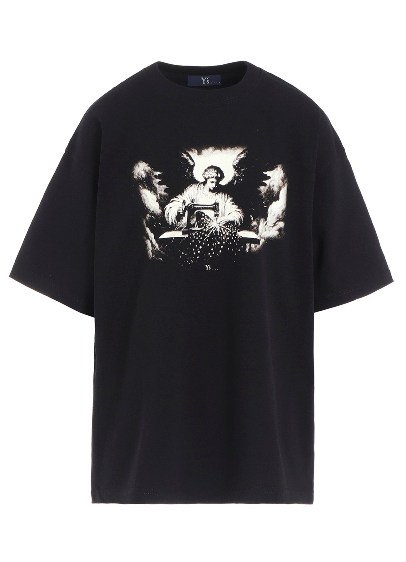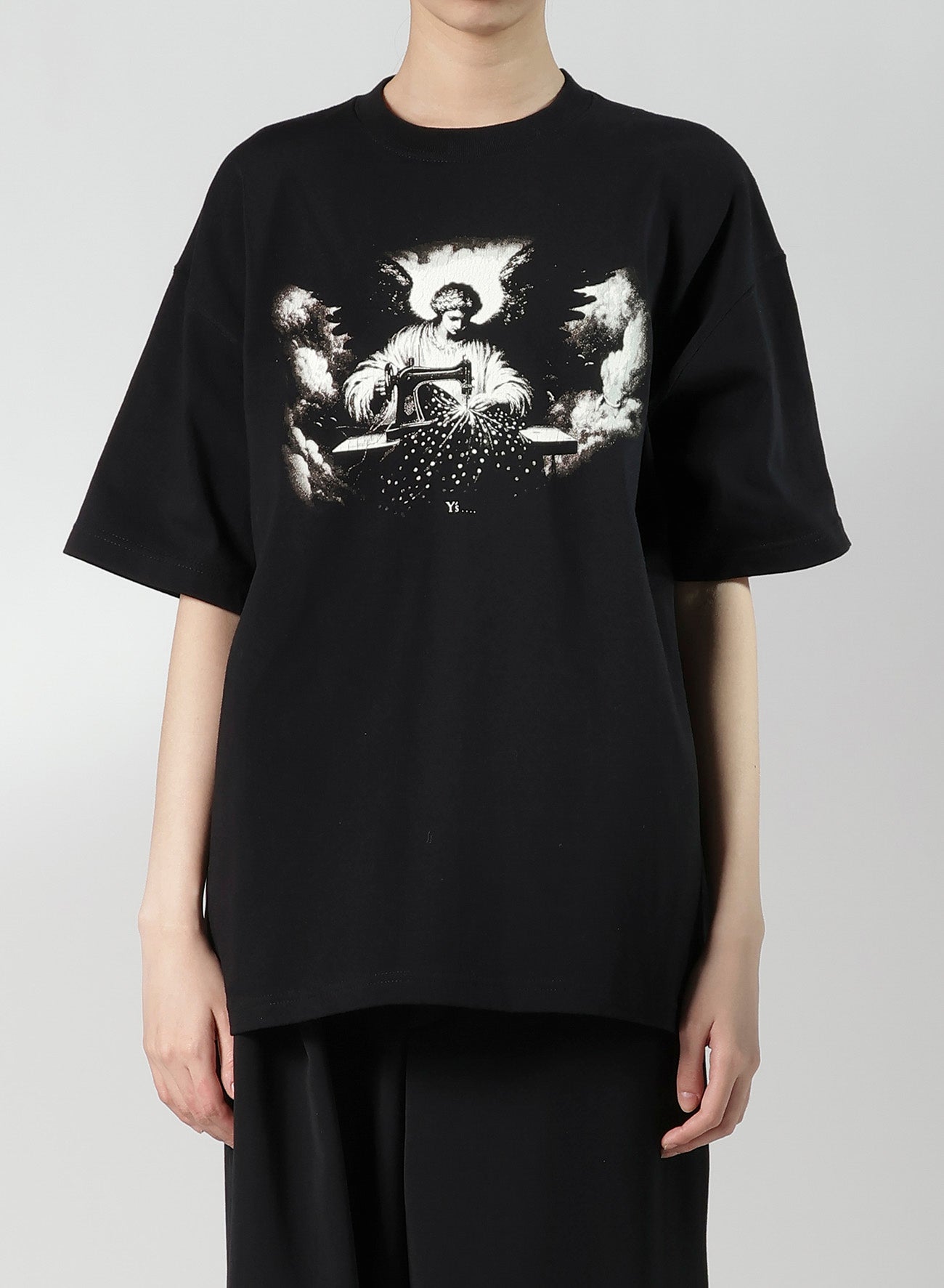 A short-sleeve top featuring an angel motif applied with pigment print. The oversized silhouette is designed for a unisex fit, accommodating various body types comfortably.