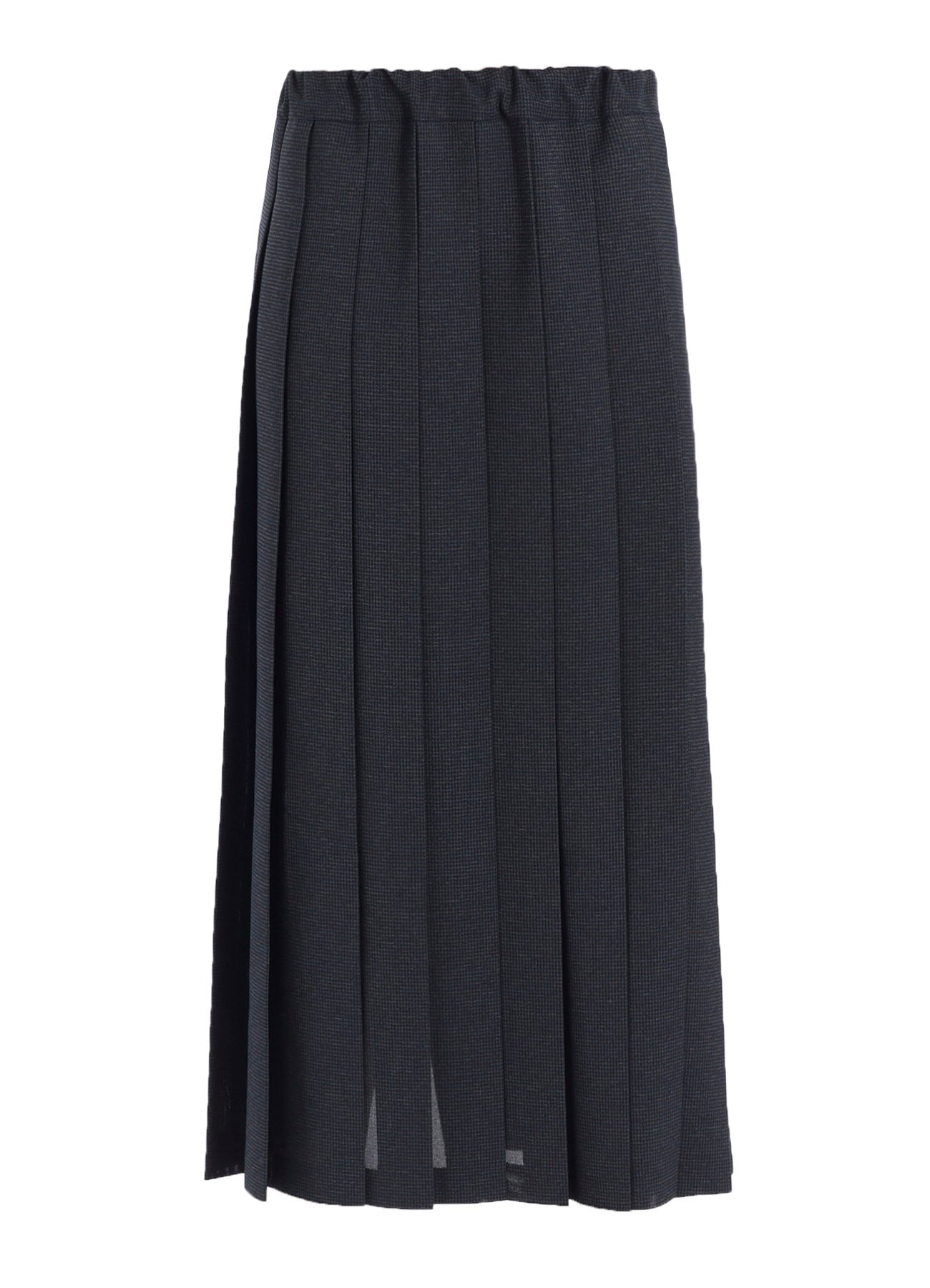 This houndstooth waist-elastic apron long pleated skirt is made using the Karami weaving technique, combining threads to create a mesh-like open texture. The fabric offers a sheer look, perfect for layering over pants or another skirt for a distinctive style.