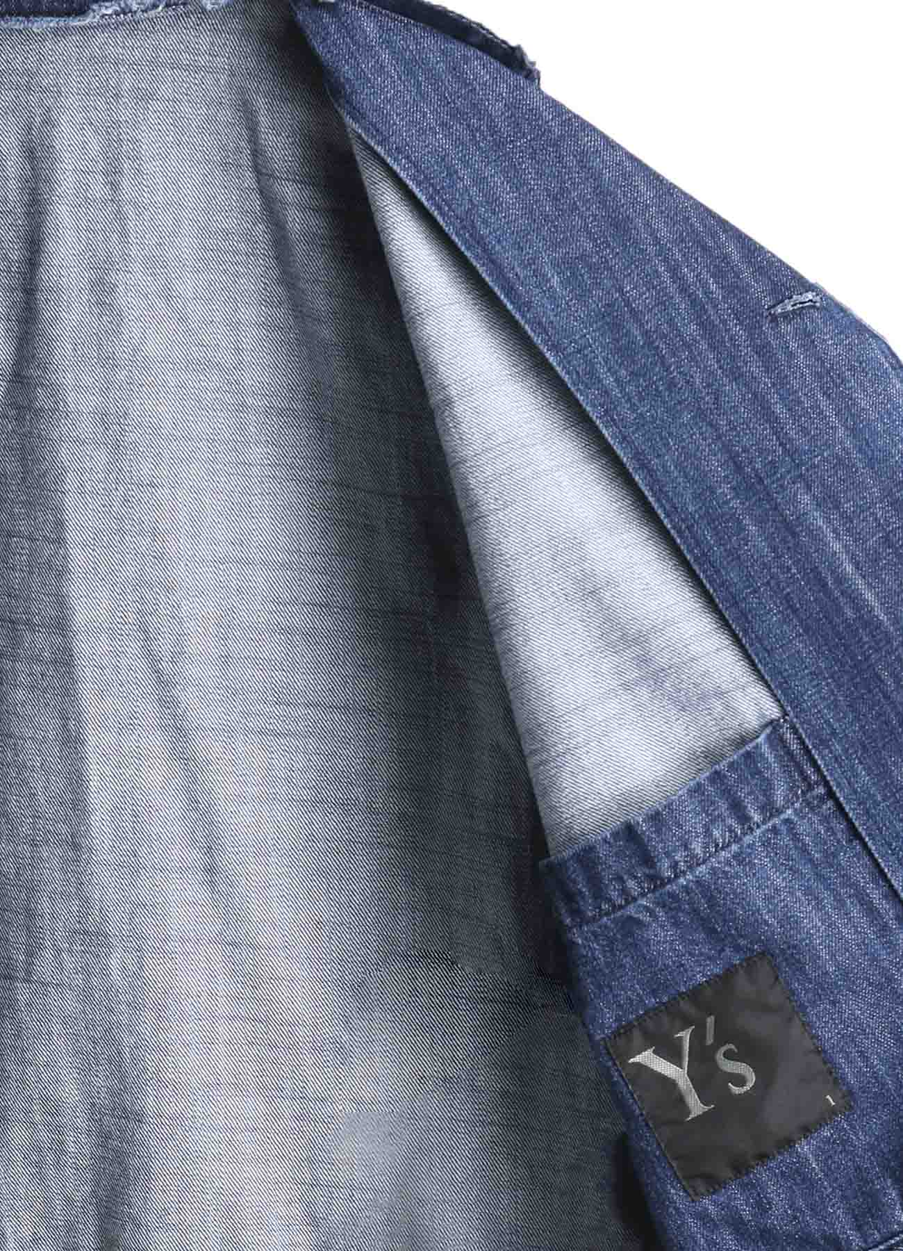 This short blouson is noted for its soft texture, with a distinct Y's design featuring removable collar and waist belt. The material undergoes processing to enhance its texture and color fading. As a denim product, it may bleed color; wash separately. Each item will have unique color and texture variations.