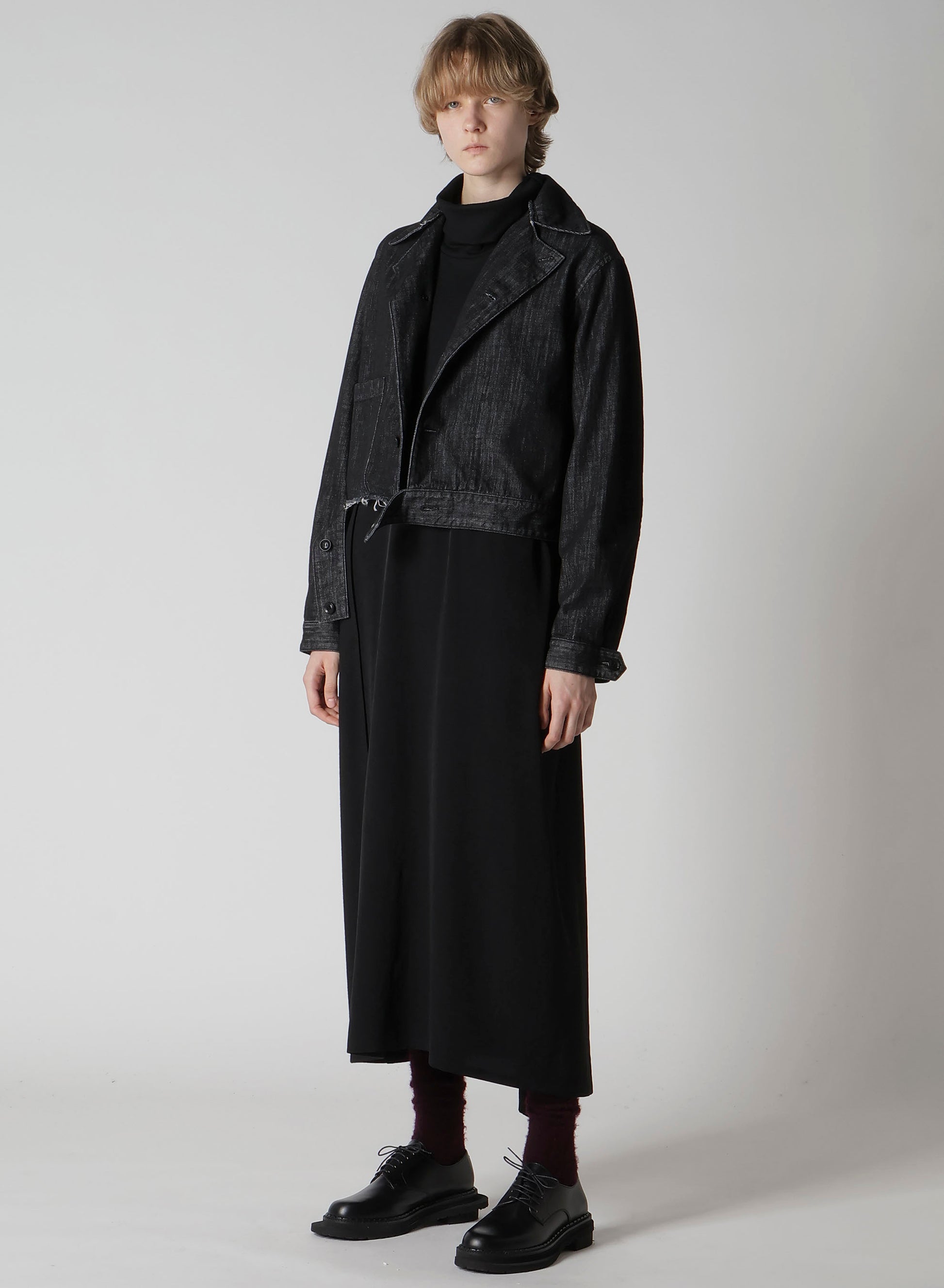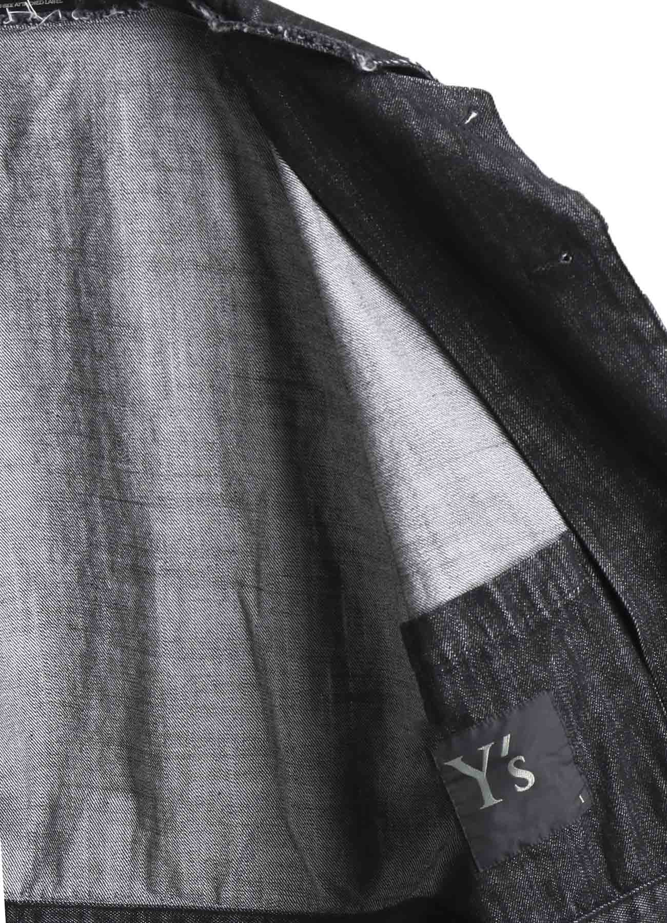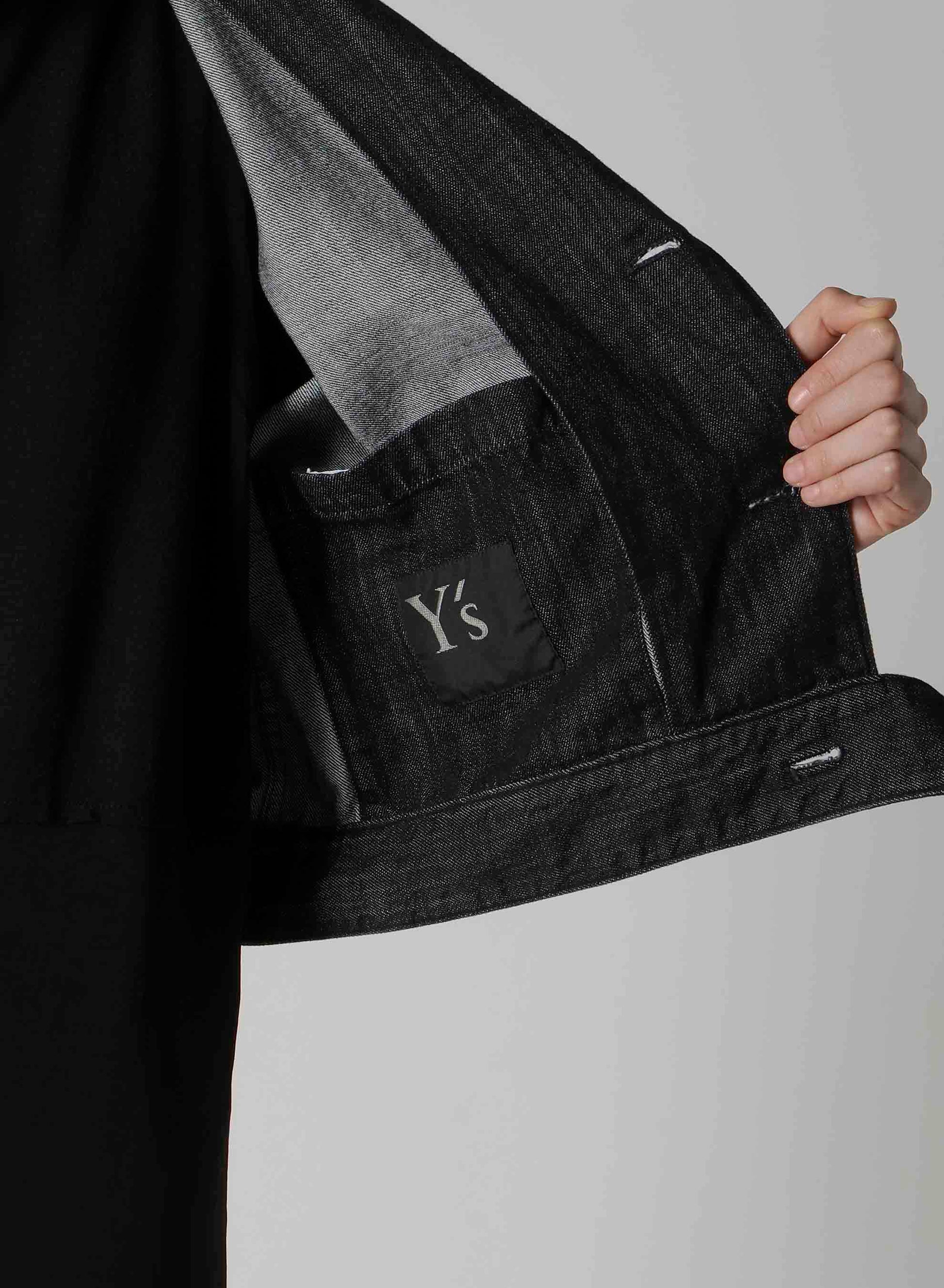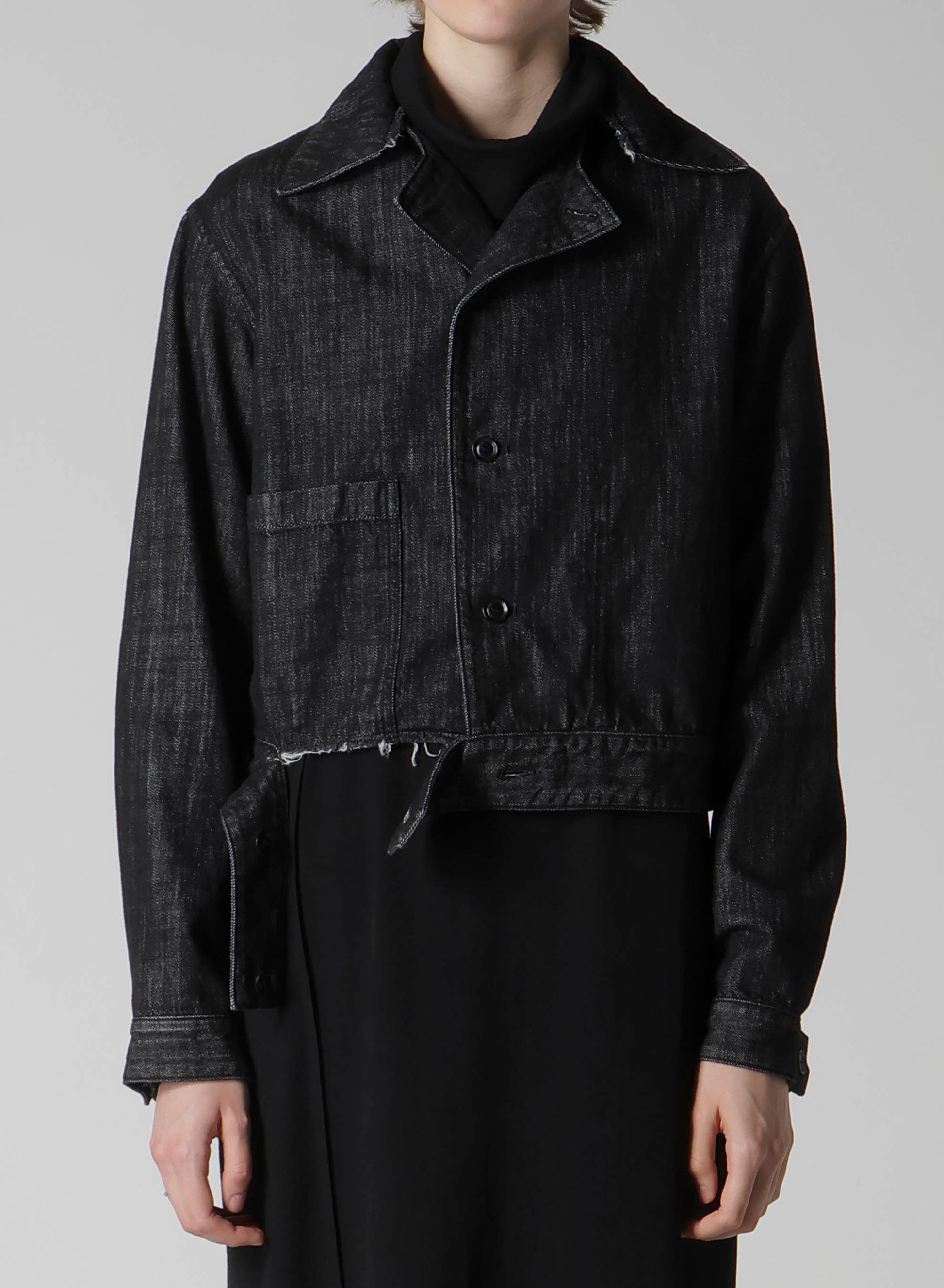 This short blouson is noted for its soft texture, with a distinct Y's design featuring removable collar and waist belt. The material undergoes processing to enhance its texture and color fading. As a denim product, it may bleed color; wash separately. Each item will have unique color and texture variations.