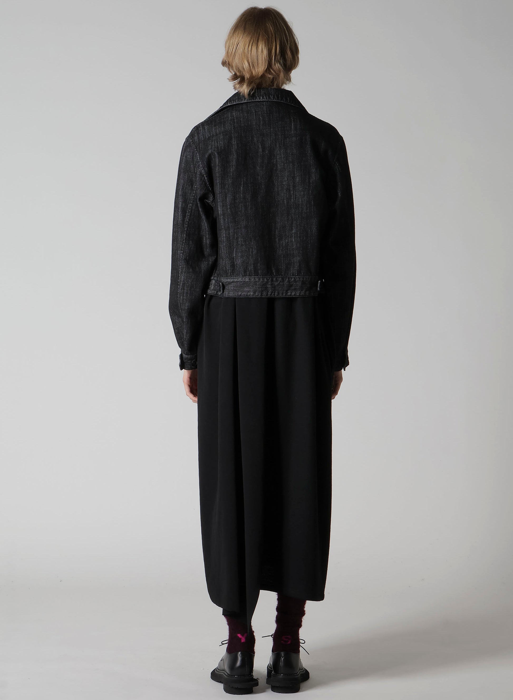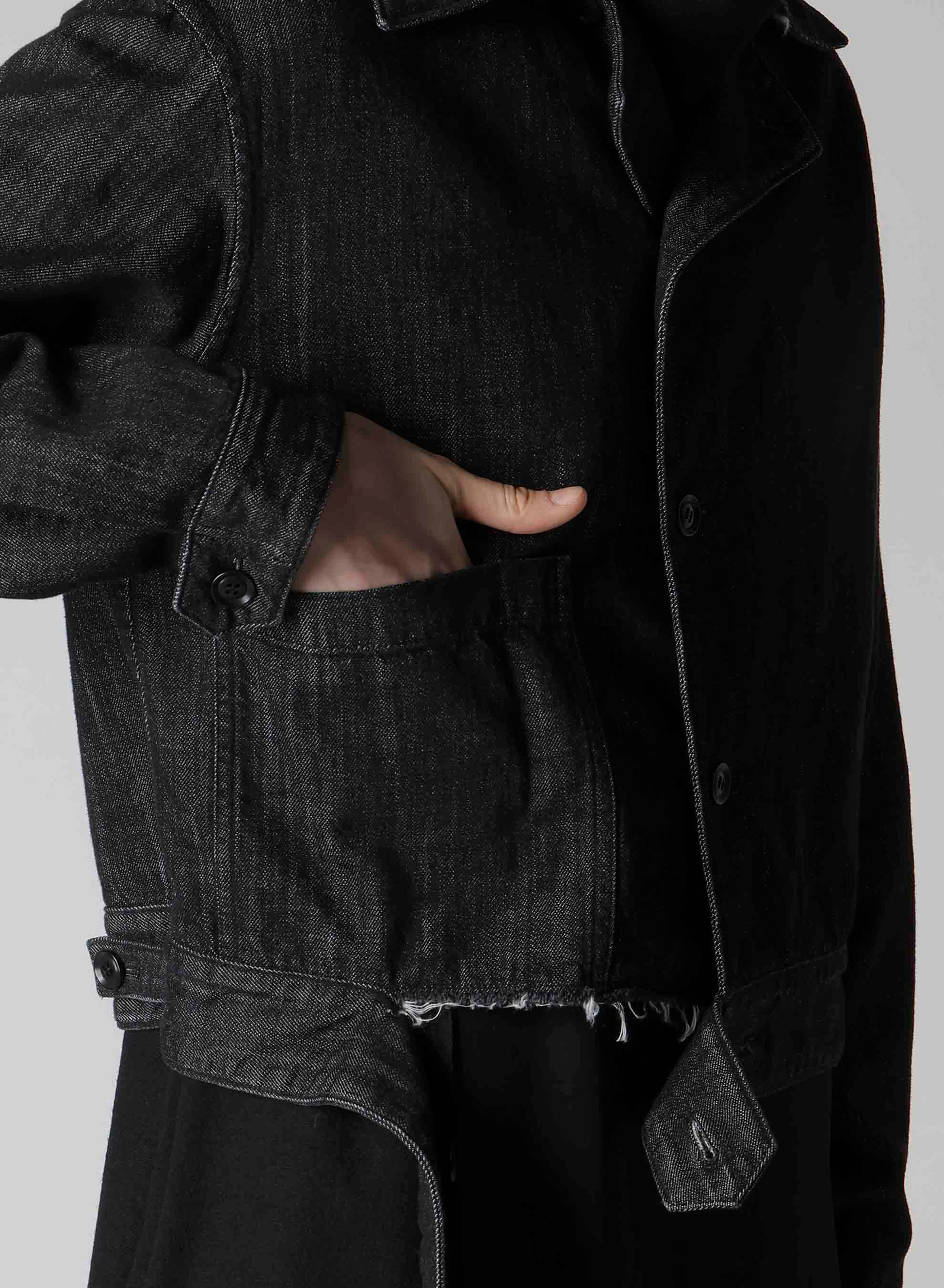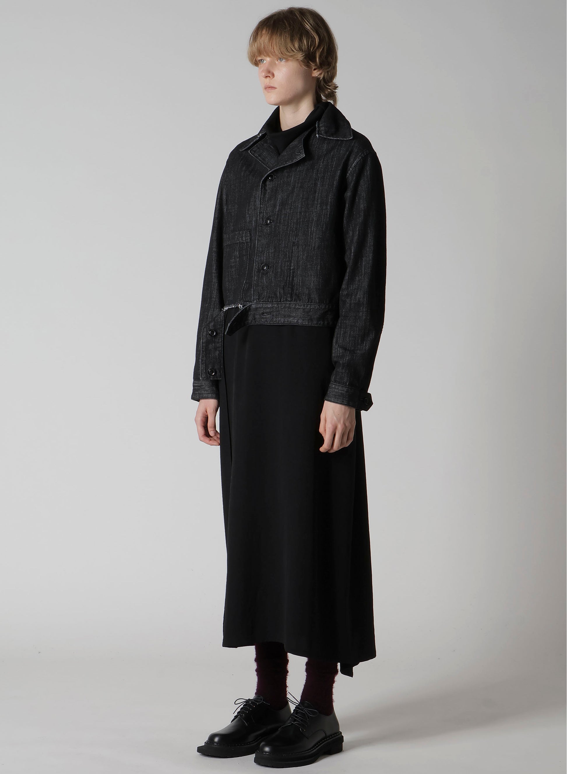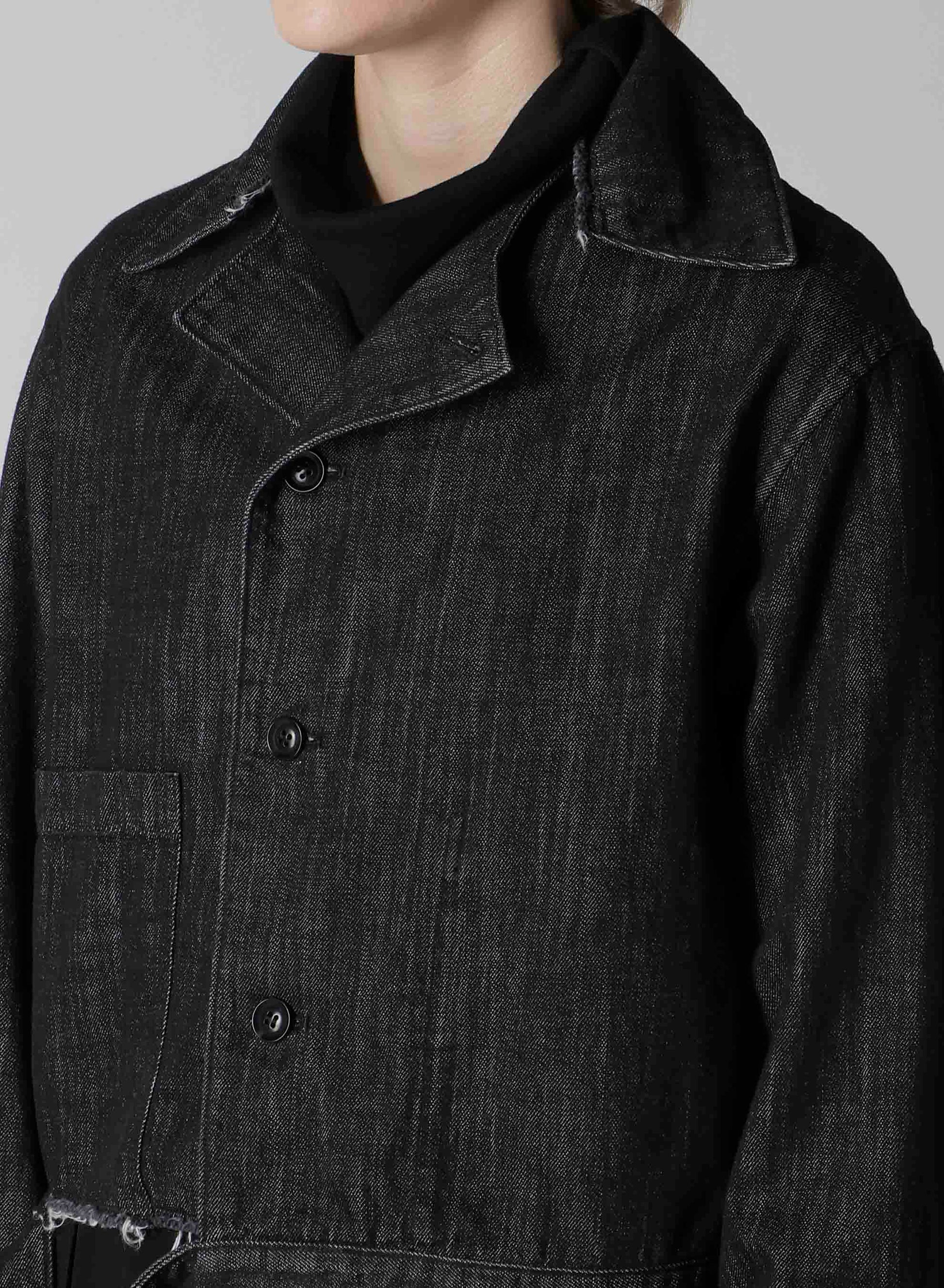 This short blouson is noted for its soft texture, with a distinct Y's design featuring removable collar and waist belt. The material undergoes processing to enhance its texture and color fading. As a denim product, it may bleed color; wash separately. Each item will have unique color and texture variations.