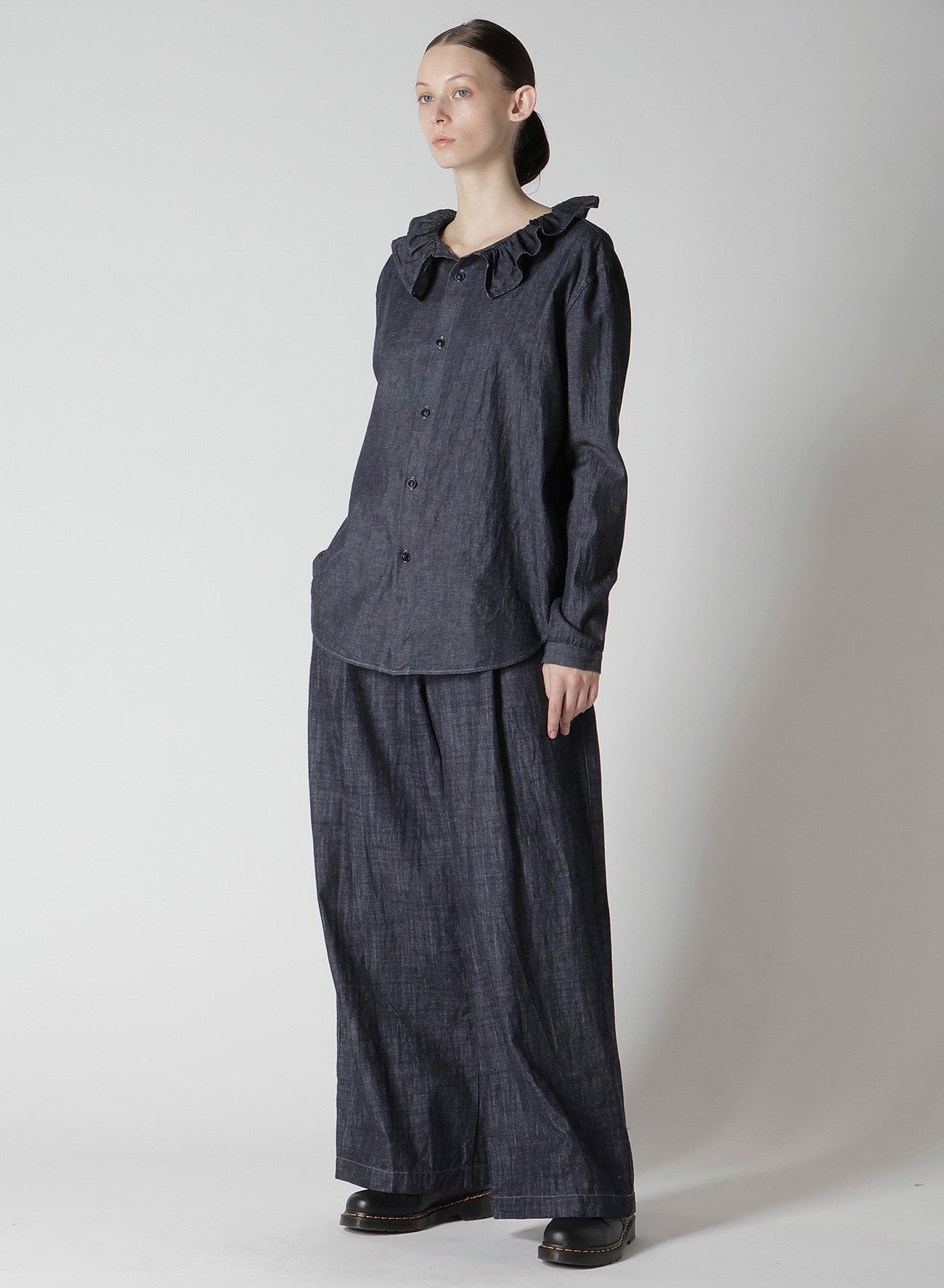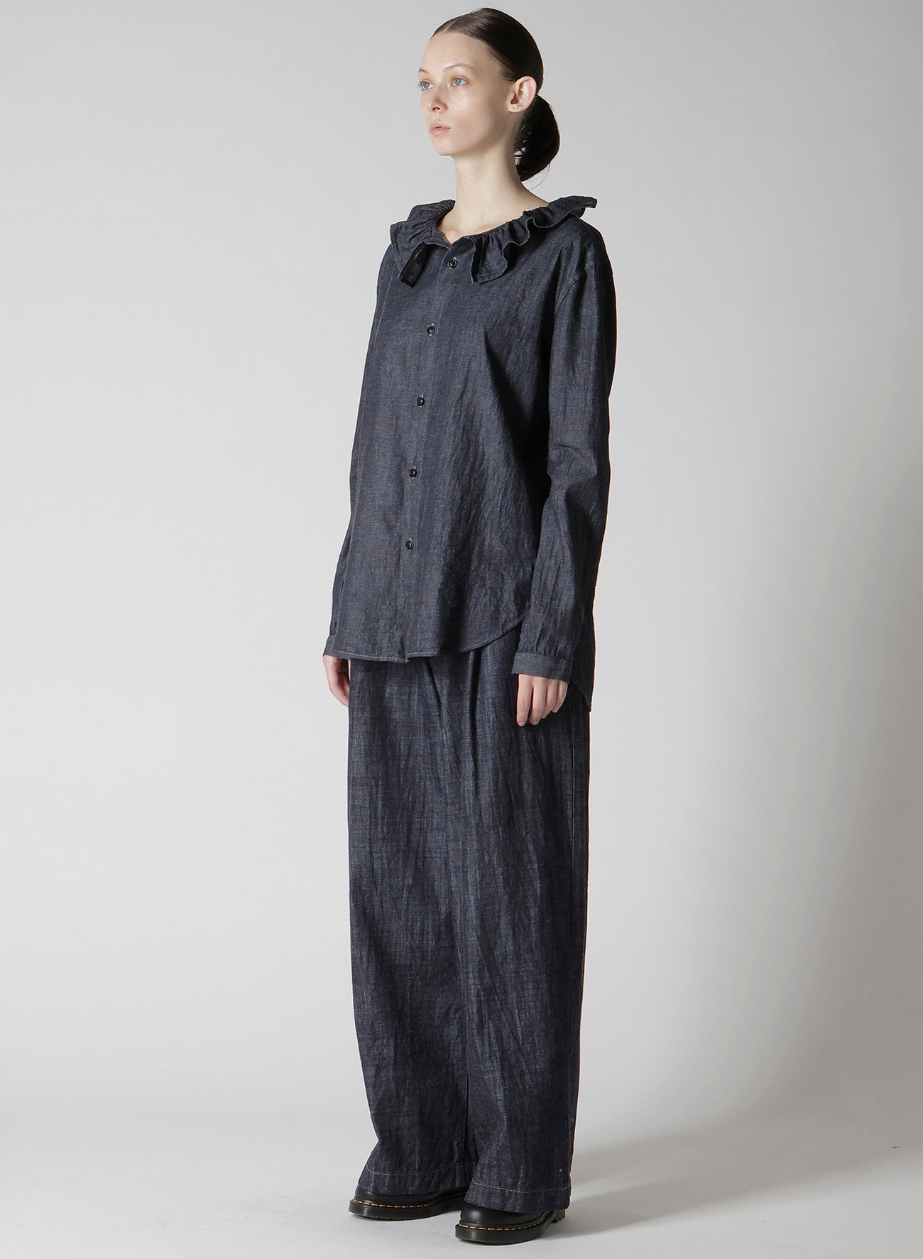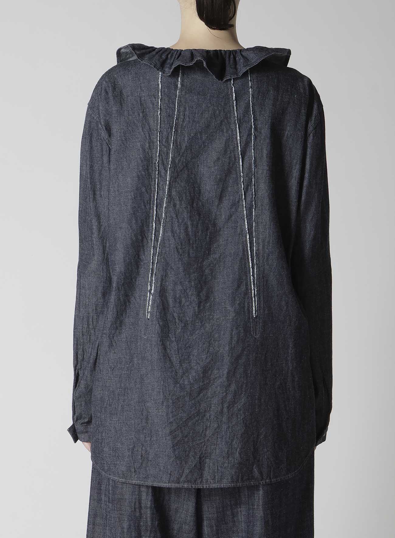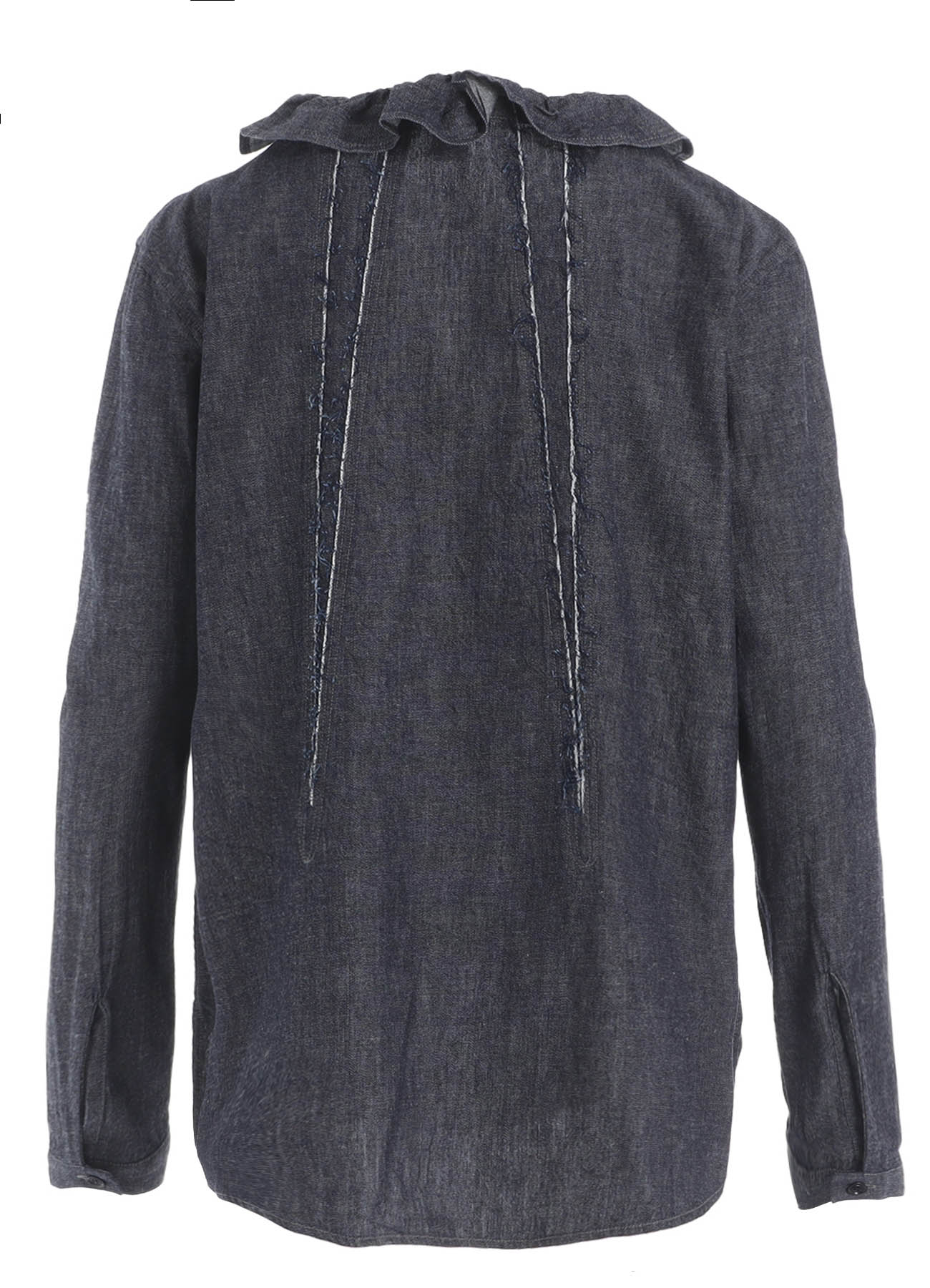 This denim blouse features a gathered collar and uses a soft, lightweight denim fabric with a loose weave. Enjoy the fabric's unique aging process due to special dyeing. The blouse is soft-washed for a comfortable feel, showing individual variations due to garment washing.