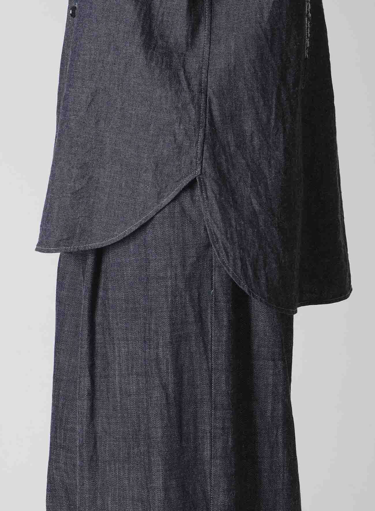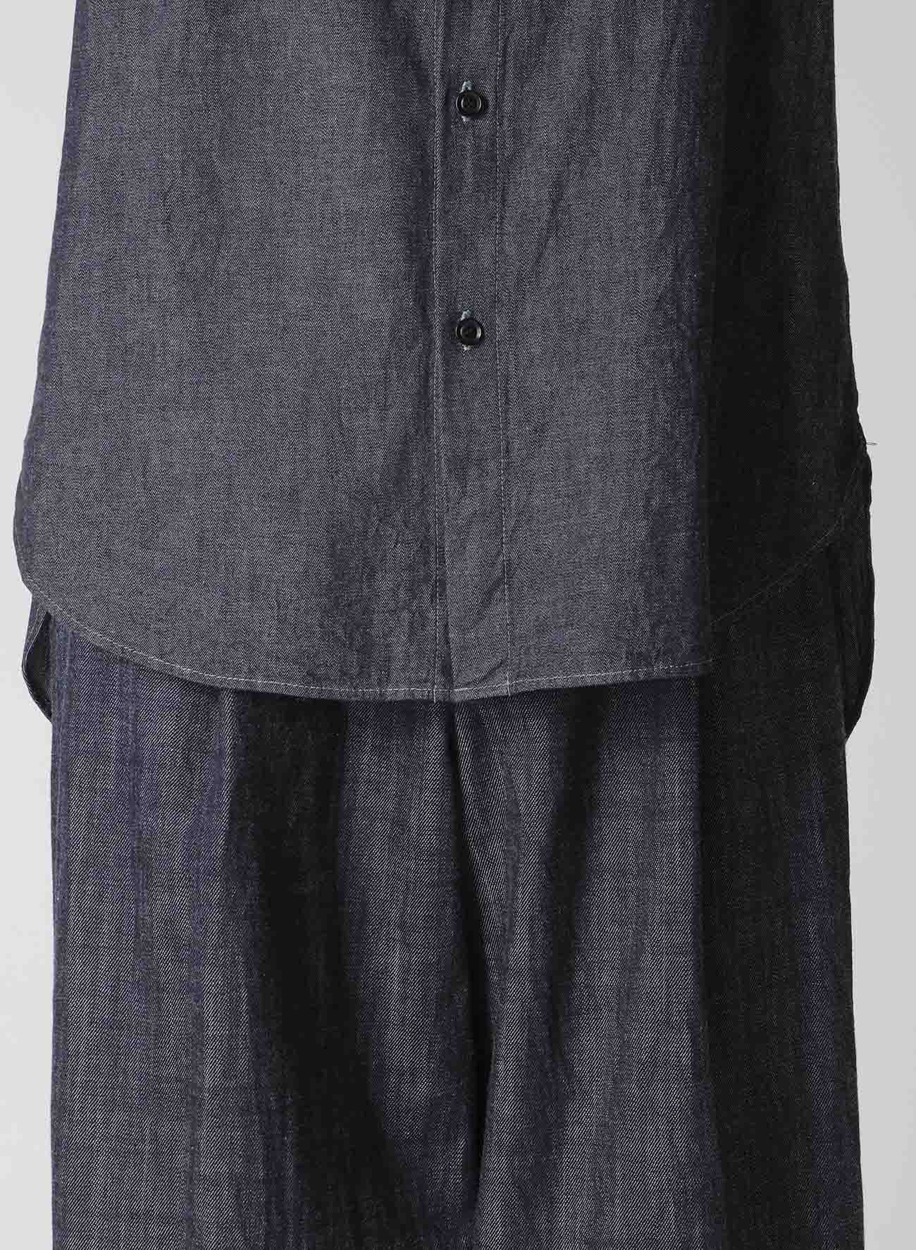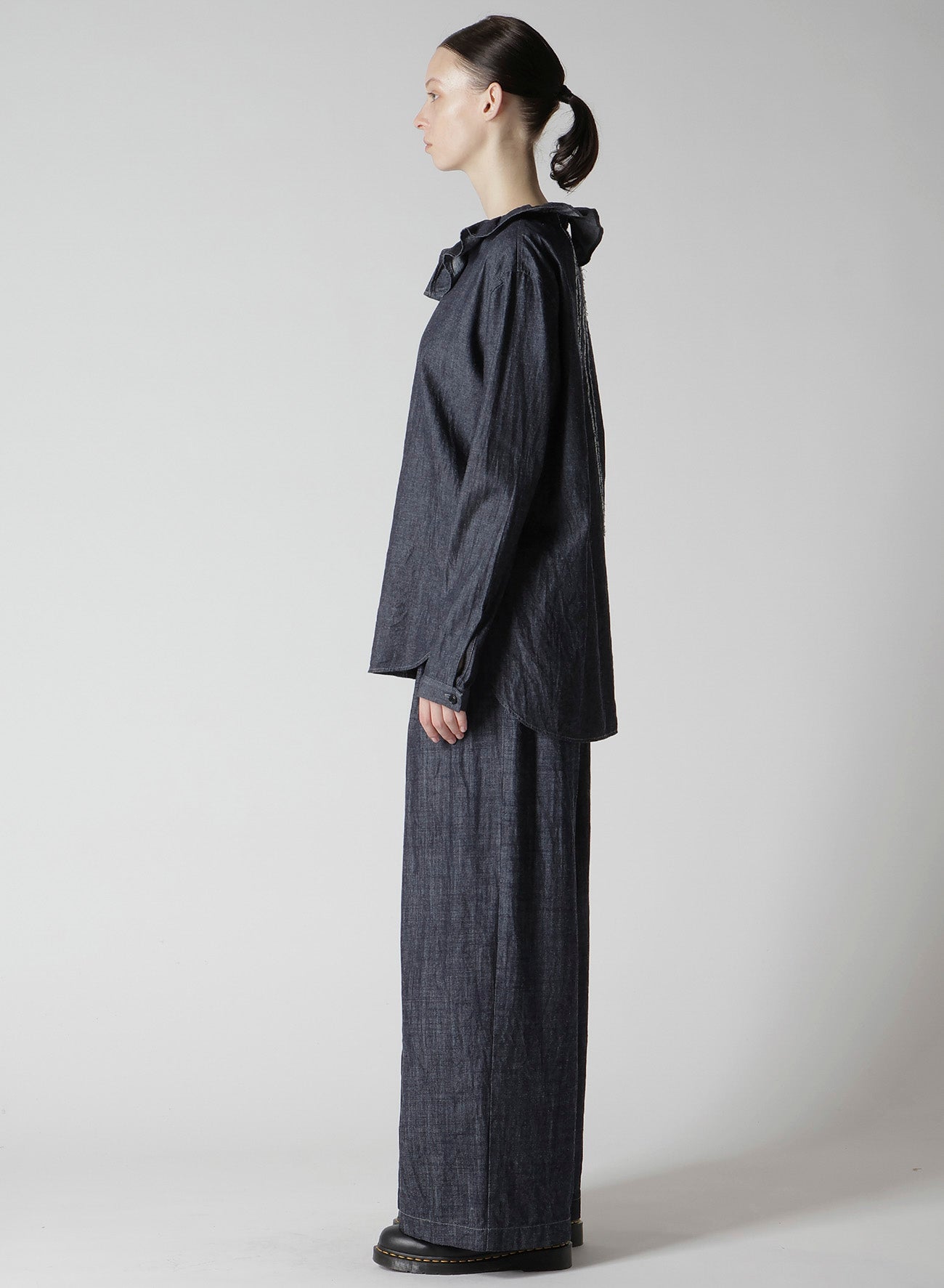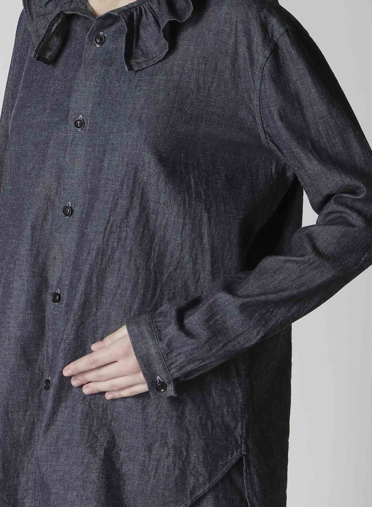 This denim blouse features a gathered collar and uses a soft, lightweight denim fabric with a loose weave. Enjoy the fabric's unique aging process due to special dyeing. The blouse is soft-washed for a comfortable feel, showing individual variations due to garment washing.