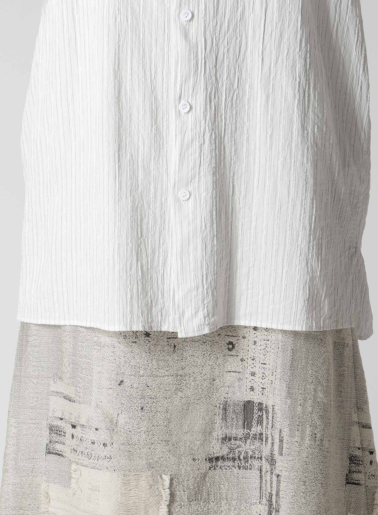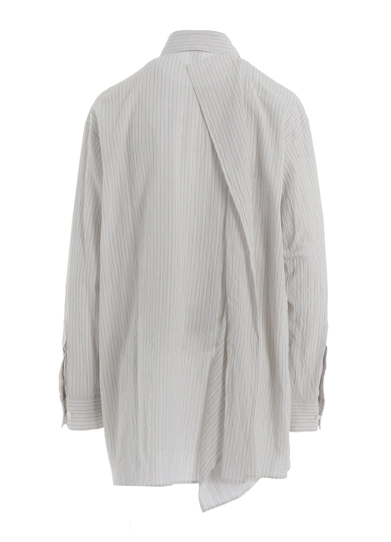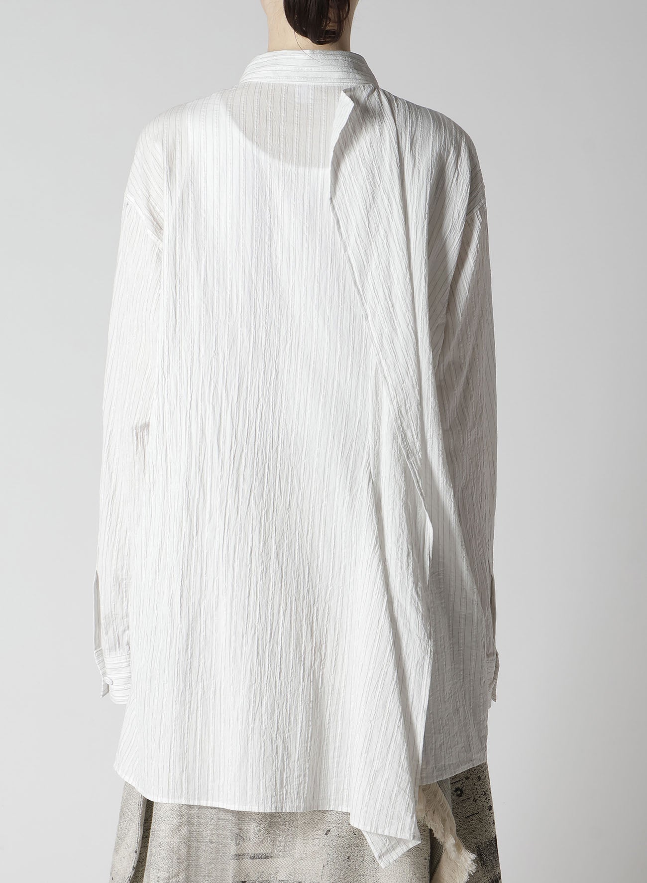 A long-sleeved blouse featuring a frilled back. Made from cotton with a crisp and refreshing texture, it has a finely wrinkled finish. The front has a simple, elegant look, while the frilled fabric drapes attractively at the back, perfectly complementing pants or dresses with a low back. Soft-washed for comfort.