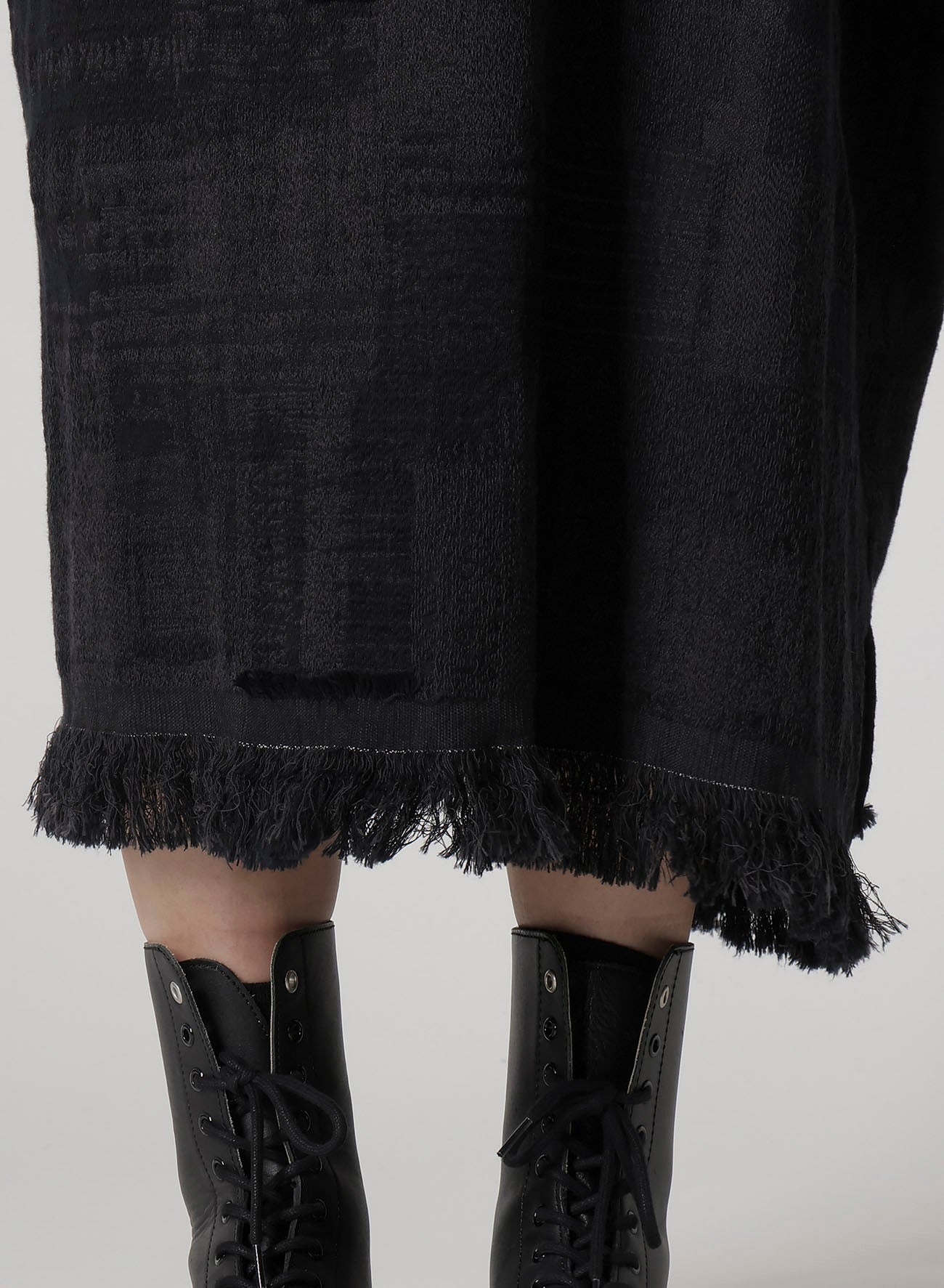 This asymmetric dress features a patchwork design with a large left armhole creating a left-leaning silhouette. The soft texture is expressed through intricate jacquard weaving, creating a pattern that resembles various fabrics sewn together. Be cautious of snagging on the floating yarn parts.