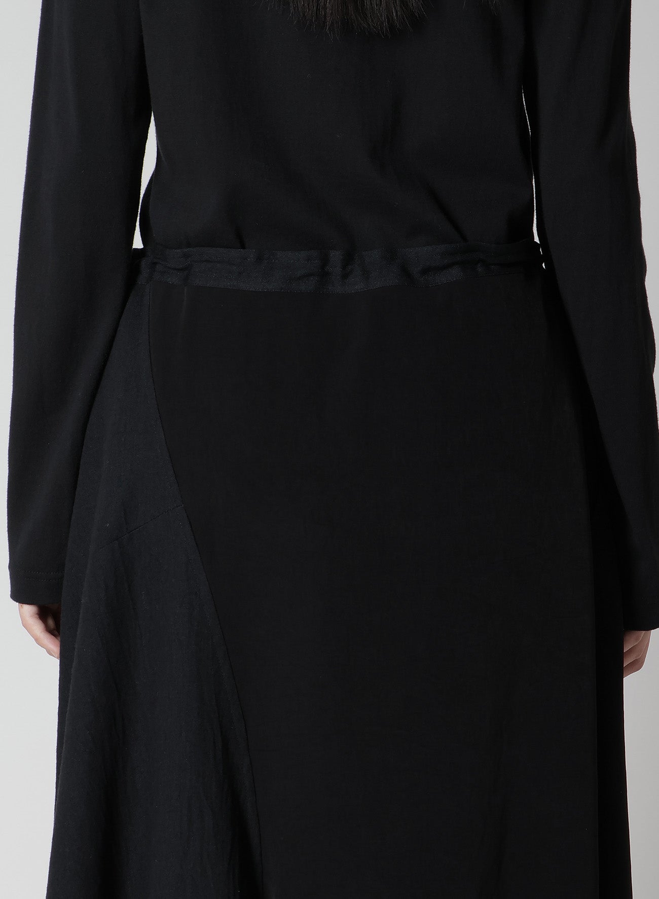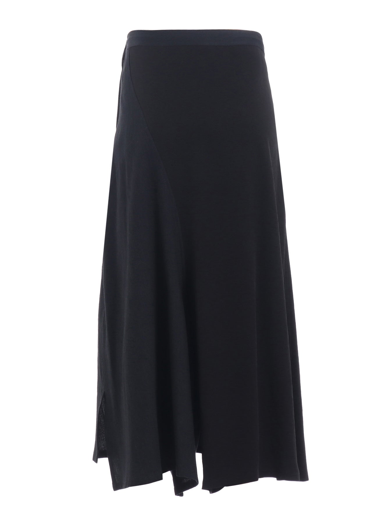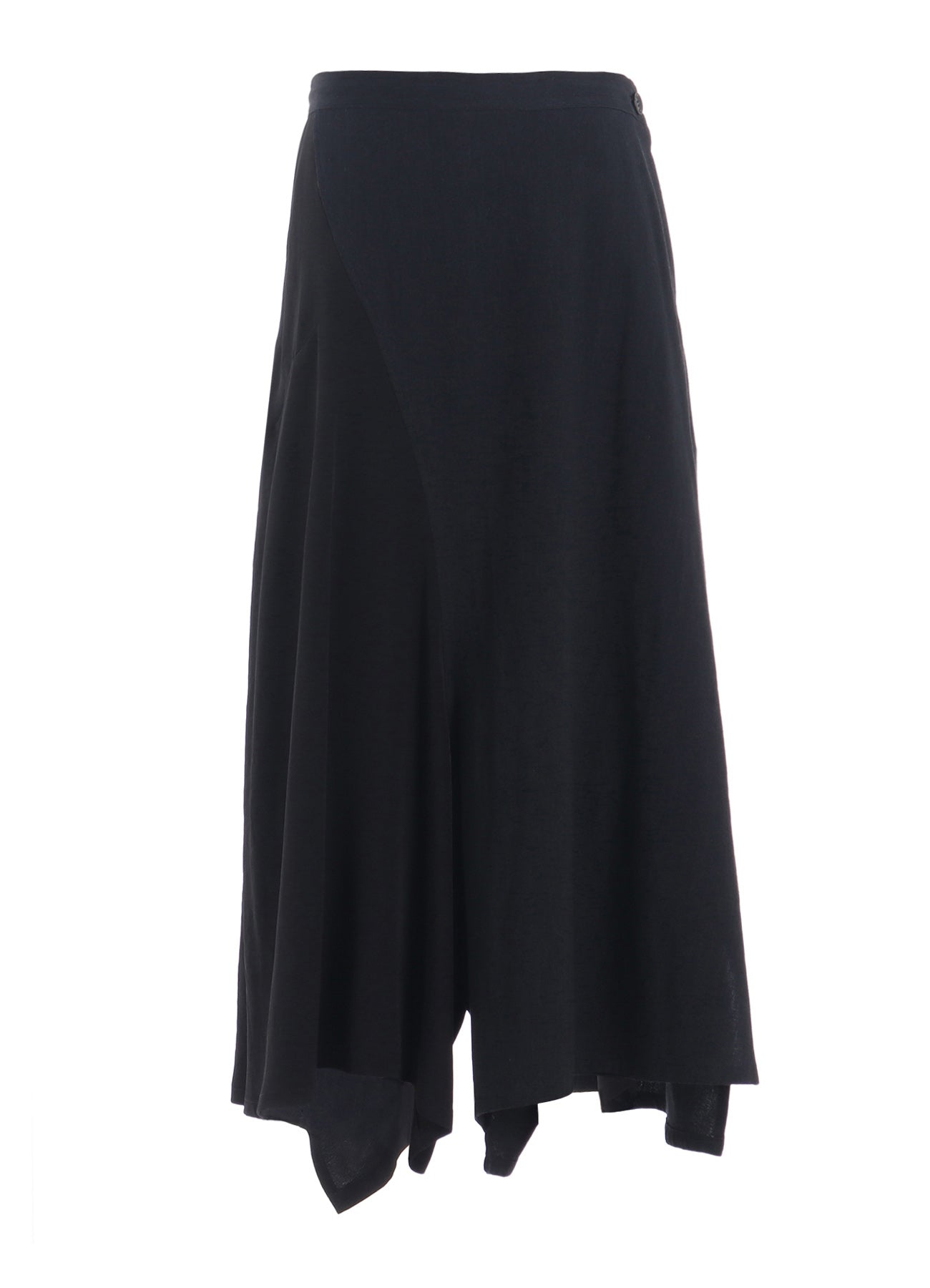 This product is a pair of pants characterized by a gentle flair, featuring a combination of loosely woven denim and the signature crepe de Chine material. The denim undergoes a unique dyeing technique, allowing for an enjoyable aging process. The silhouette is gently flared, offering a skirt-like feeling. The waist features a customizable drawstring.