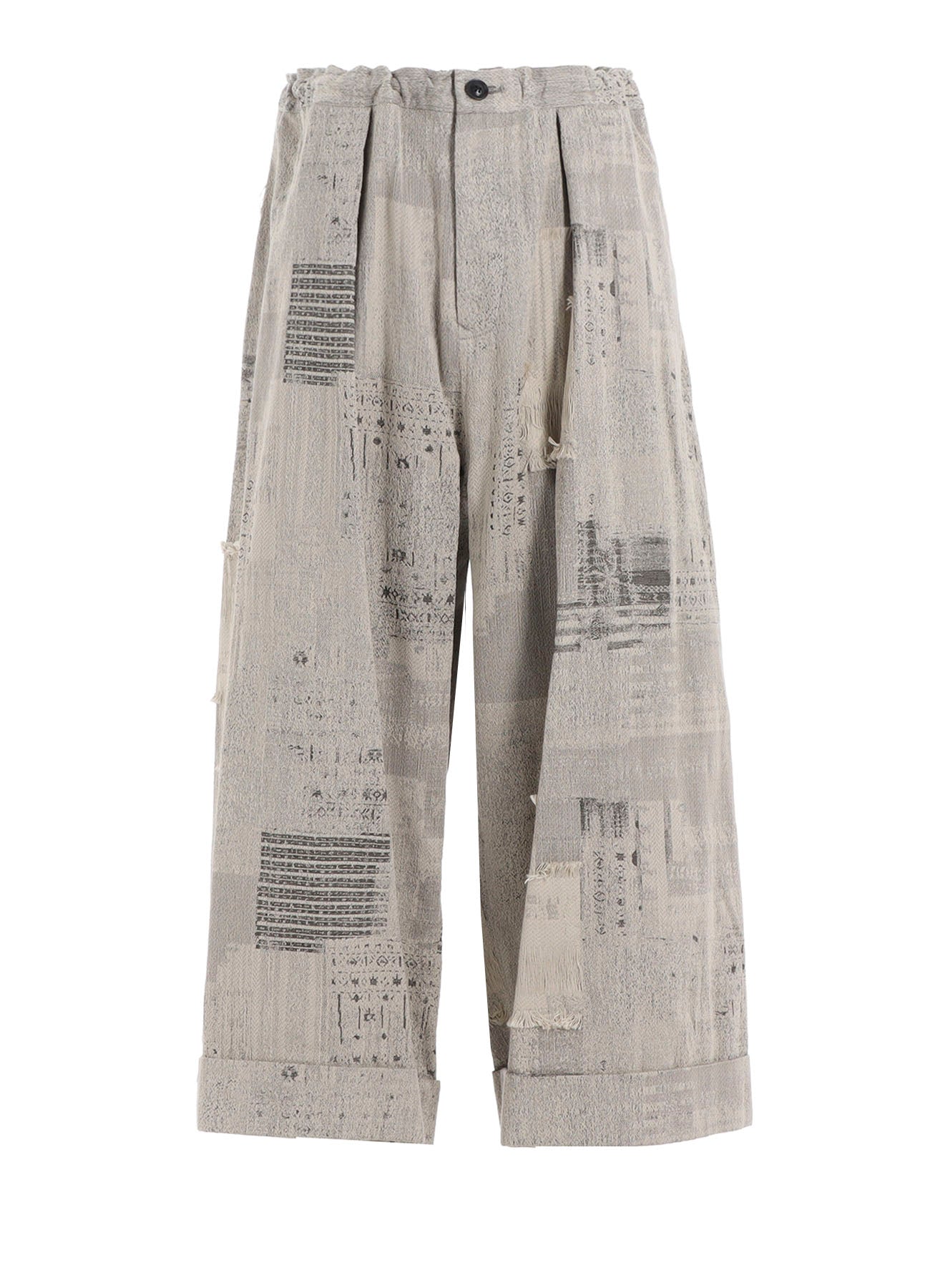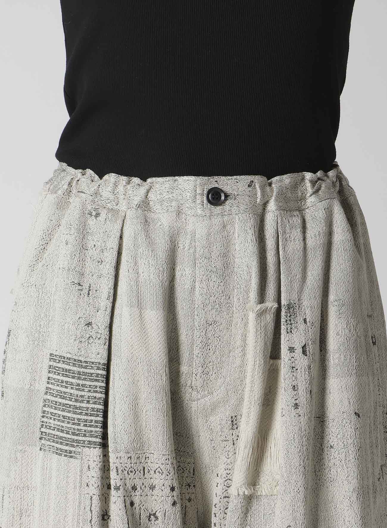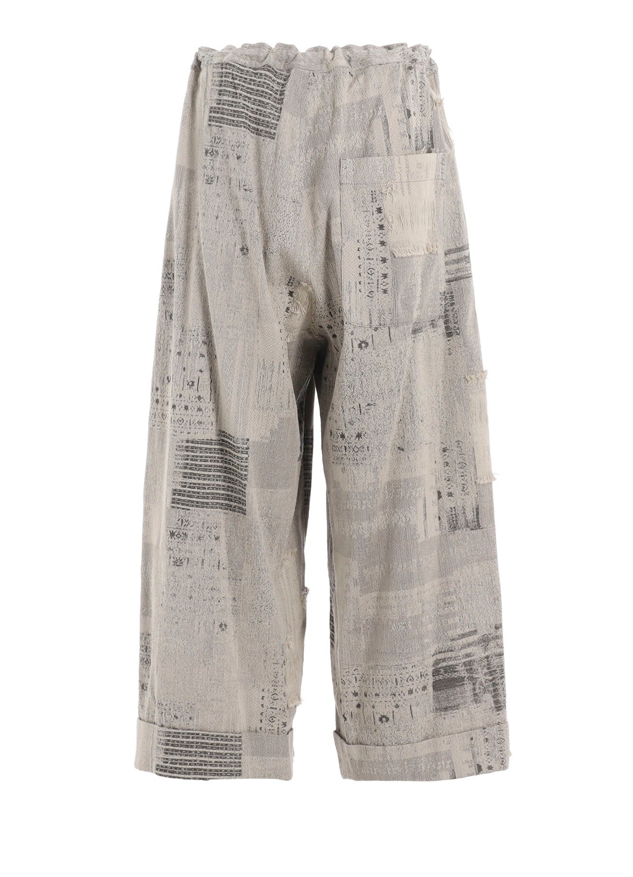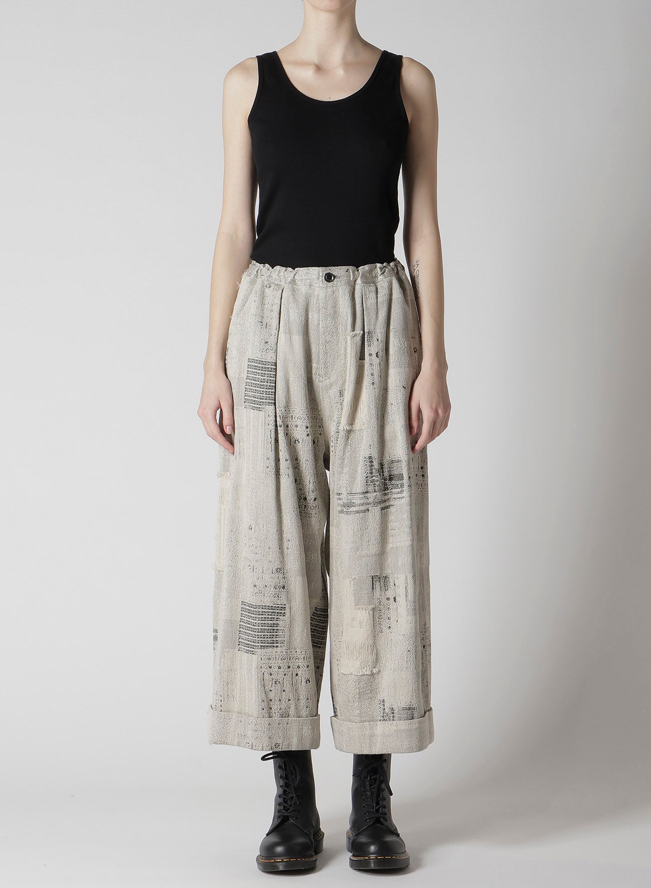These pants feature a patchwork pattern with front pleats, providing moderate volume and easy pairing with any top. The waist has an adjustable elastic and drawstring. The soft texture showcases a complex jacquard weave mimicking patchwork, achieved through varying yarn thickness and weaving techniques. Be cautious of snagging.
