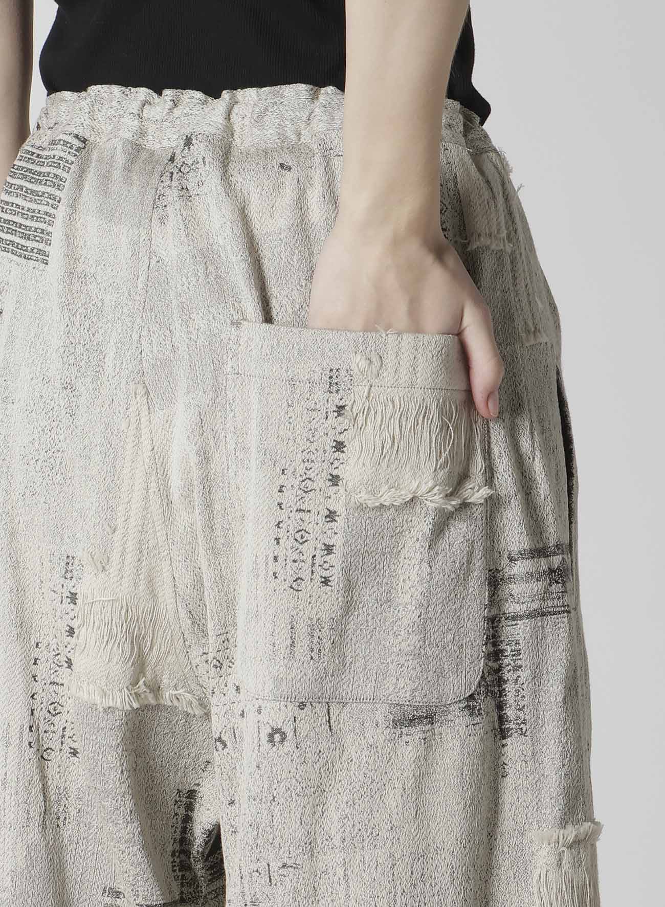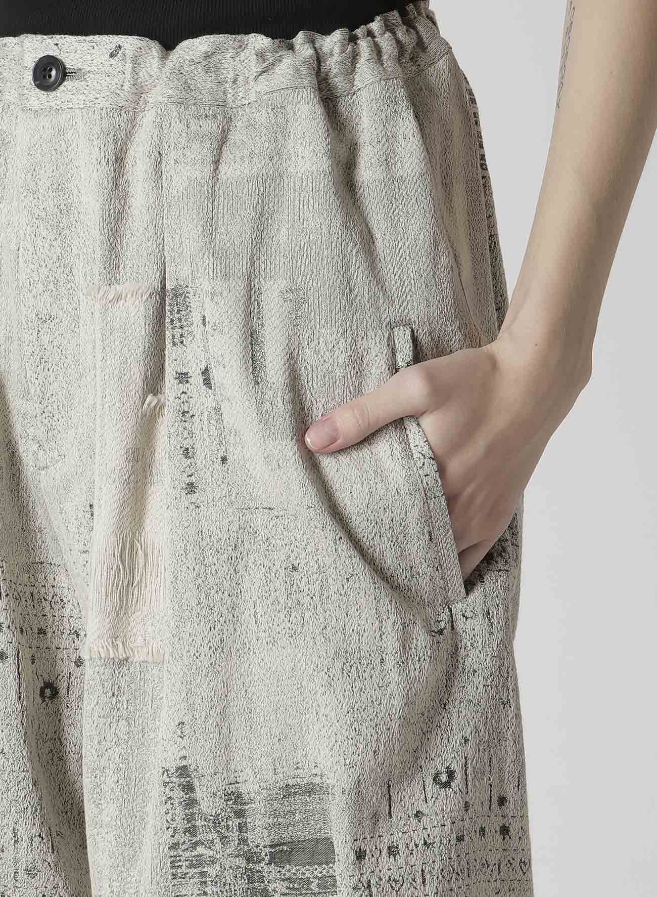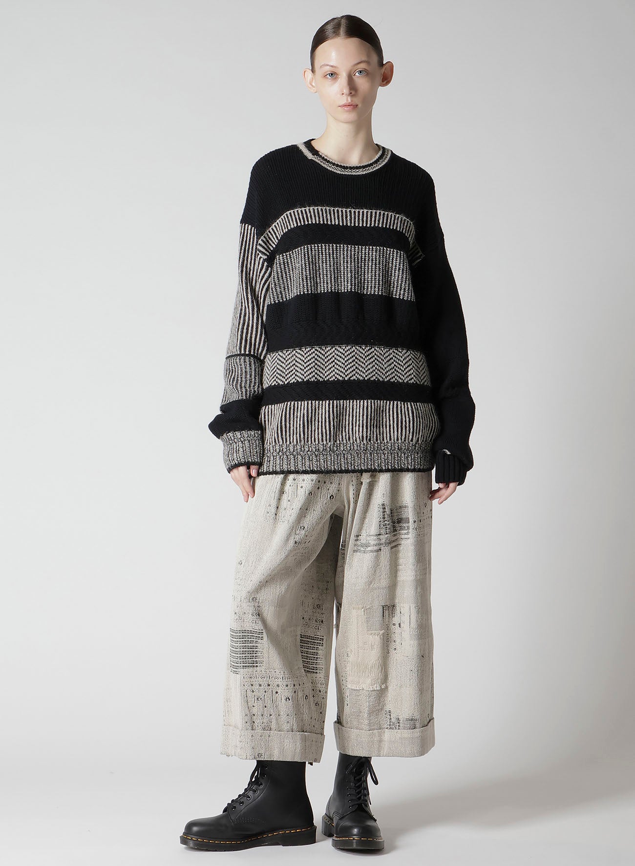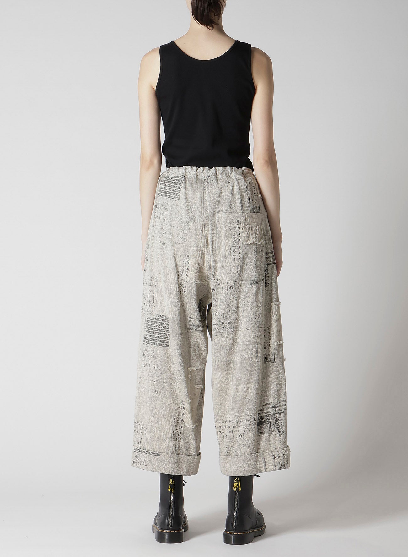 These pants feature a patchwork pattern with front pleats, providing moderate volume and easy pairing with any top. The waist has an adjustable elastic and drawstring. The soft texture showcases a complex jacquard weave mimicking patchwork, achieved through varying yarn thickness and weaving techniques. Be cautious of snagging.