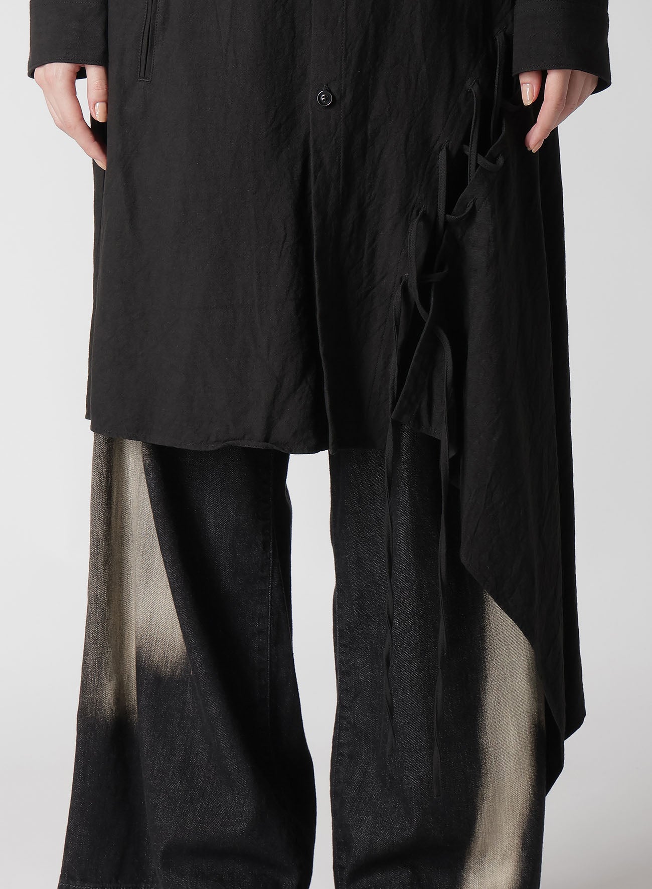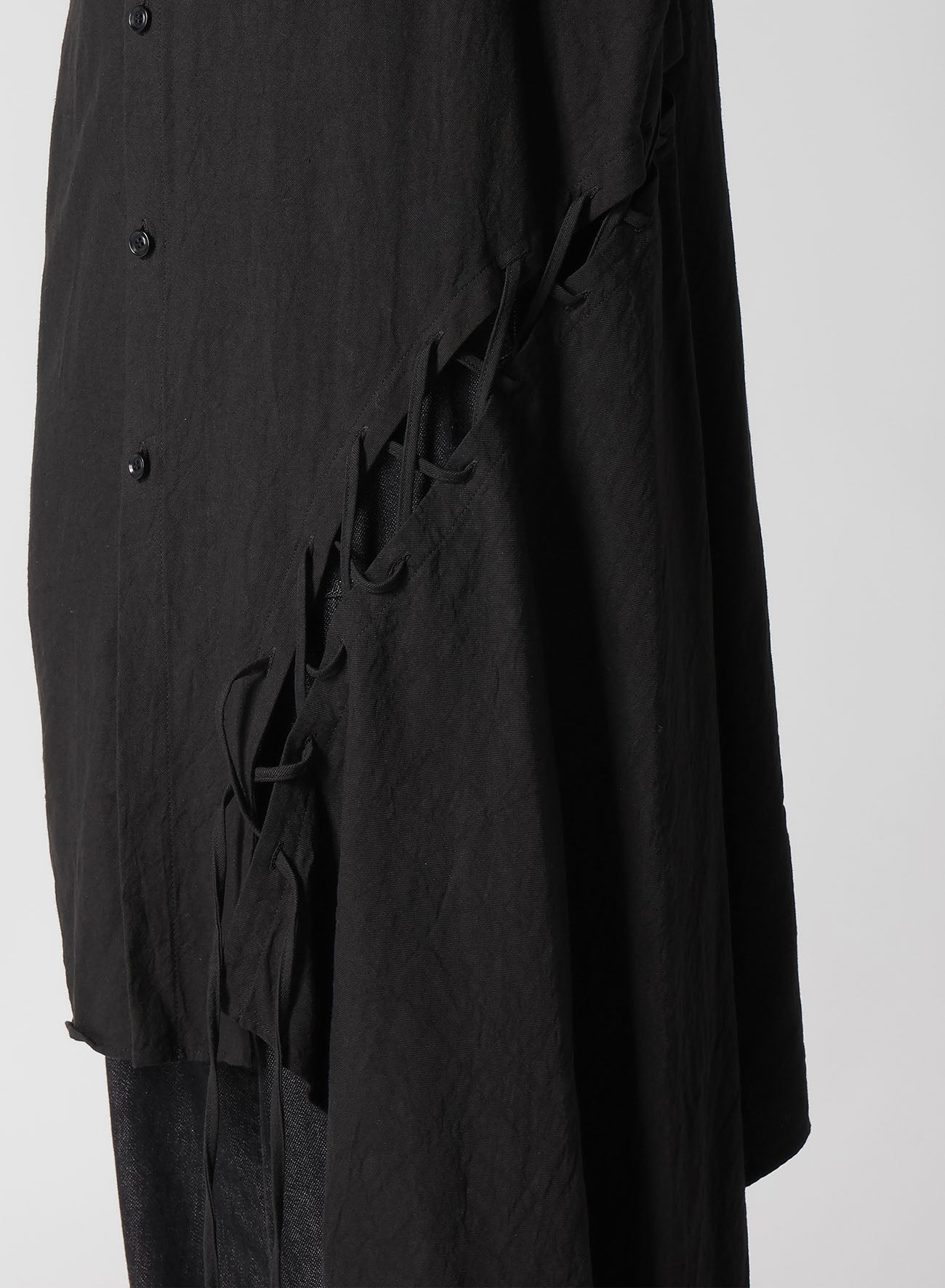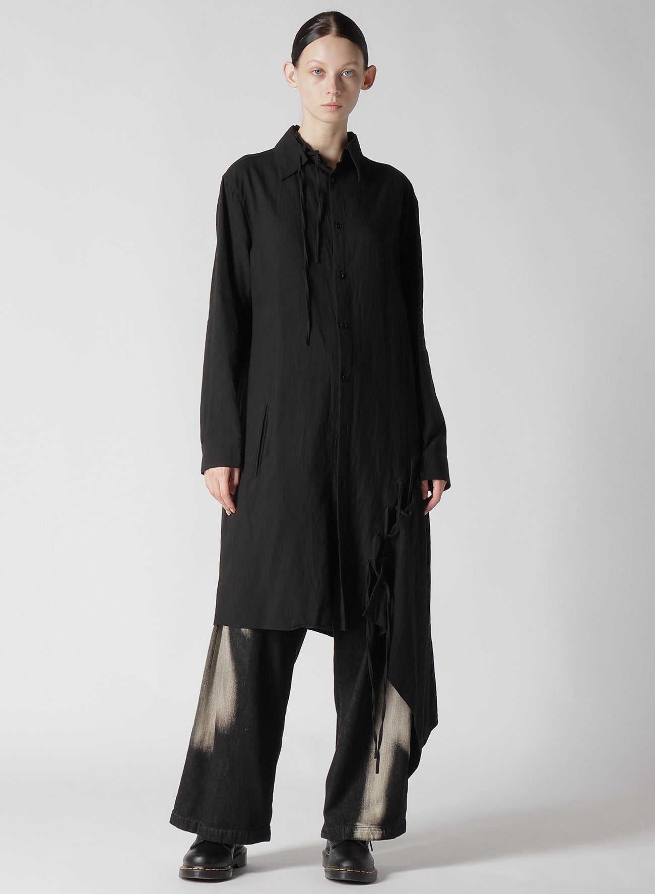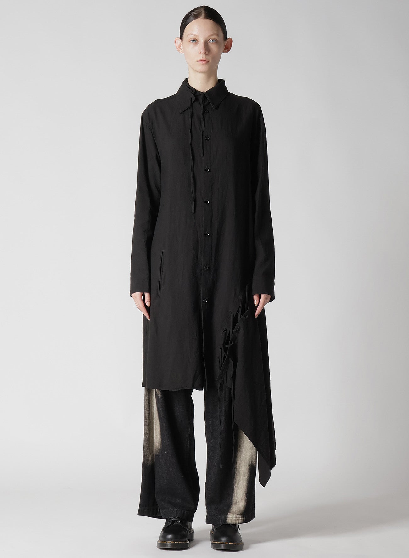 This cotton-linen/cellulose blend, natural texture lace-up long blouse stands out with its asymmetrical design and lace-up details at the hem and neckline. The lace allows inner wear to peek through, making it ideal for styling with colorful items. Note that sample images may differ slightly from actual products—please refer to SIZE INFO.
