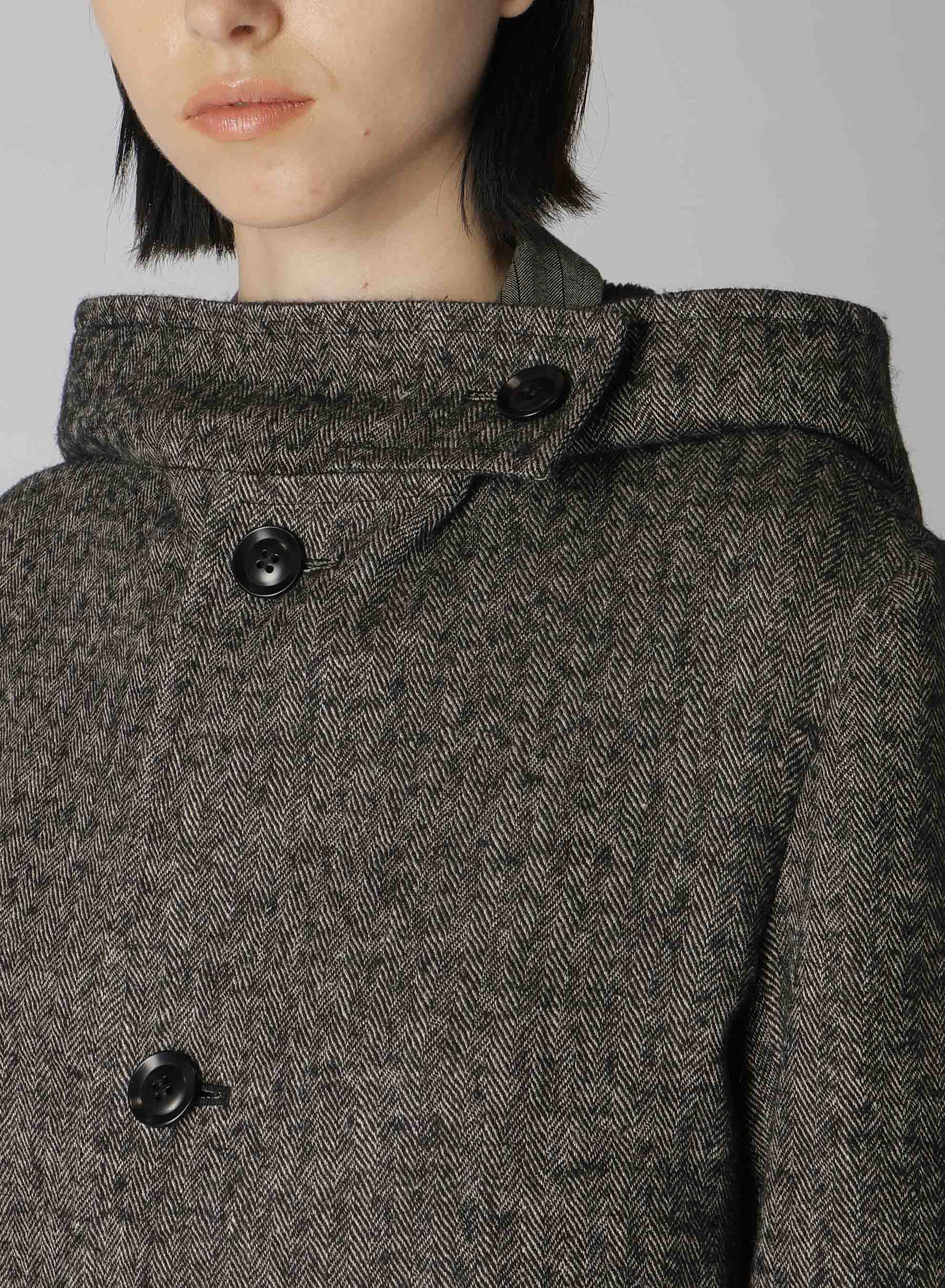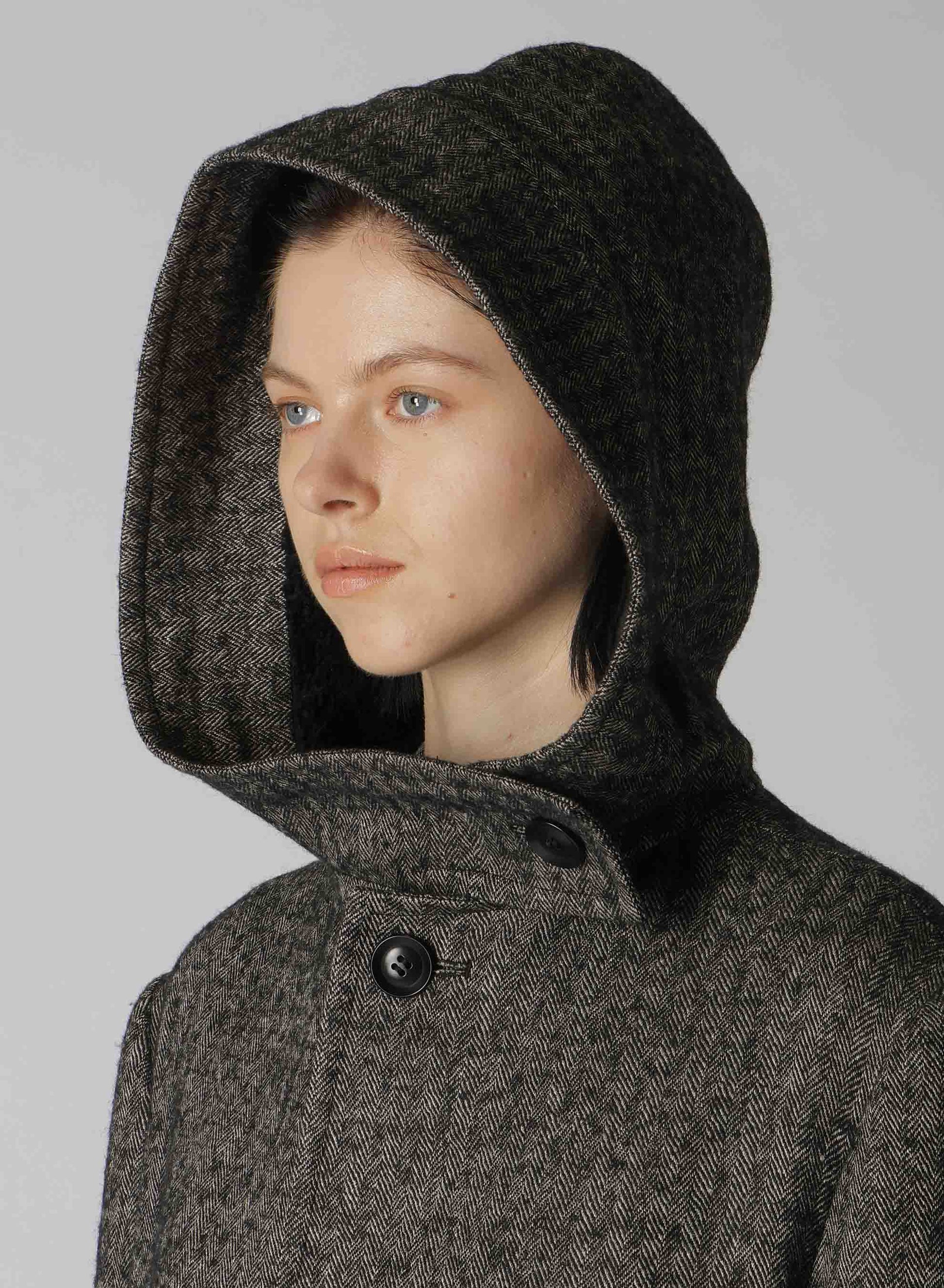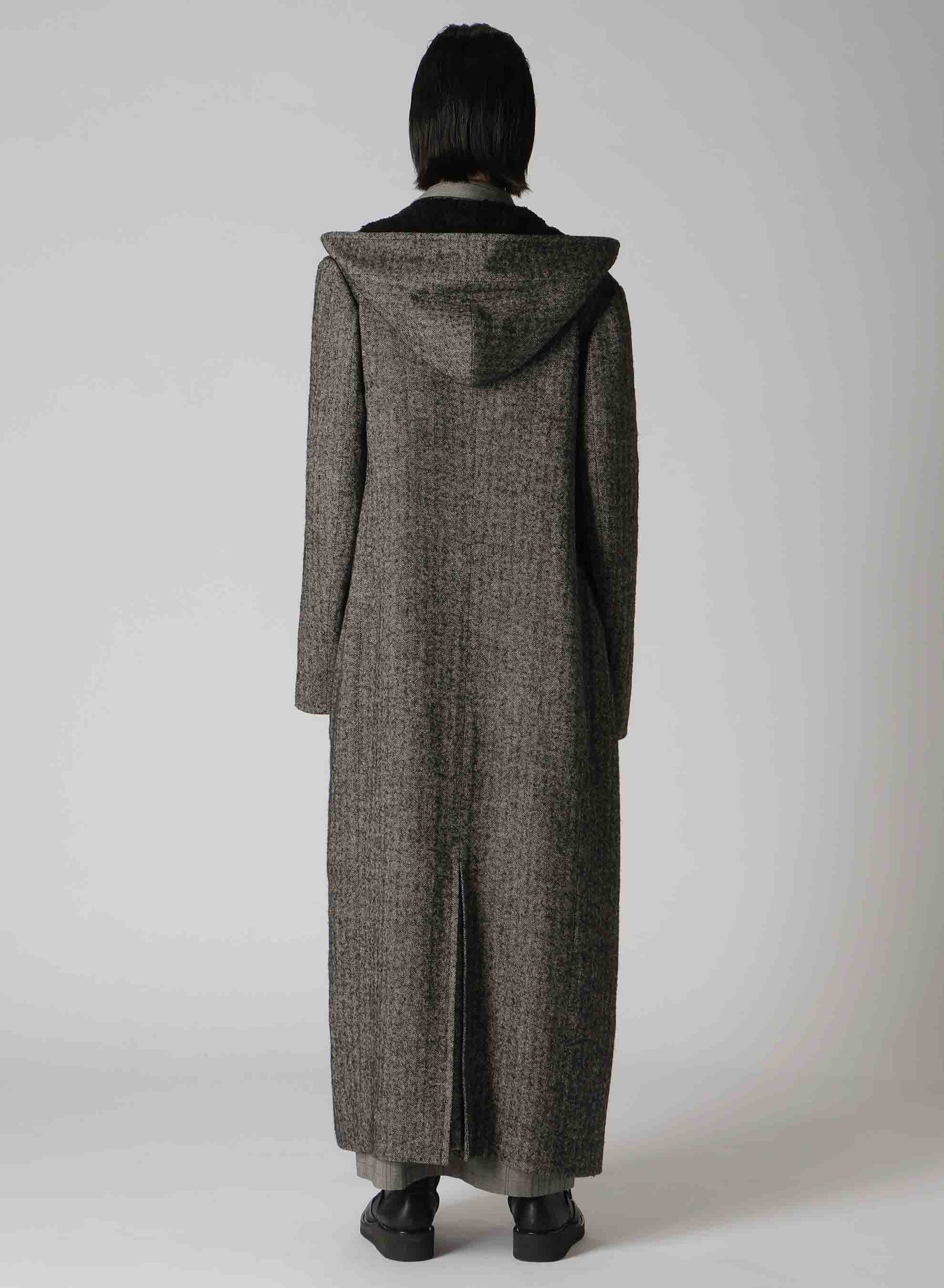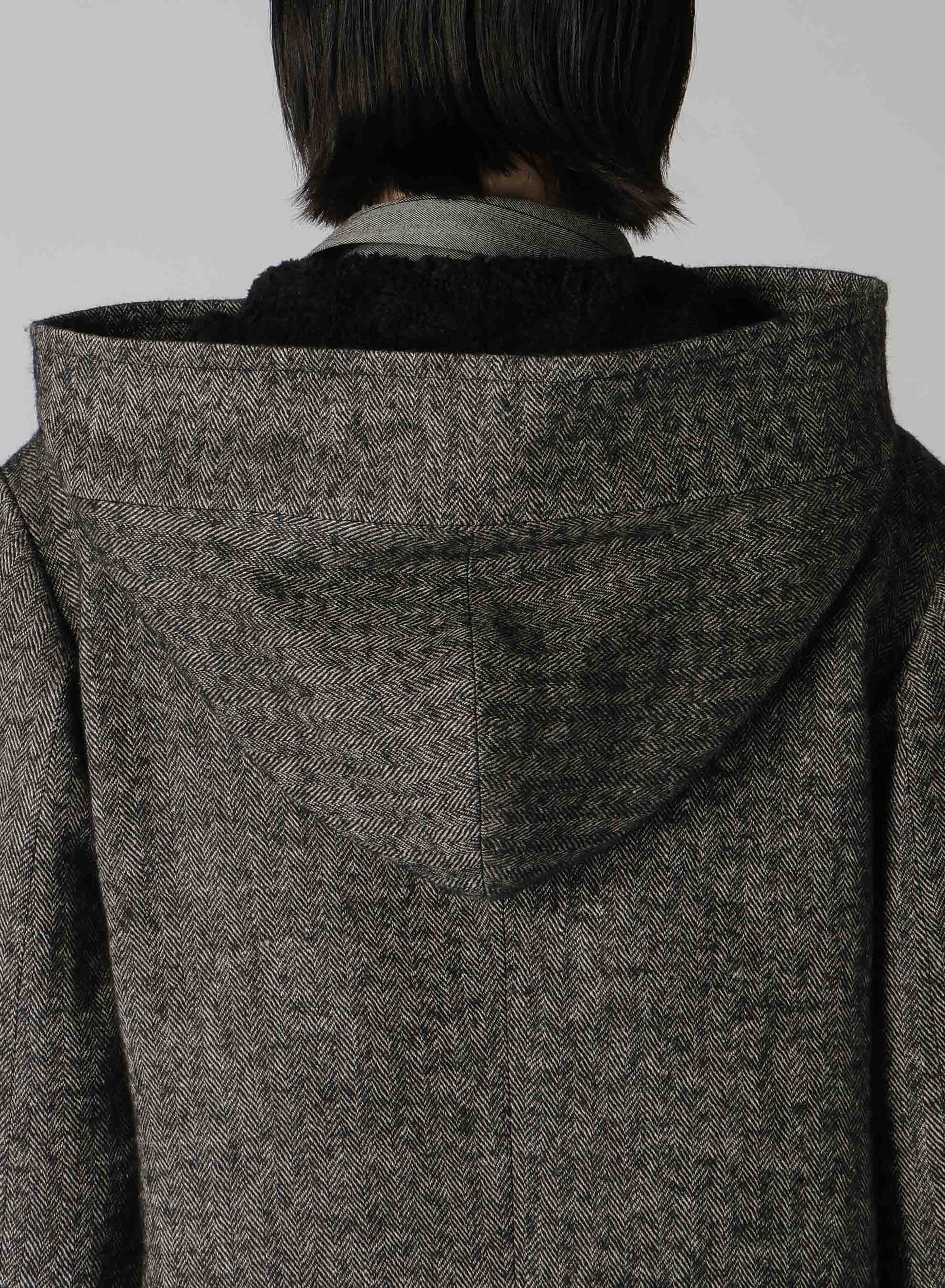 LINEN/WOOL RAISED HERRINGBONE LONG COAT WITH HOODIE