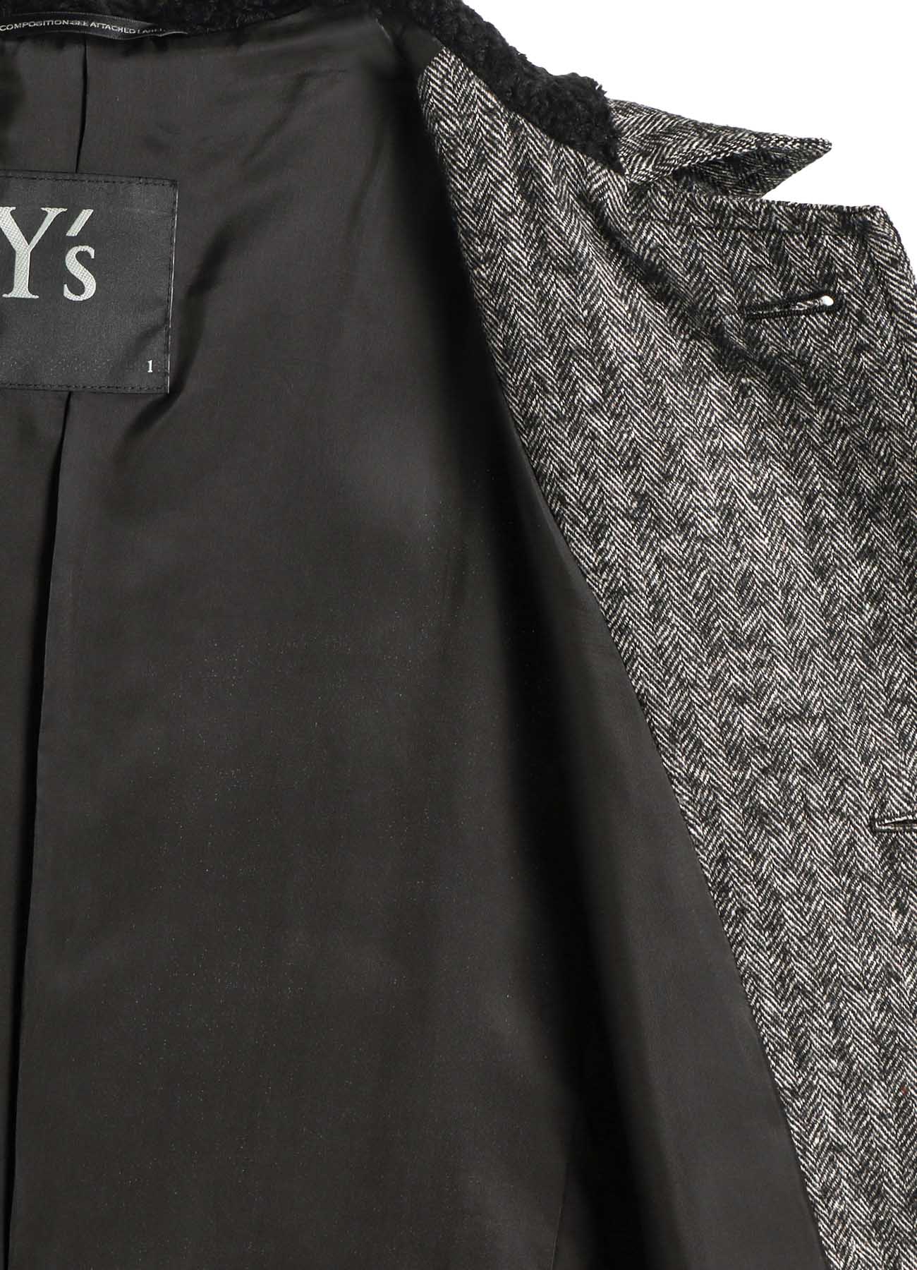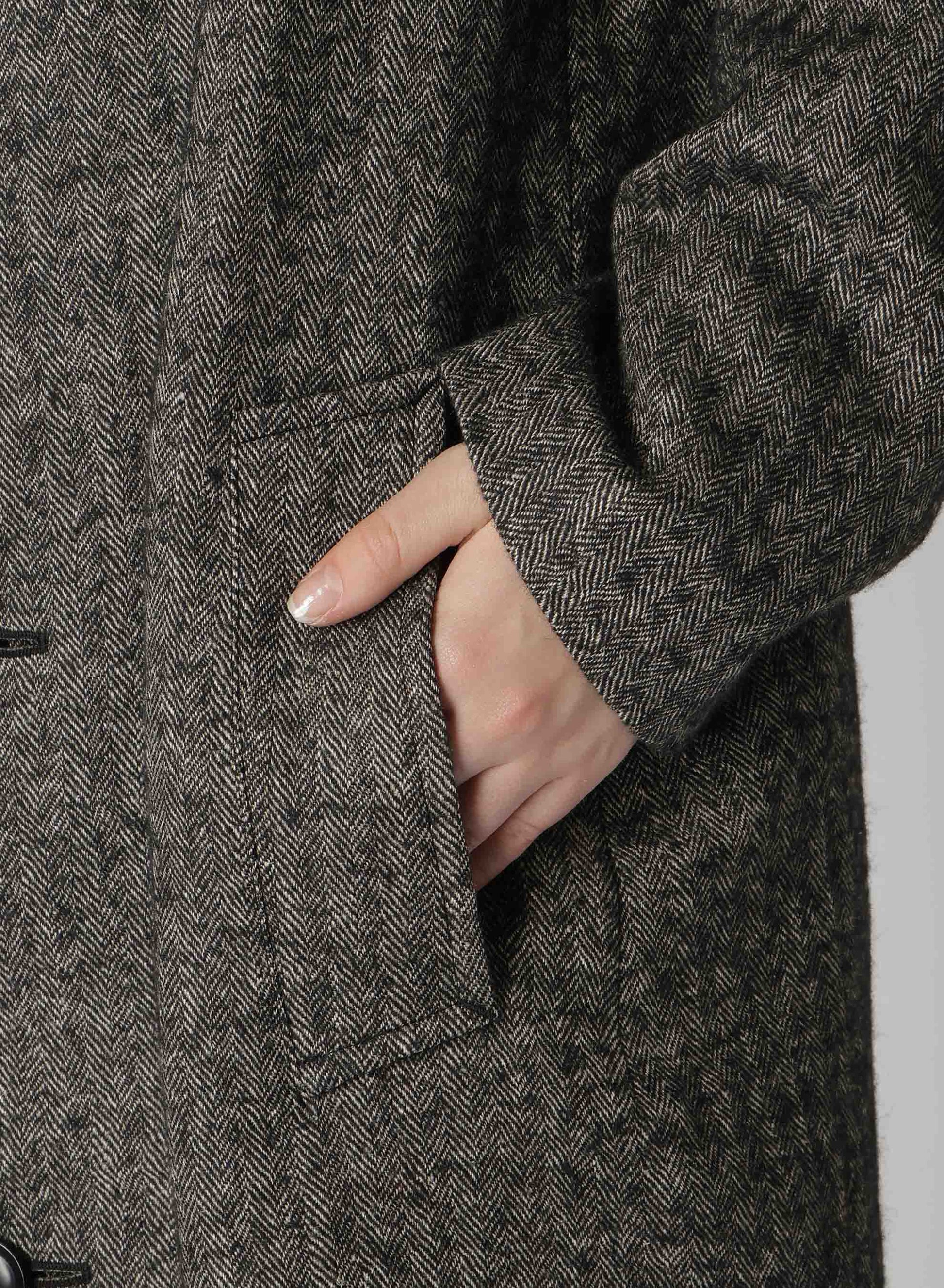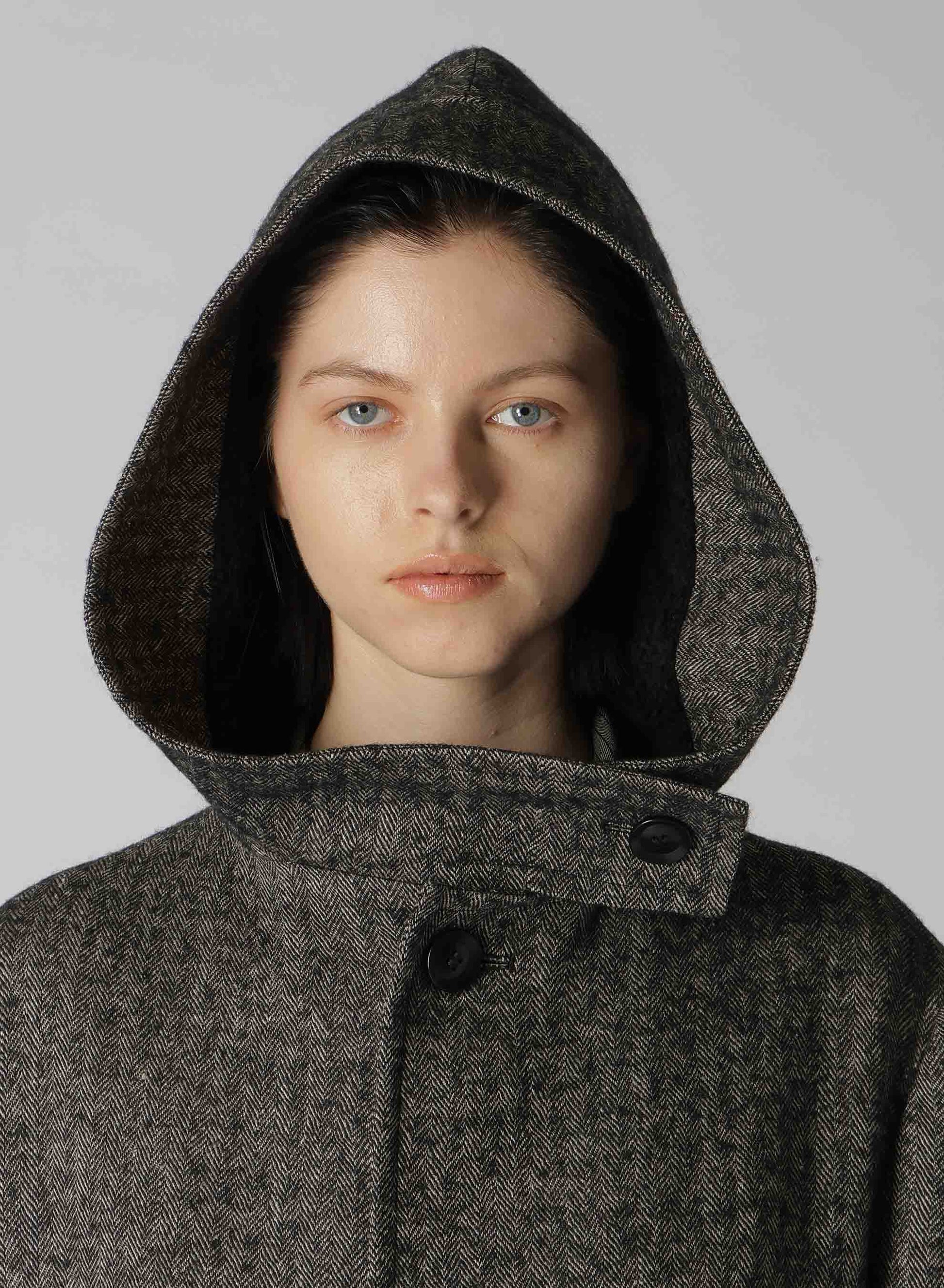 A herringbone hooded long coat with a distinct tailored collar and asymmetric neckline creates movement. Made from a wool-linen blend, the hood features a boa lining, making it ideal for autumn and winter outfits.