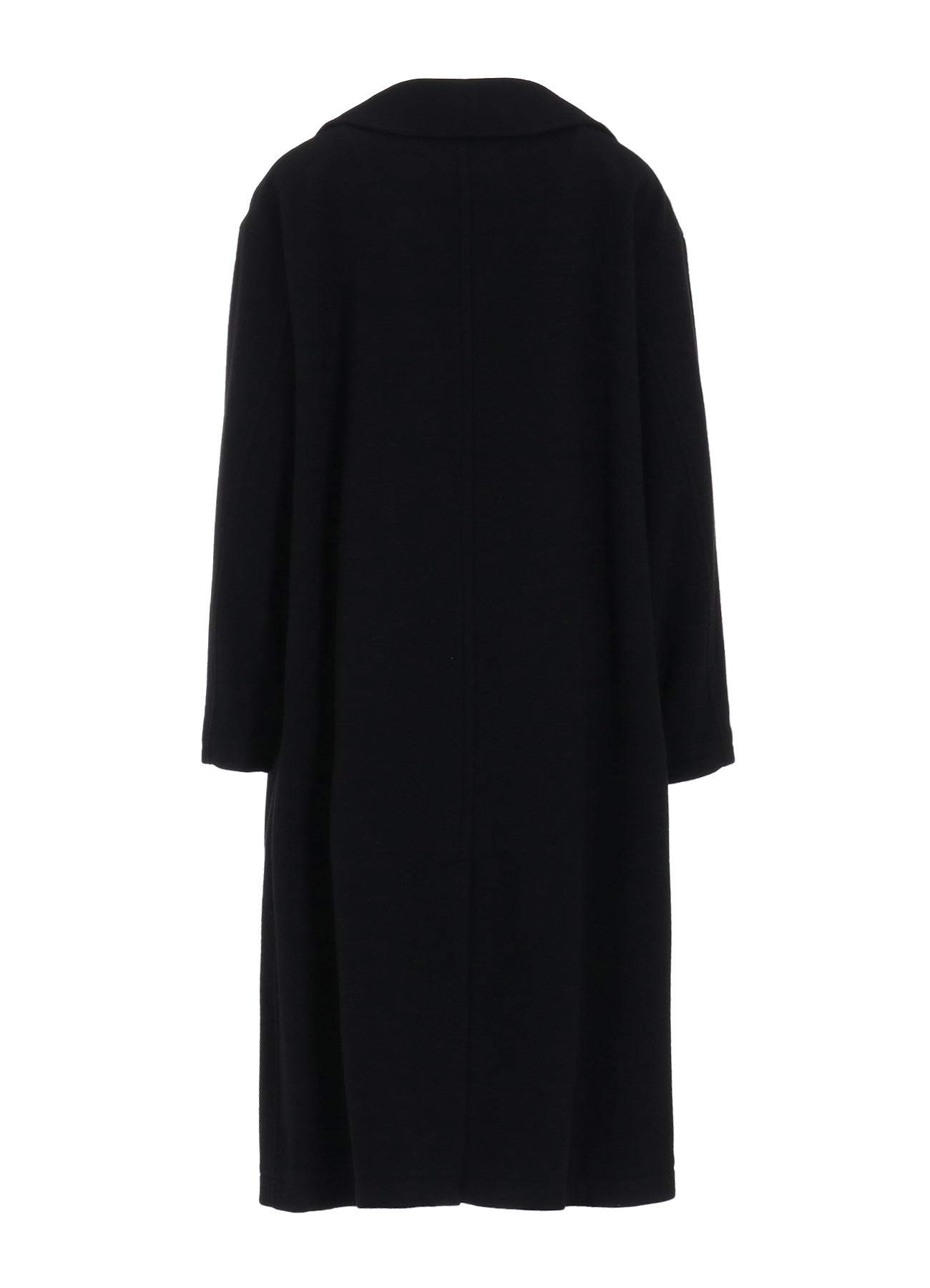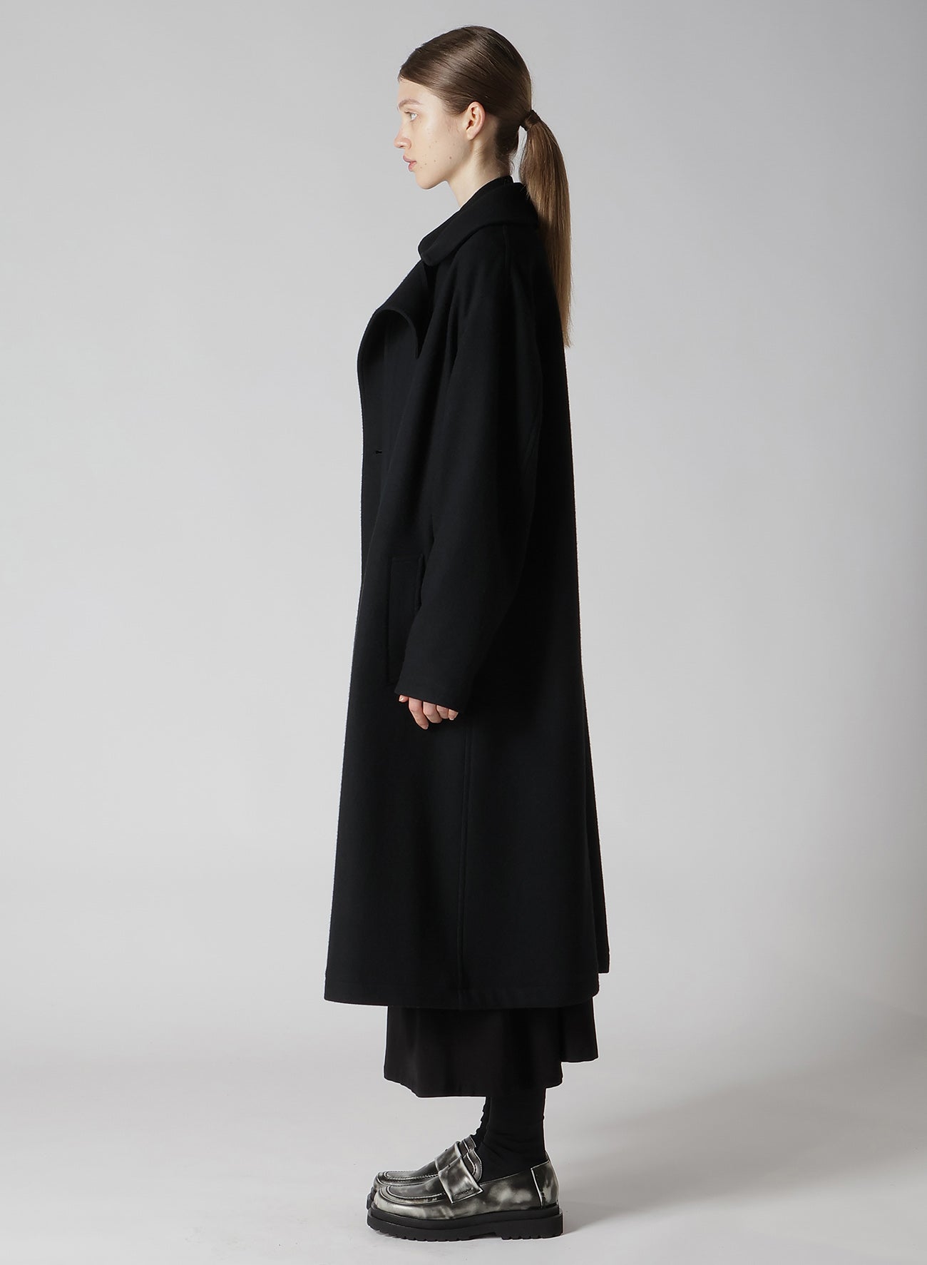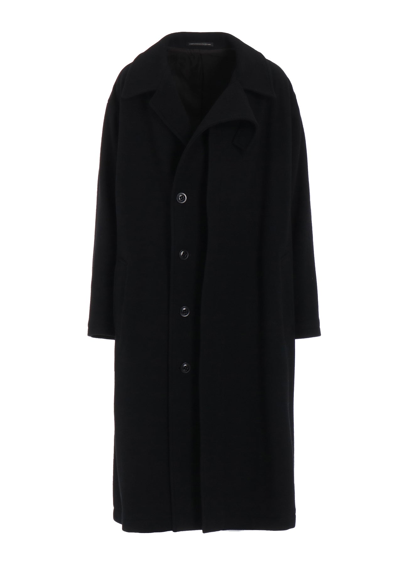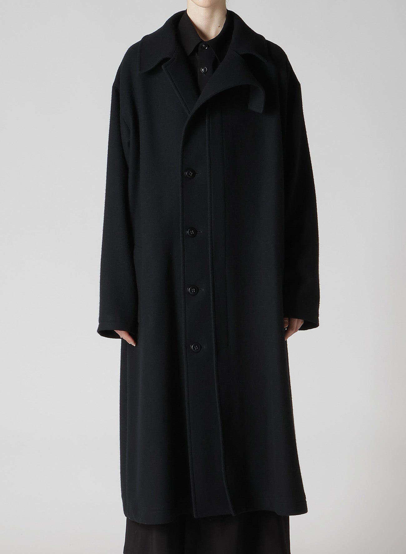 This coat is crafted from wool mosser, lauded for its moss-like texture, softness, and lightweight feel. Its distinct design feature is the left front placket, appearing detached. An inner fastening belt ensures the coat retains its silhouette when worn open. Perfect for style-conscious individuals seeking unique apparel.