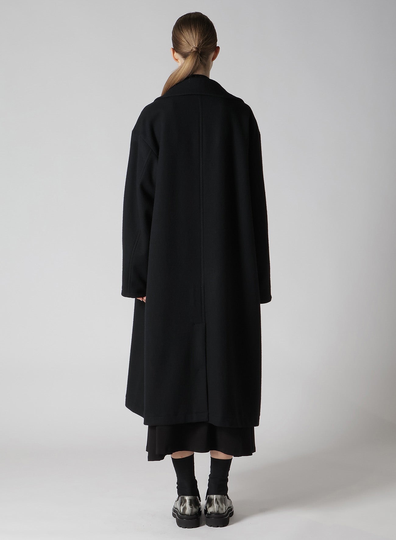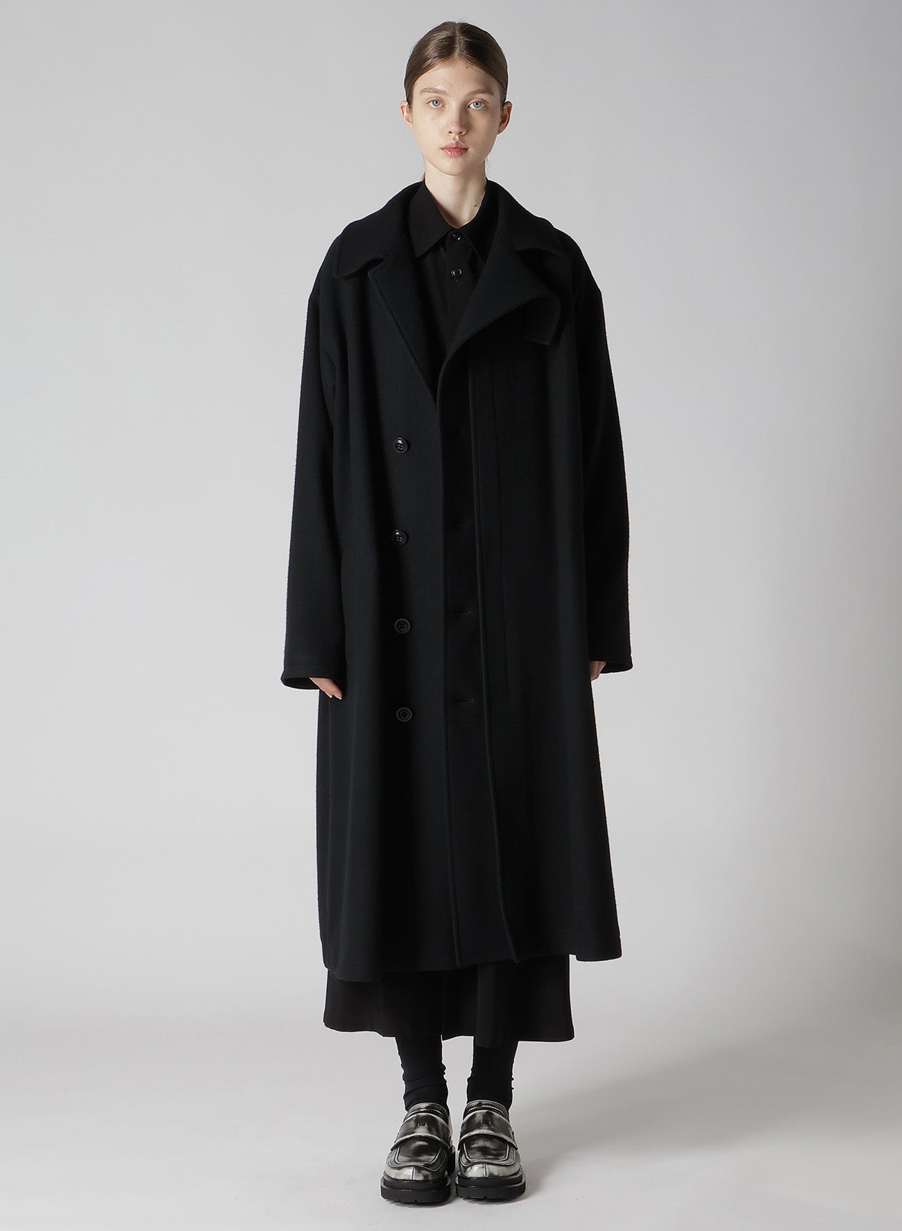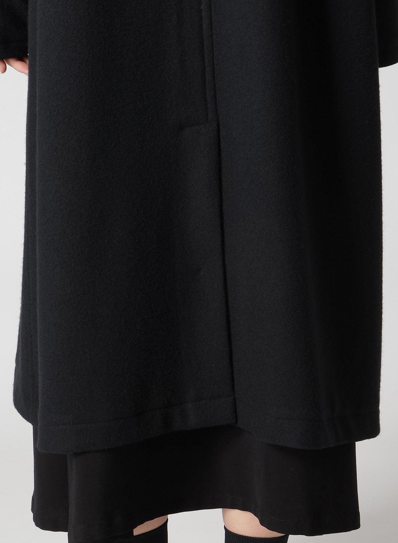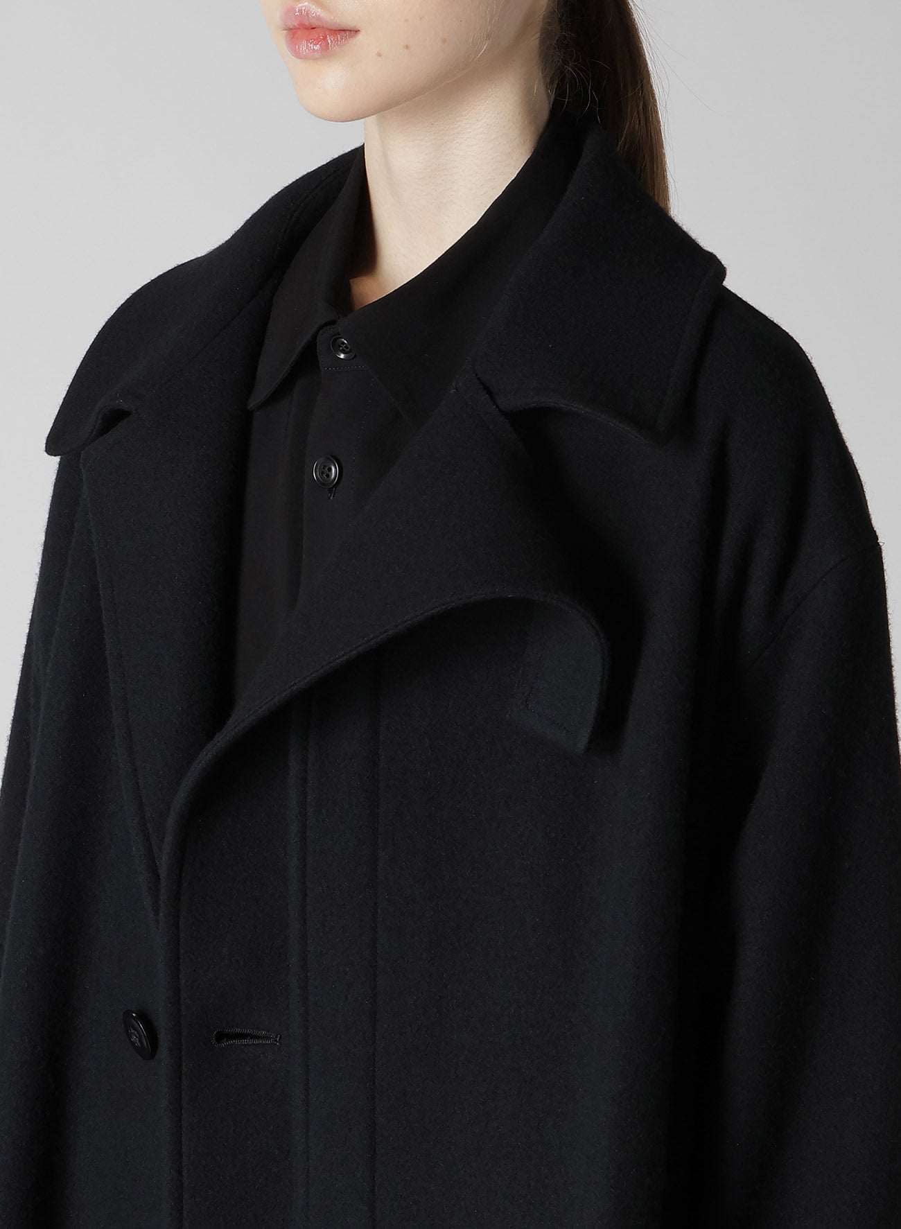 This coat is crafted from wool mosser, lauded for its moss-like texture, softness, and lightweight feel. Its distinct design feature is the left front placket, appearing detached. An inner fastening belt ensures the coat retains its silhouette when worn open. Perfect for style-conscious individuals seeking unique apparel.
