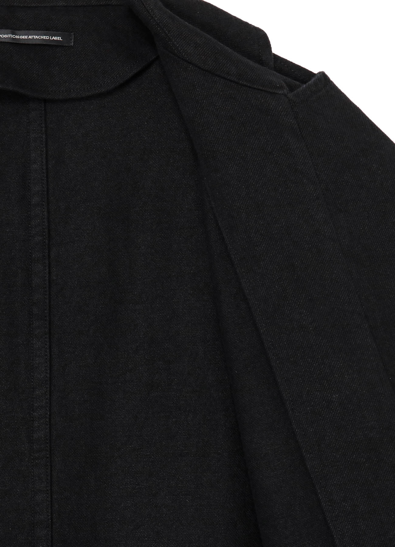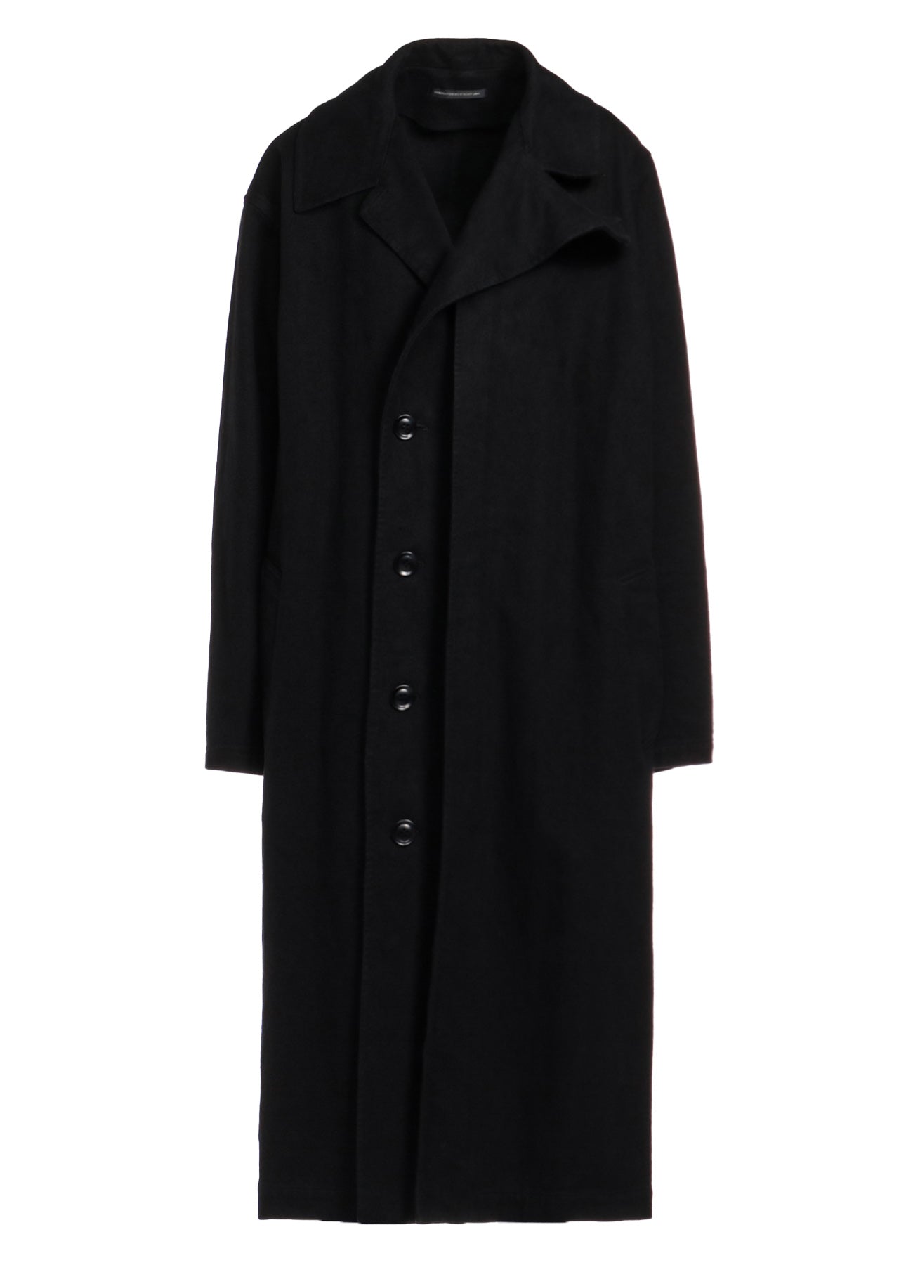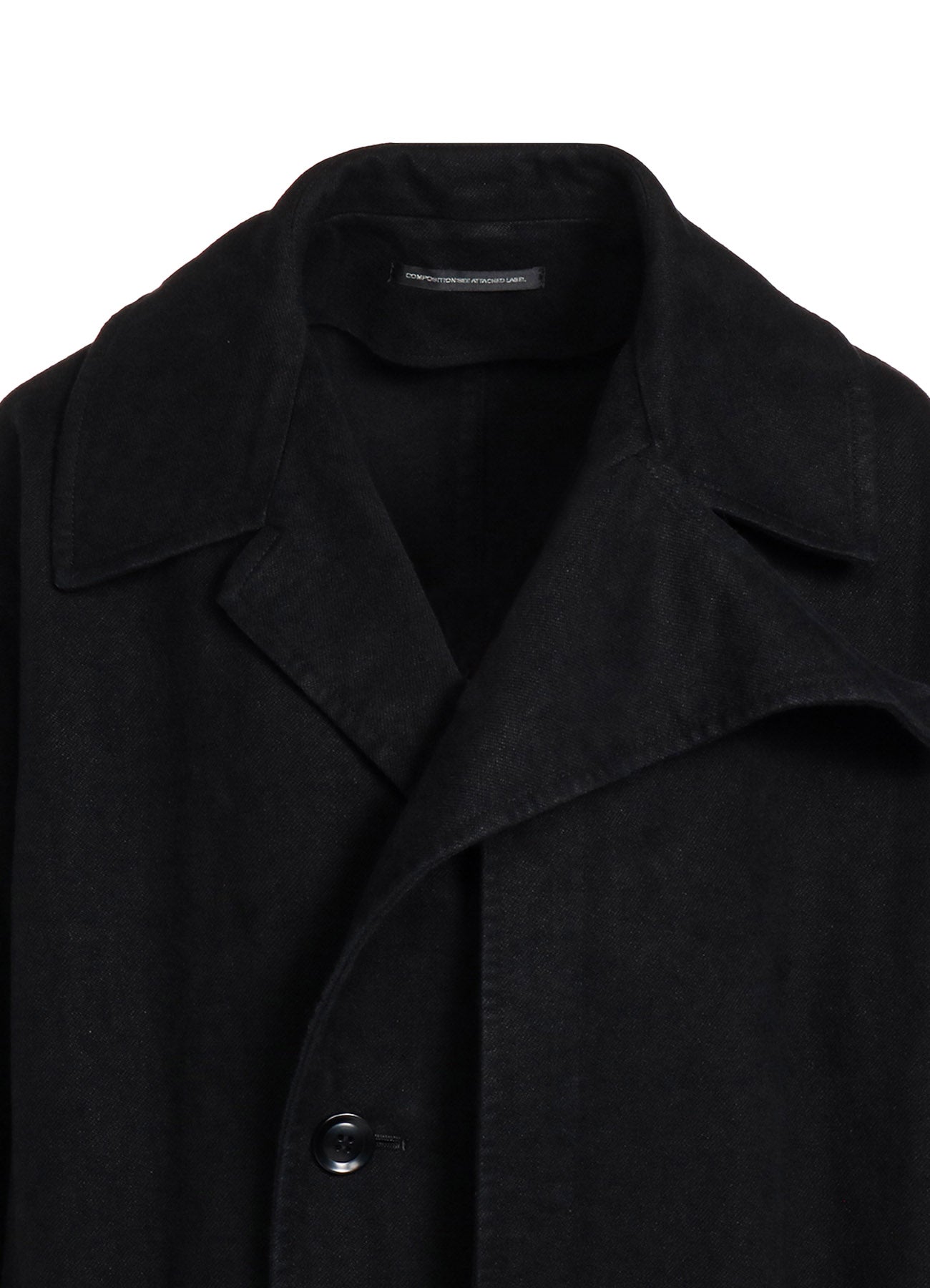 A cotton-linen gabardine coat with a unique left front placket design, washed with Original Charcoal for an aged appearance. The fabric retains its natural properties while providing softness due to the use of a softening agent. An internal belt helps maintain the silhouette when worn open.