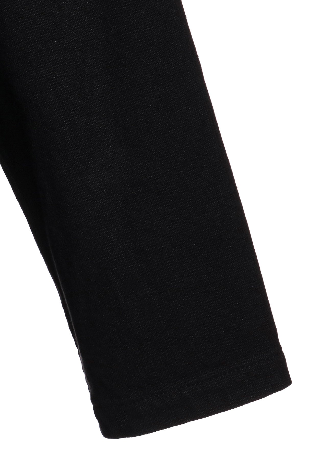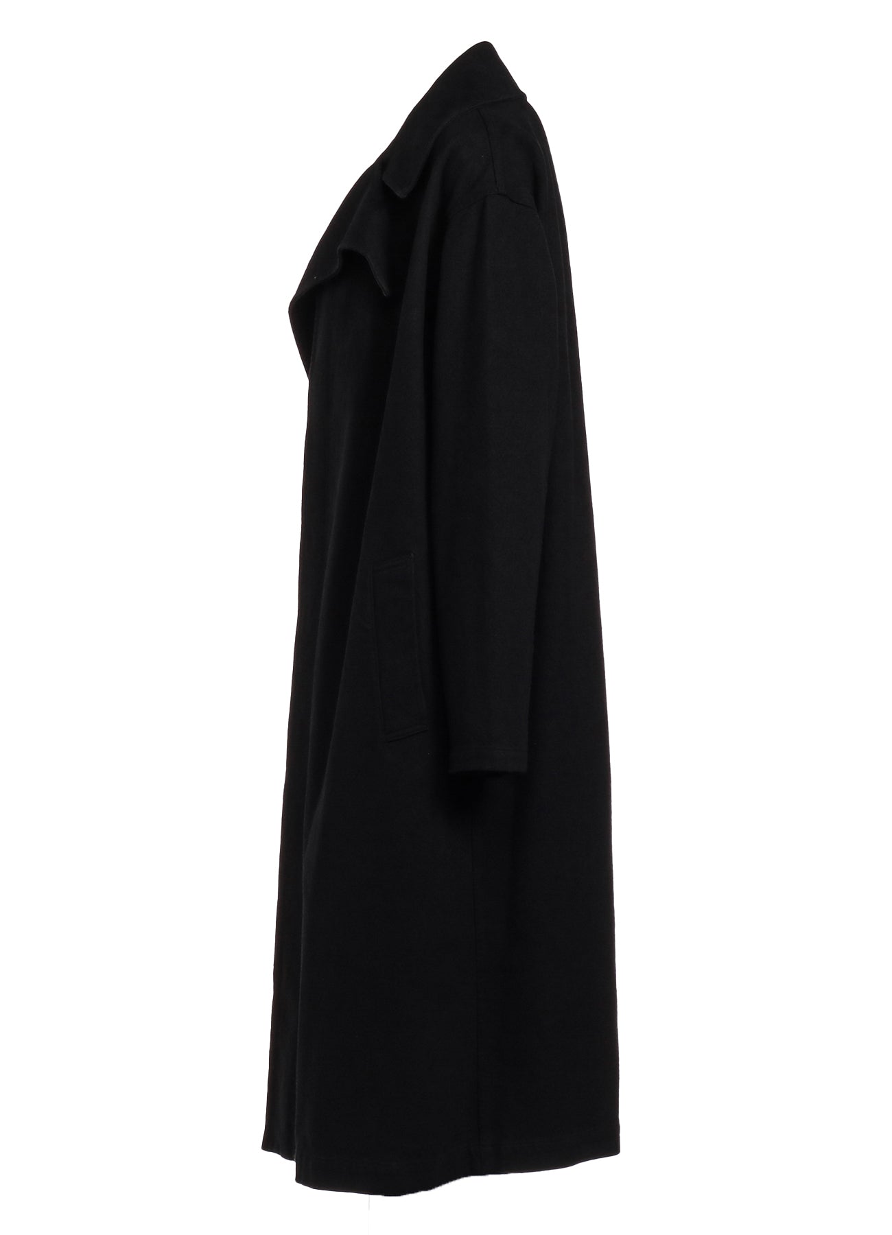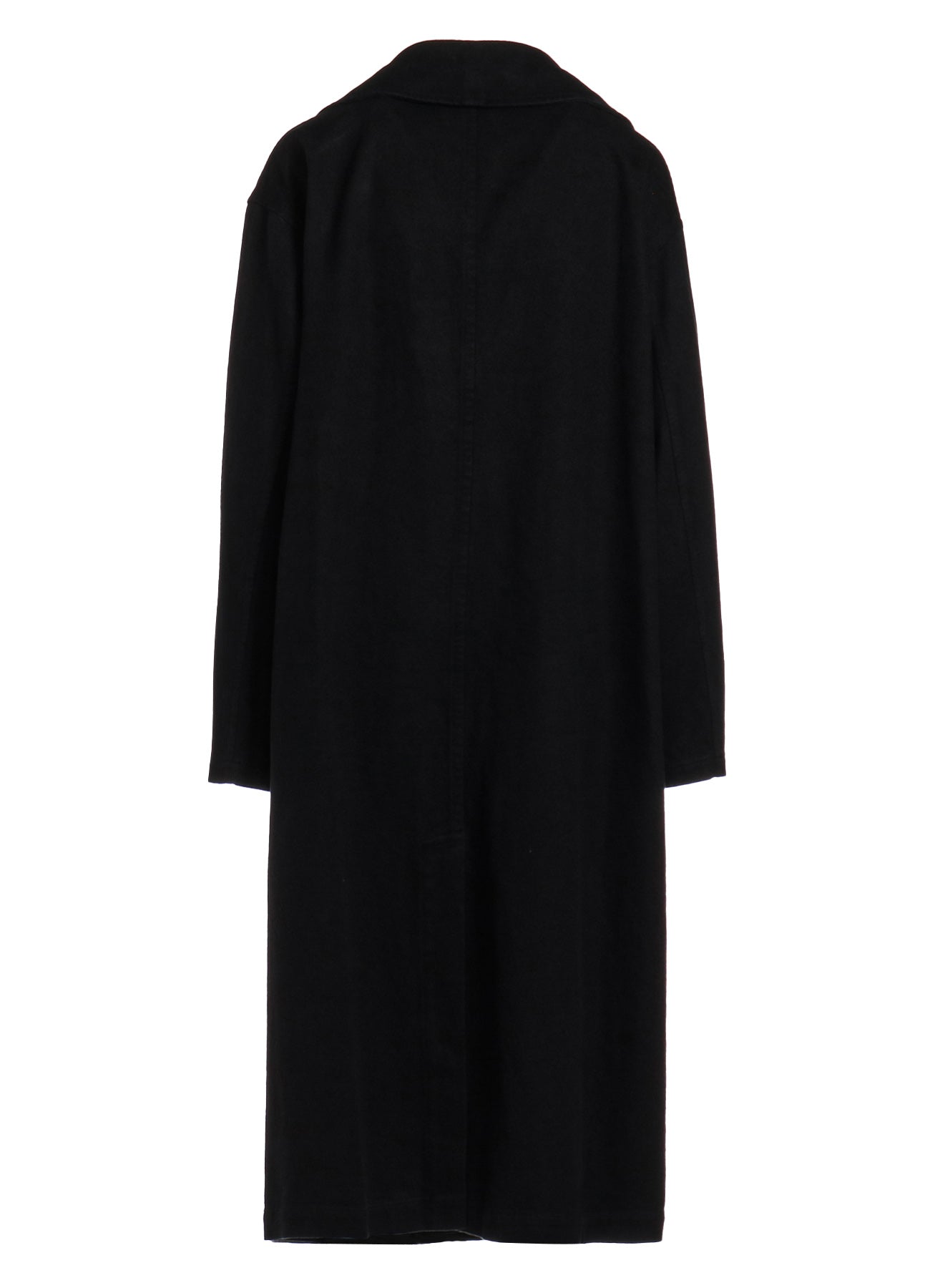 A cotton-linen gabardine coat with a unique left front placket design, washed with Original Charcoal for an aged appearance. The fabric retains its natural properties while providing softness due to the use of a softening agent. An internal belt helps maintain the silhouette when worn open.
