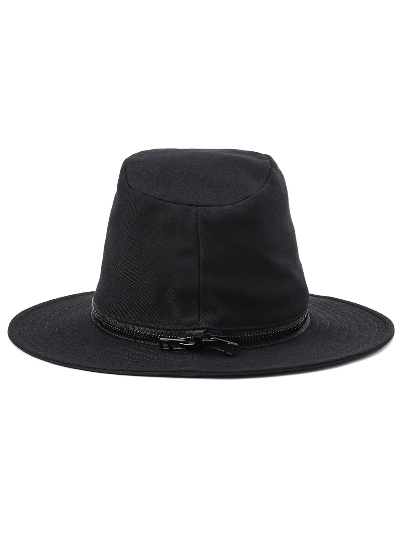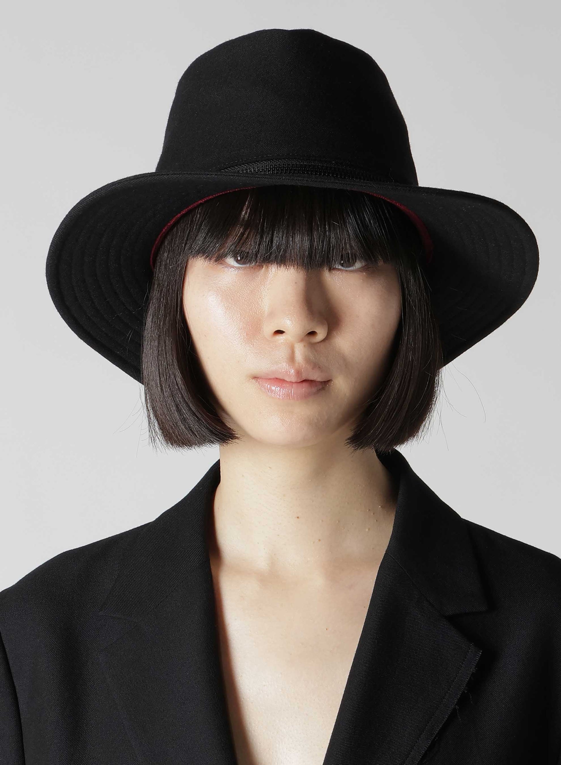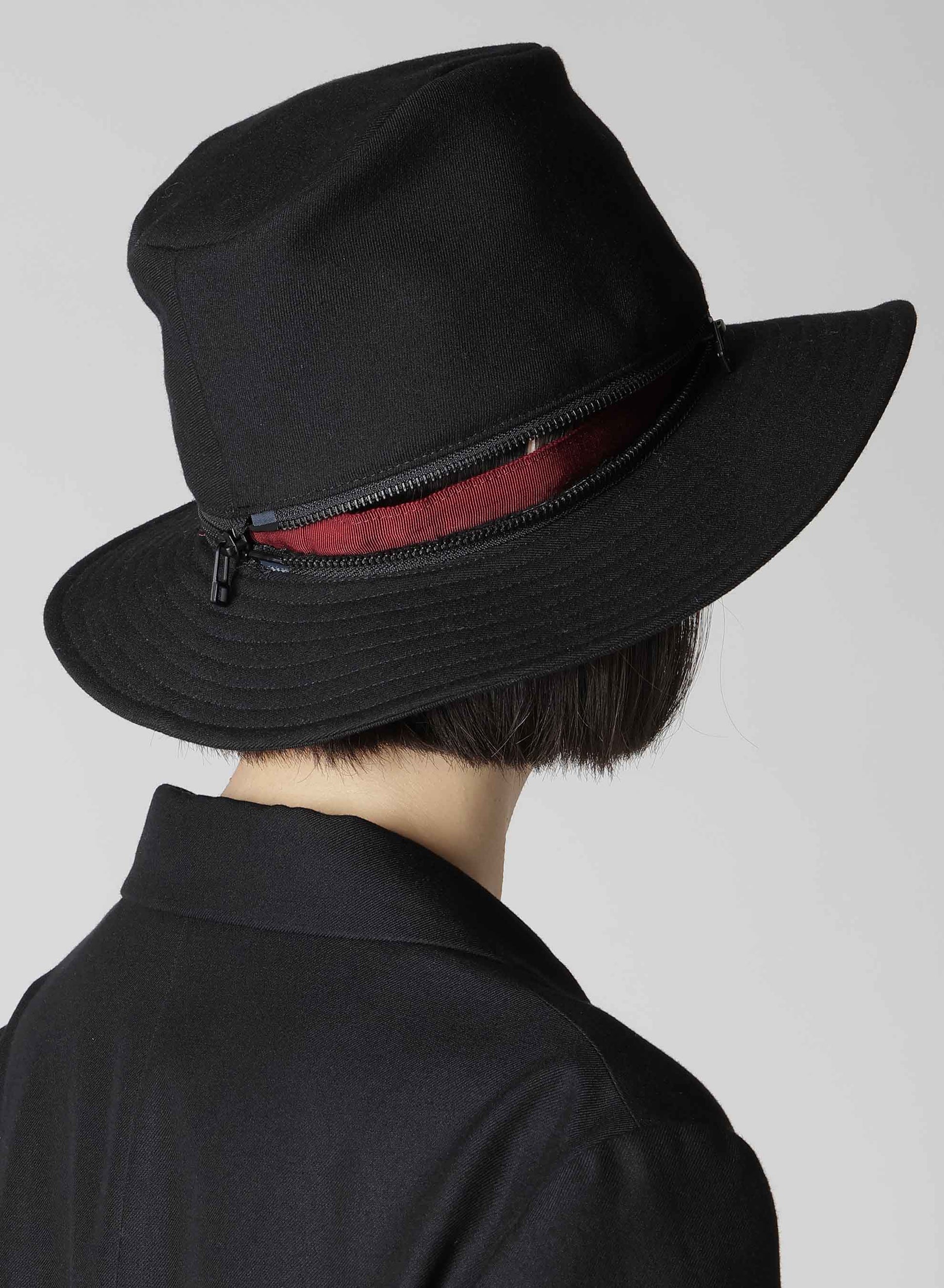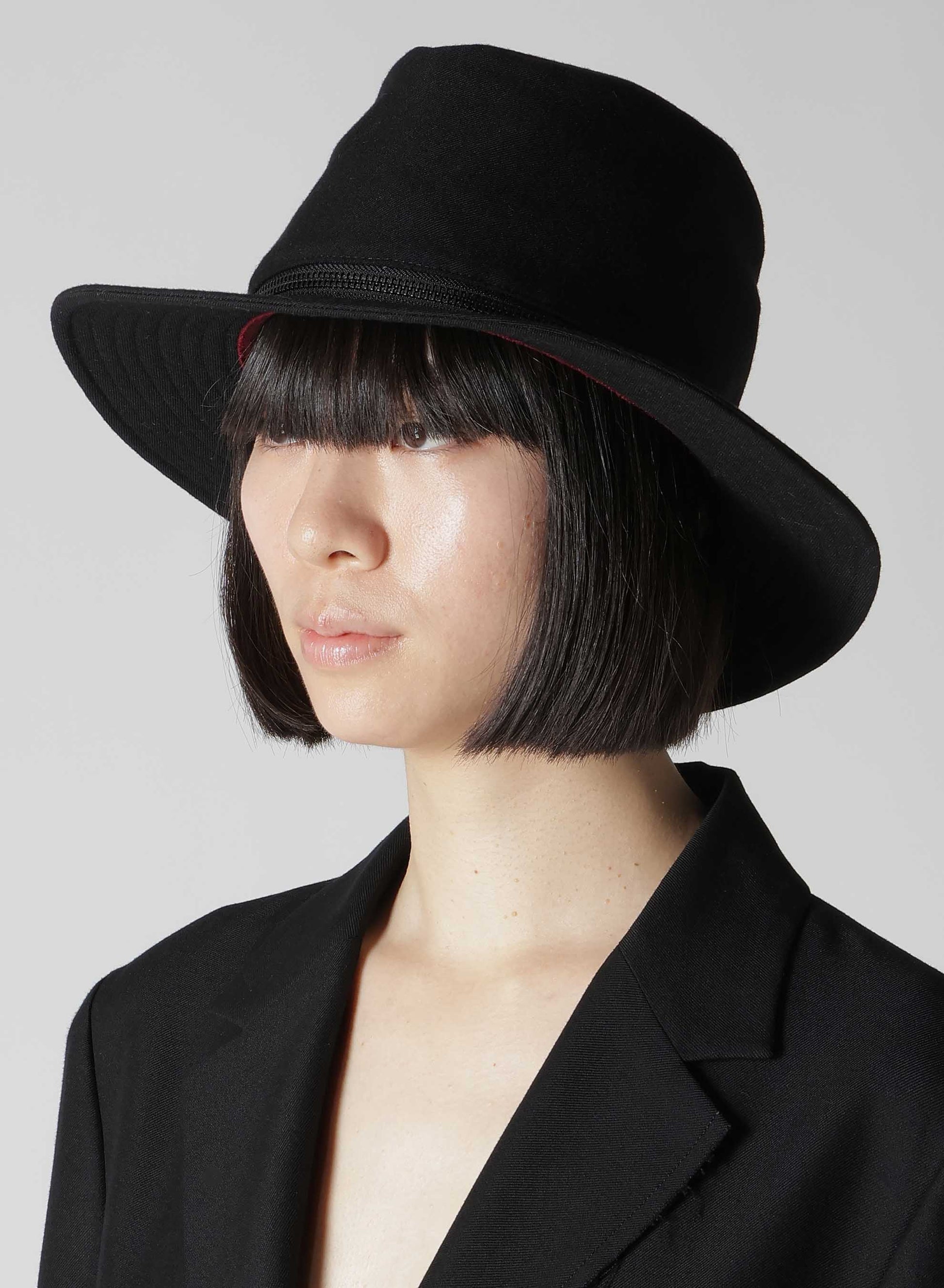 Transform your style with this unique mid-brim hat featuring a zipper detail. Unzip to reshape and customize your look, highlighting the red grosgrain tape inside for an extra touch. Suitable for formal wear when worn zipped up. Note that model images use sample items and might vary slightly in size and texture.