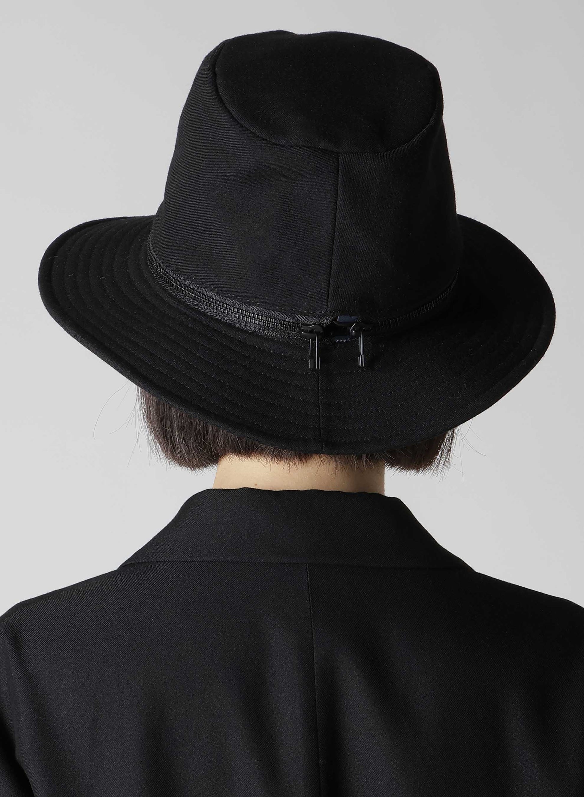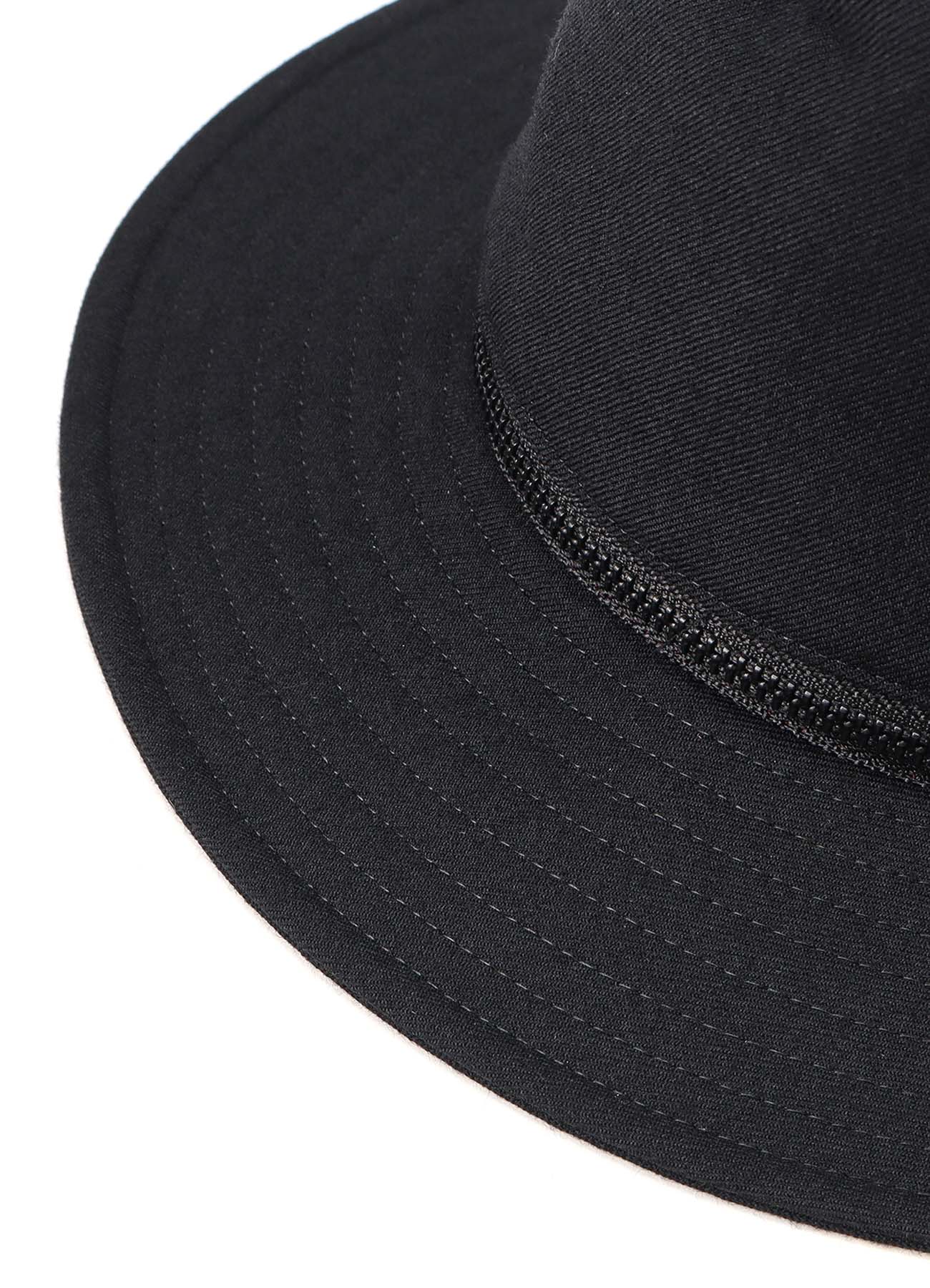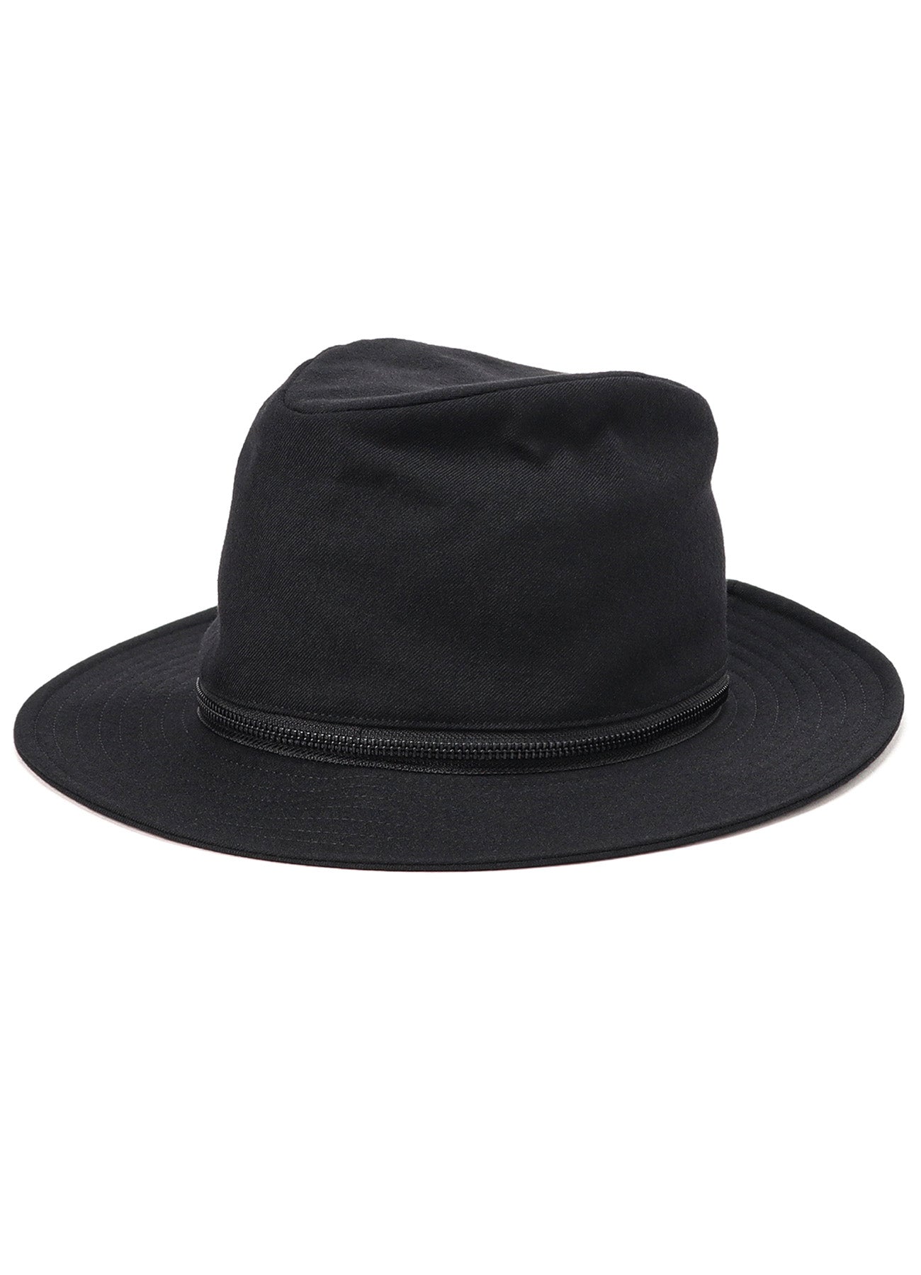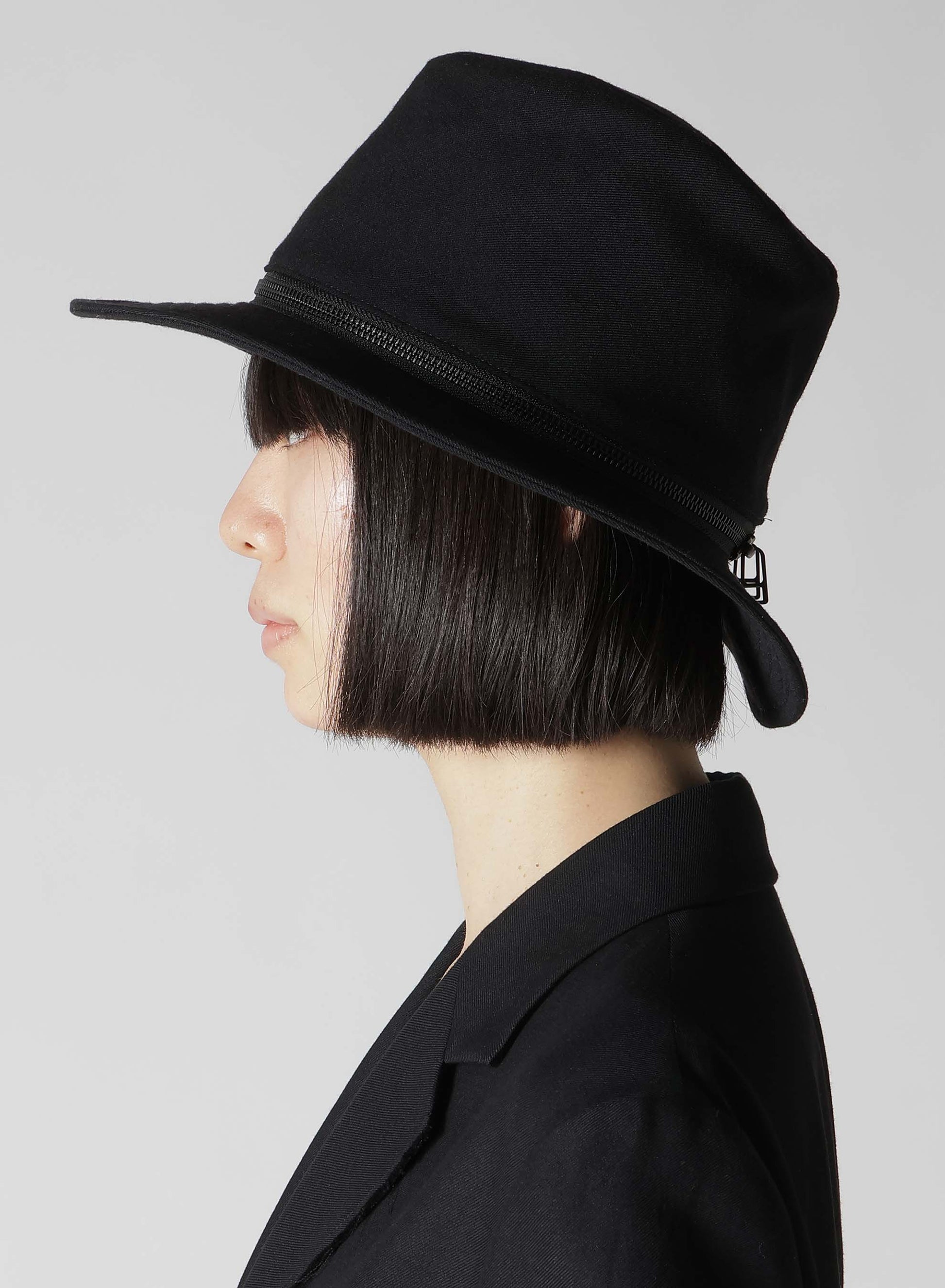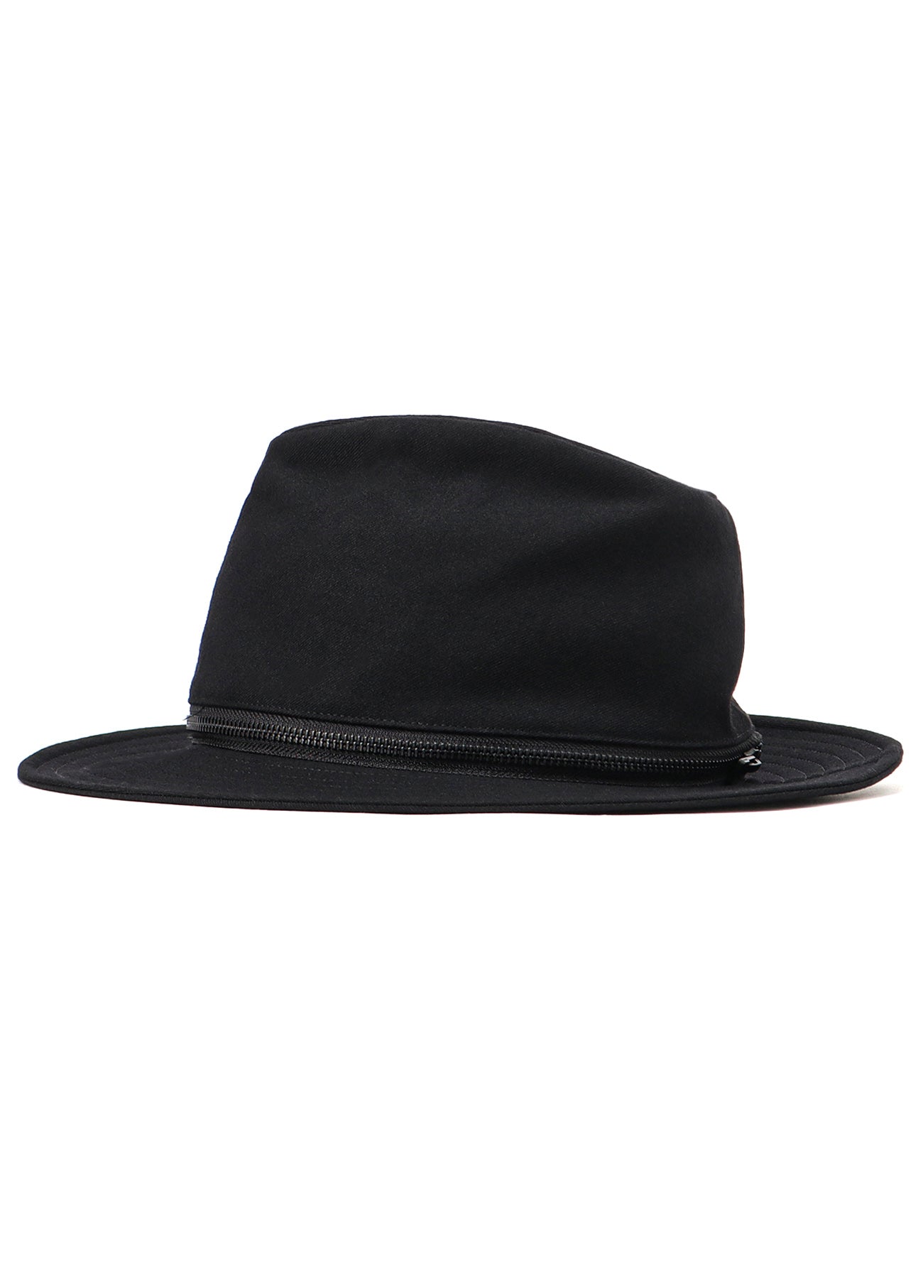 Transform your style with this unique mid-brim hat featuring a zipper detail. Unzip to reshape and customize your look, highlighting the red grosgrain tape inside for an extra touch. Suitable for formal wear when worn zipped up. Note that model images use sample items and might vary slightly in size and texture.