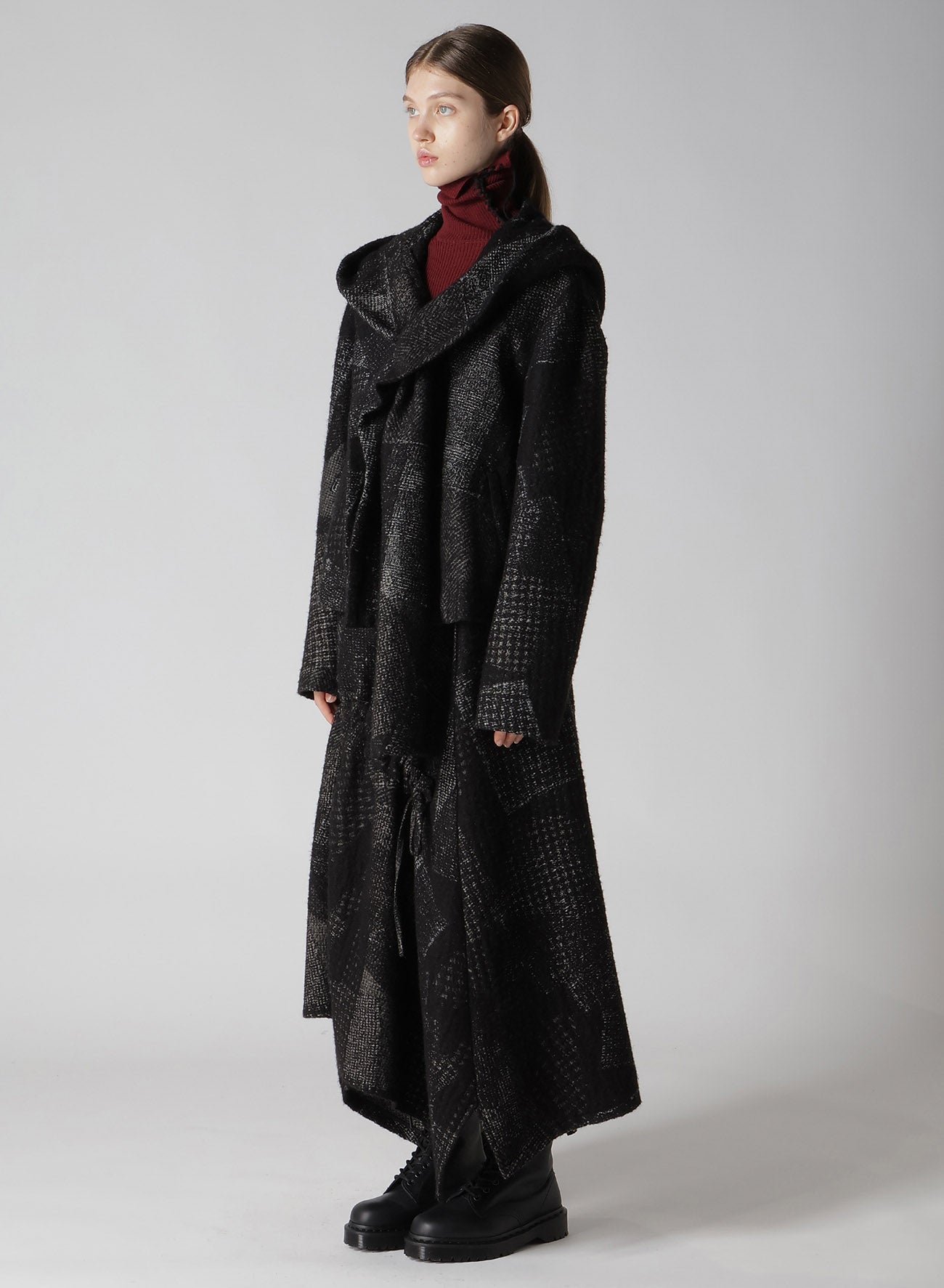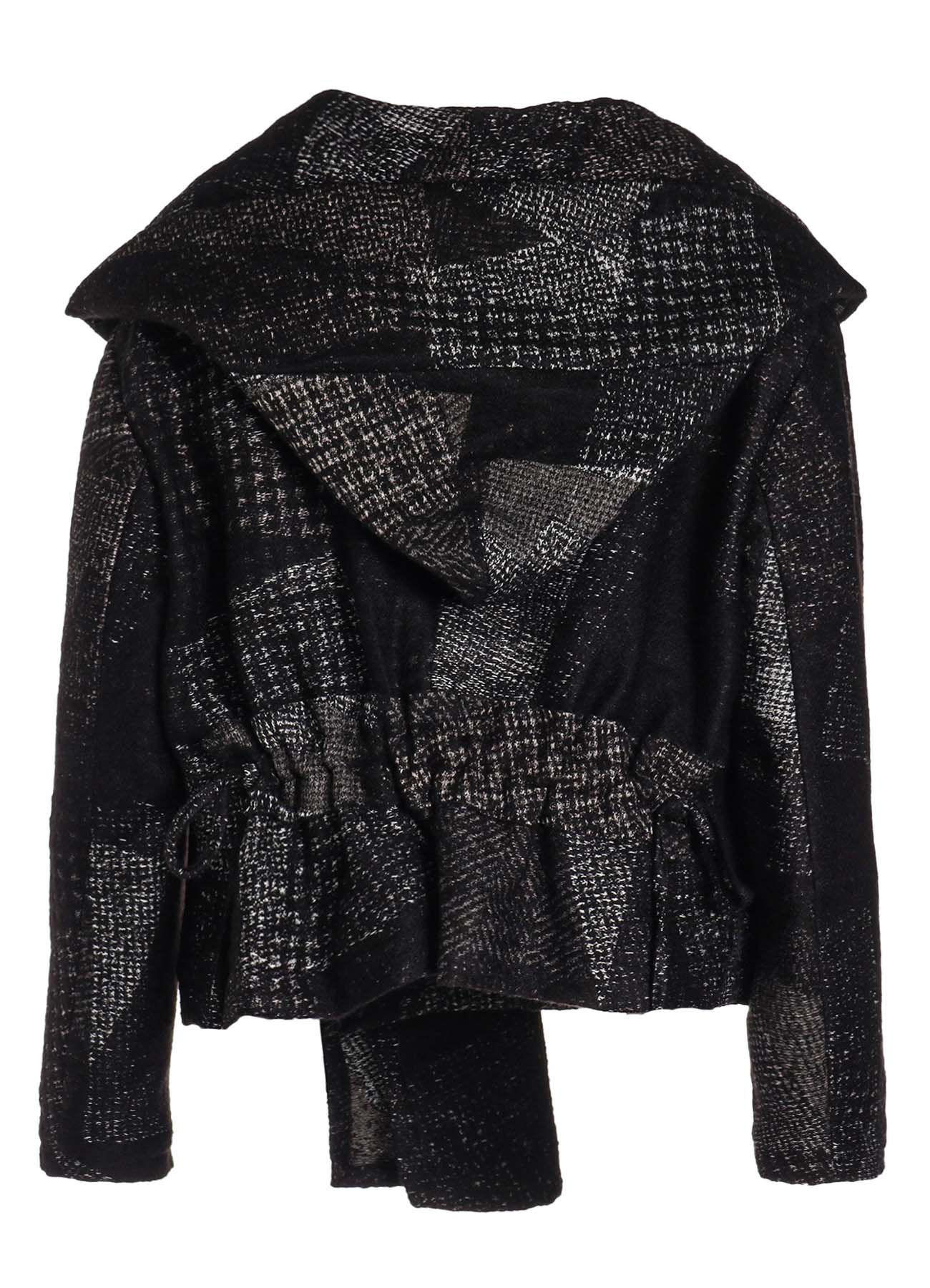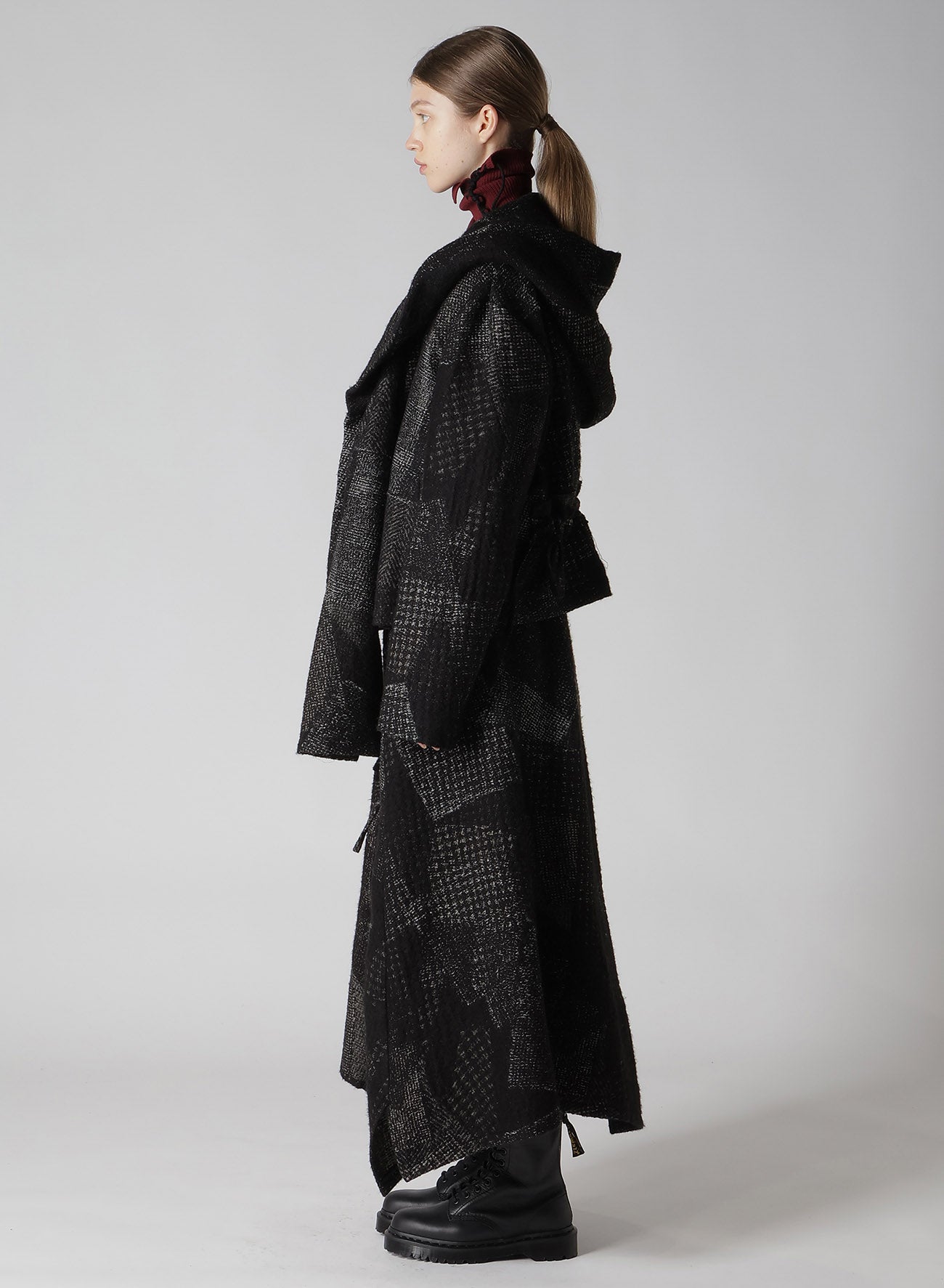 This hoodie jacket features a complex blend of houndstooth, herringbone, and check patterns, finished with a warm, plush texture. The long stole from the hood can be threaded through a front loop, and the back features a drawstring for adjustable fit. Pair with matching bottoms for a complete look.
