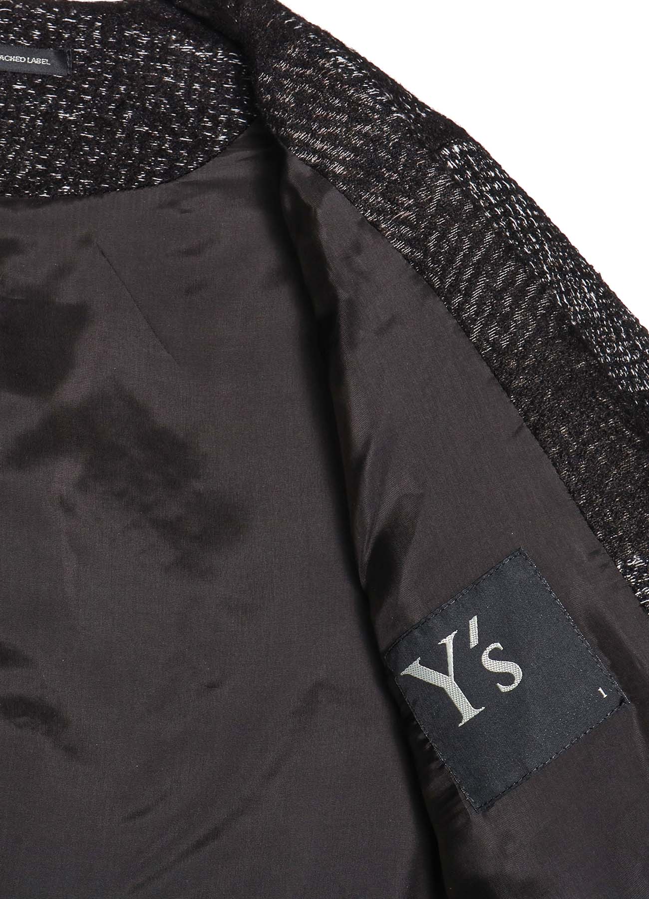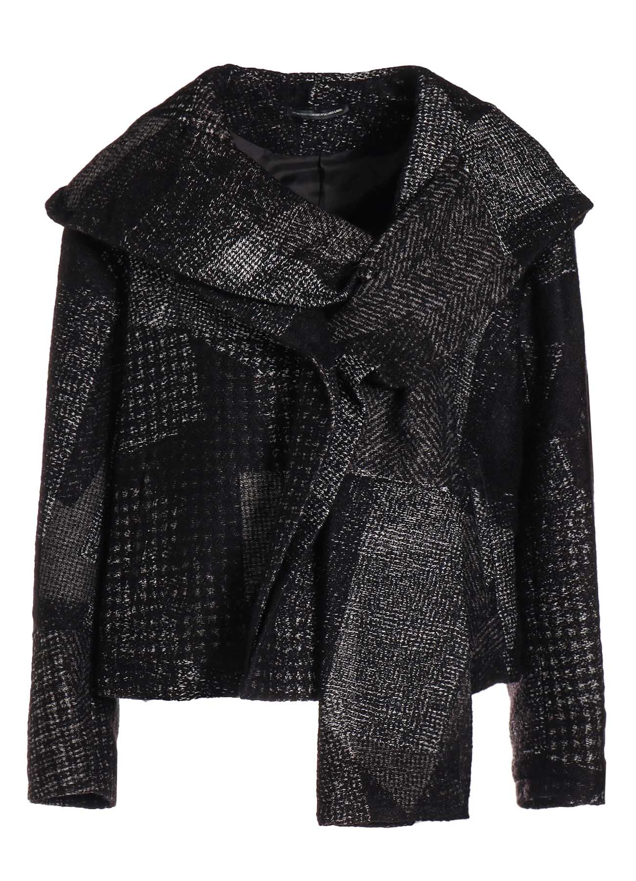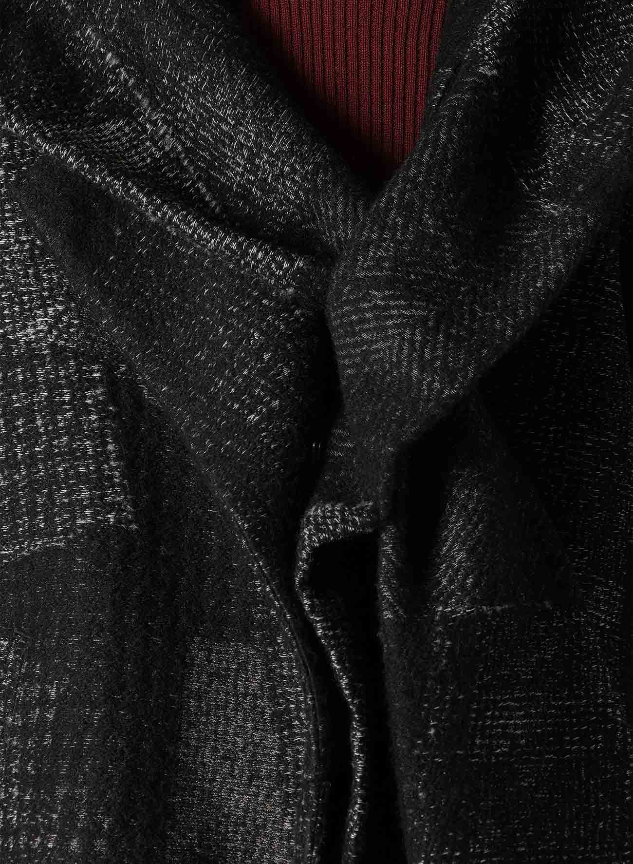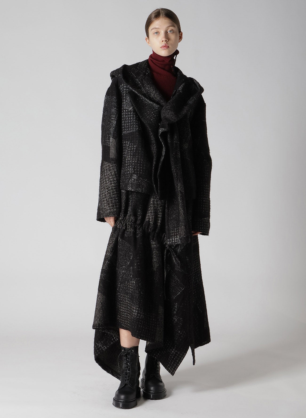 This hoodie jacket features a complex blend of houndstooth, herringbone, and check patterns, finished with a warm, plush texture. The long stole from the hood can be threaded through a front loop, and the back features a drawstring for adjustable fit. Pair with matching bottoms for a complete look.