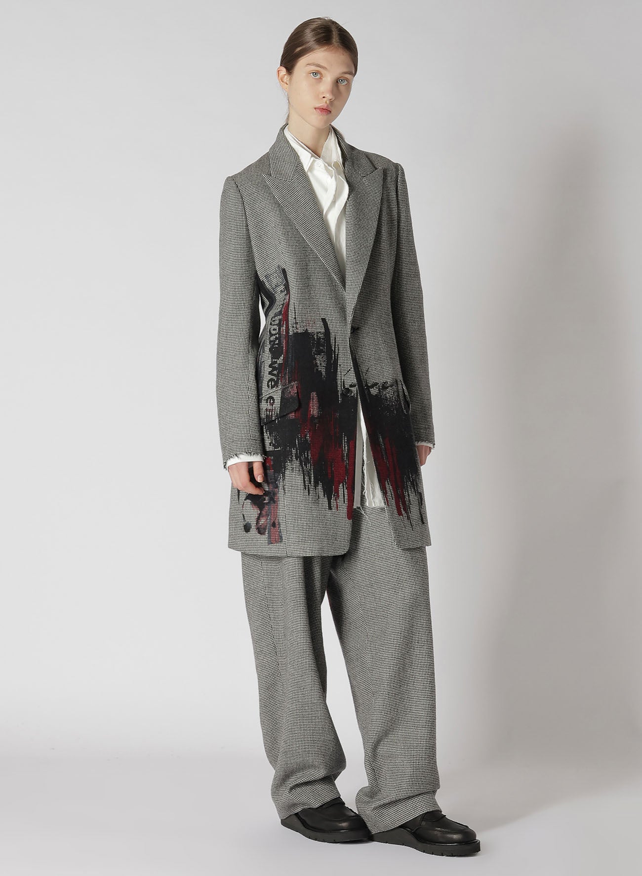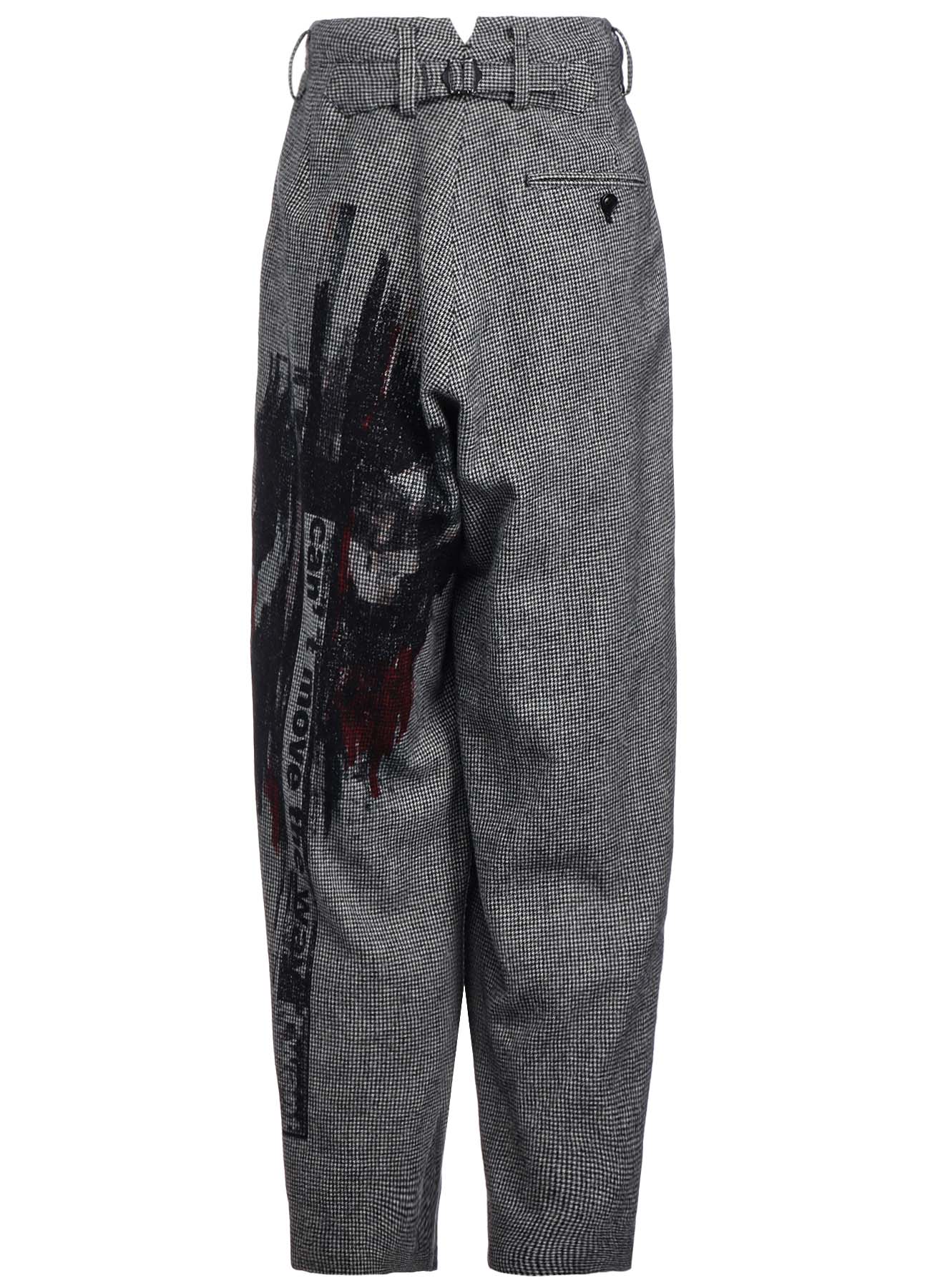 Wool houndstooth wide pants with a voluminous and warm texture perfect for autumn and winter. The pants feature a print with English messages and a woman's drawing on the houndstooth pattern. The clean waistband and wide silhouette make it a versatile piece that pairs well with compact jackets or coats.