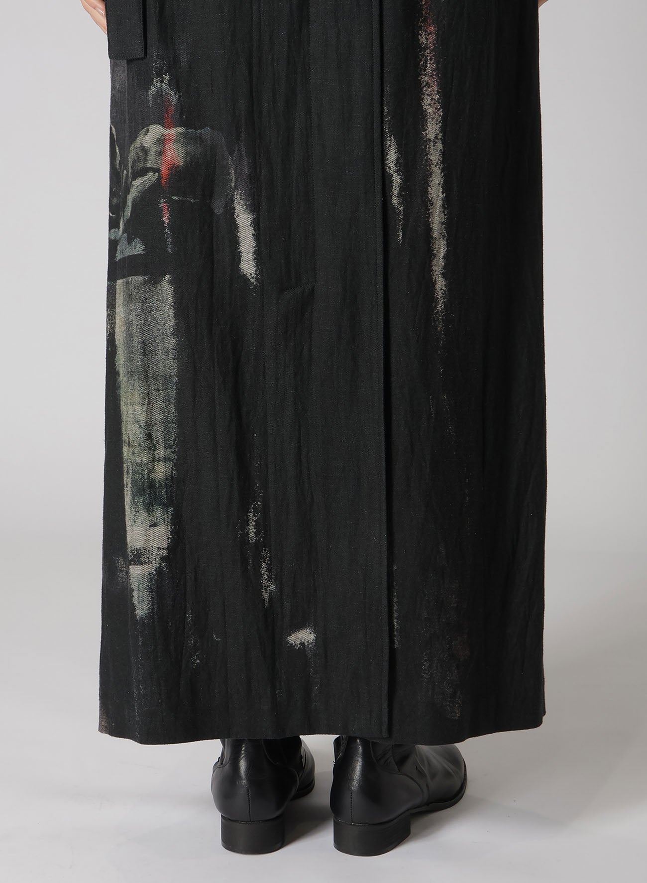 This flowing skirt is made from cotton and linen, blending the absorbency of flax with the softness of cotton. The design integrates motifs of hands and lips, inspired by the play of light from various angles. The double-layered belt creates drapery, lending motion to its simplistic straight lines.