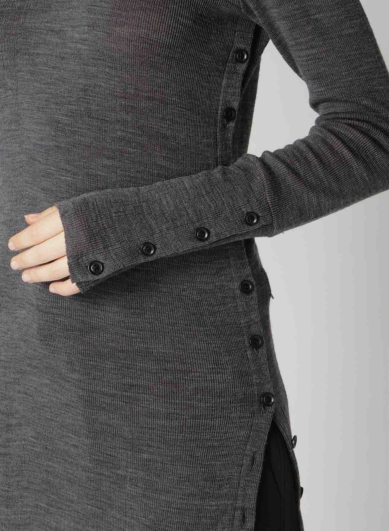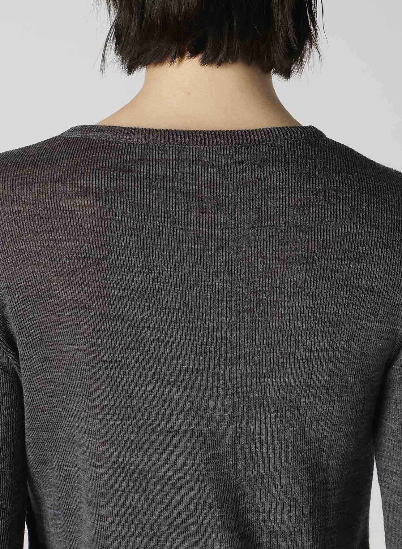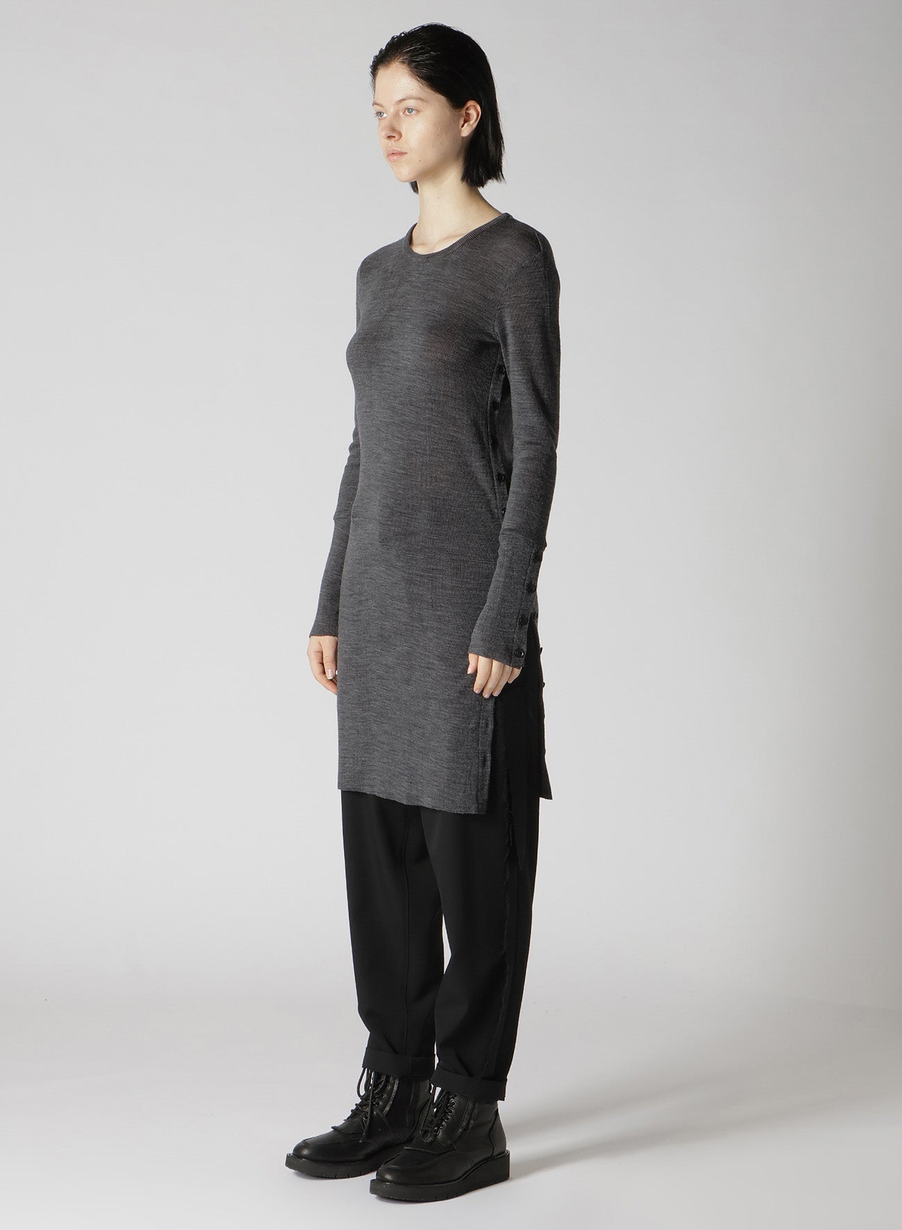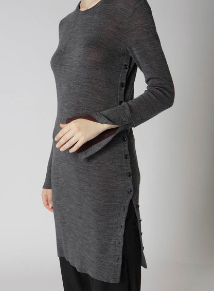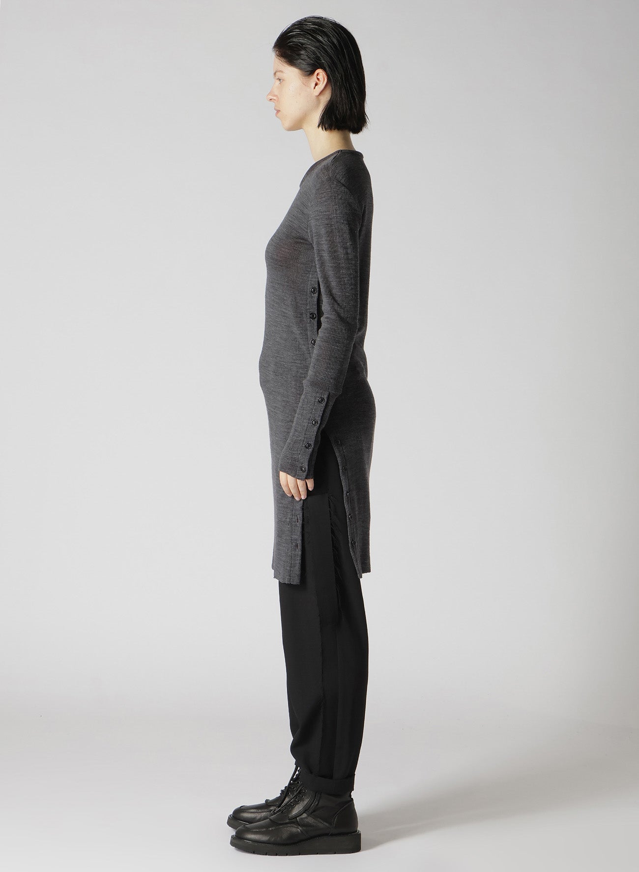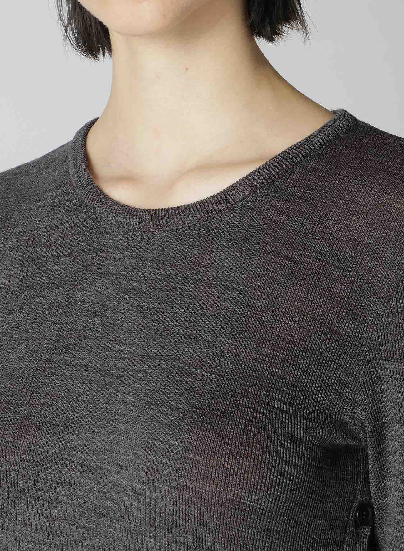 This 2-tone ribbed crewneck top, made from superfine extra merino wool, offers a slim fit with excellent stretch for comfort. Its silhouette can be transformed by buttoning on the left side and cuffs, adding a unique design element.