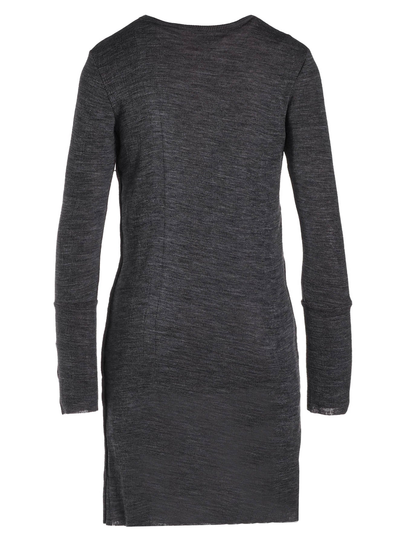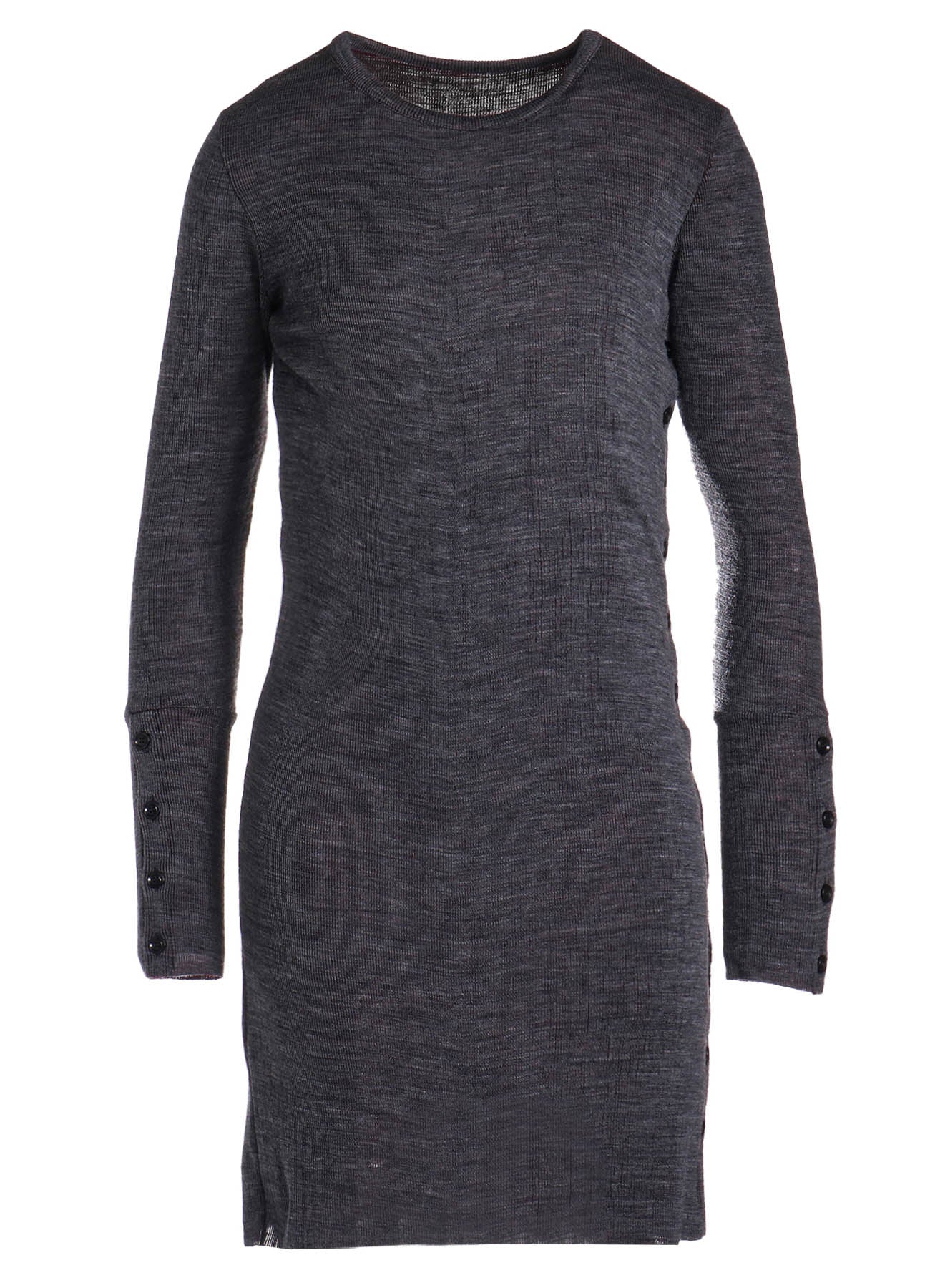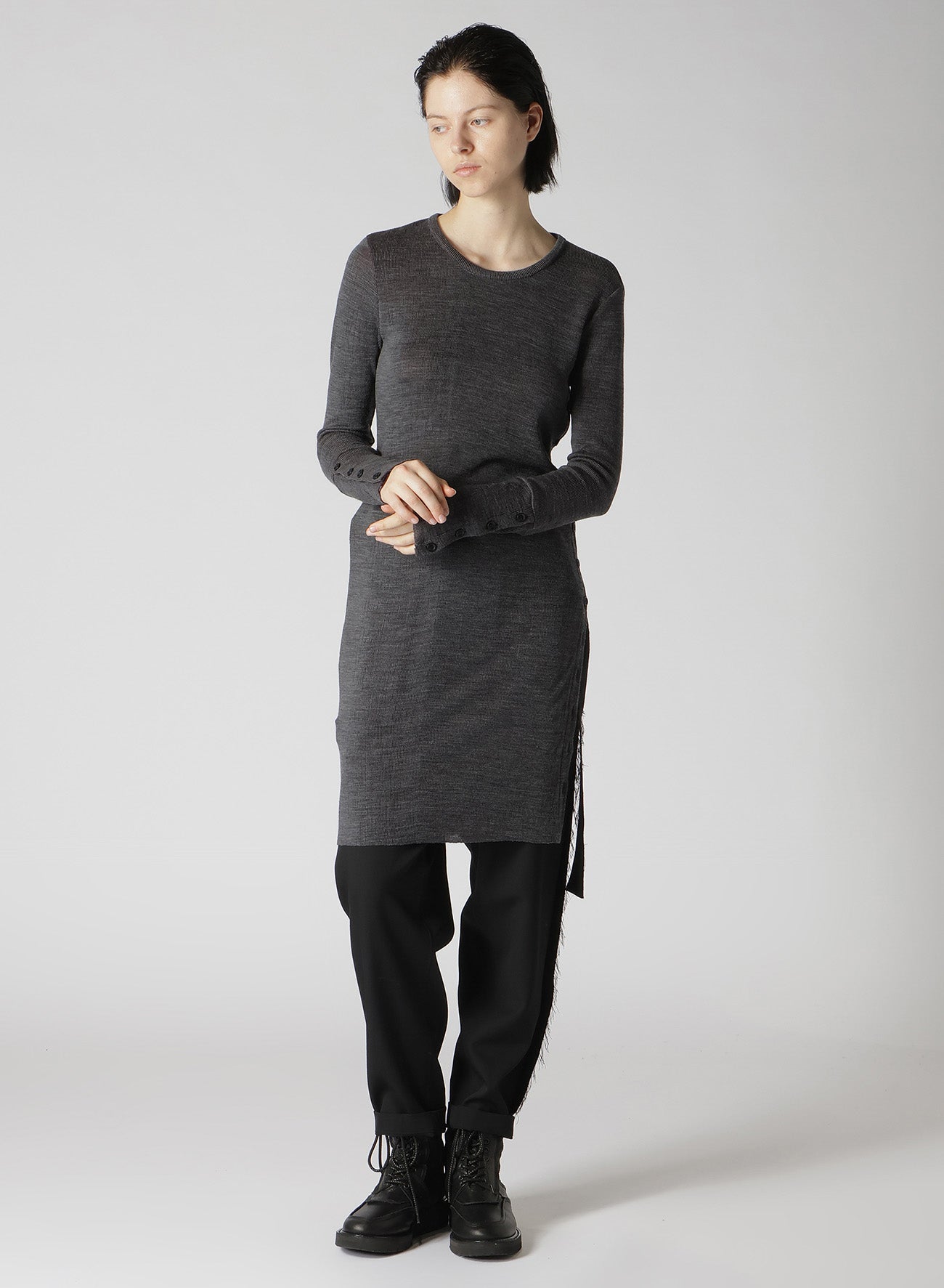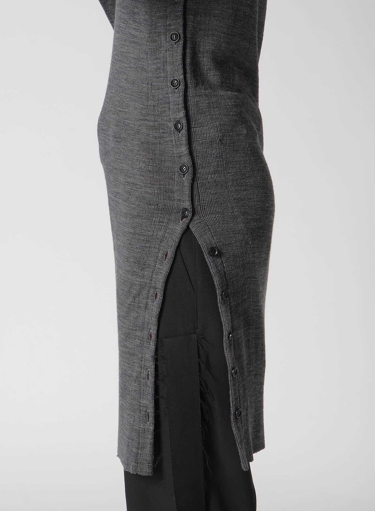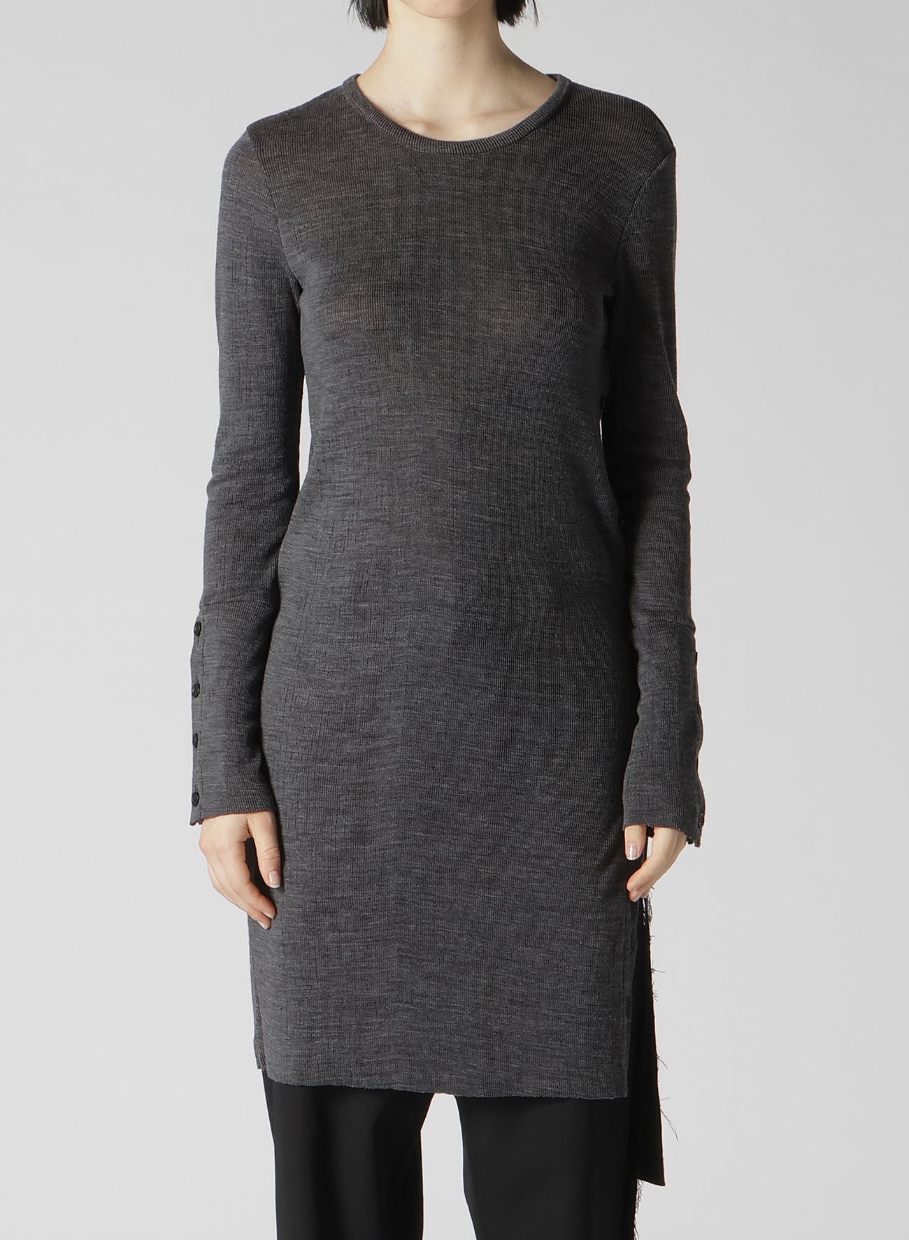 This 2-tone ribbed crewneck top, made from superfine extra merino wool, offers a slim fit with excellent stretch for comfort. Its silhouette can be transformed by buttoning on the left side and cuffs, adding a unique design element.