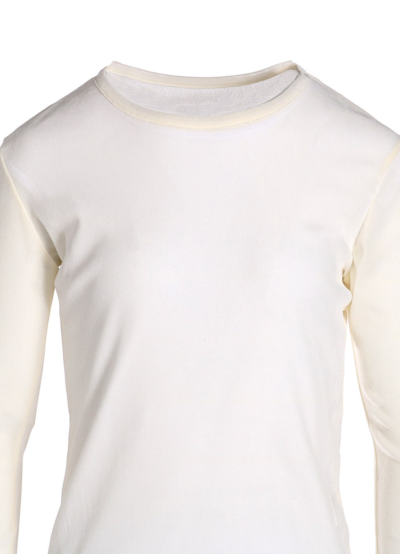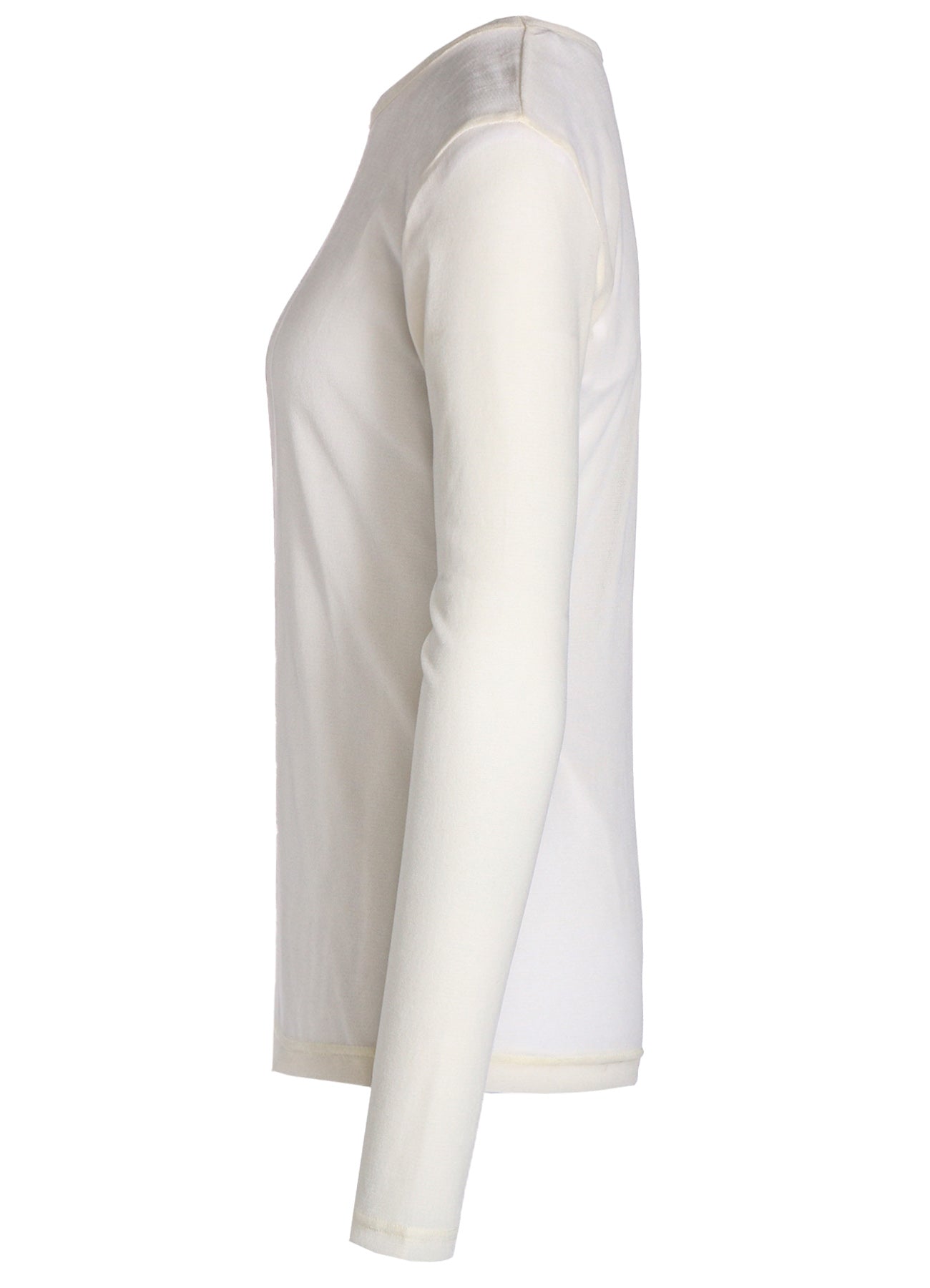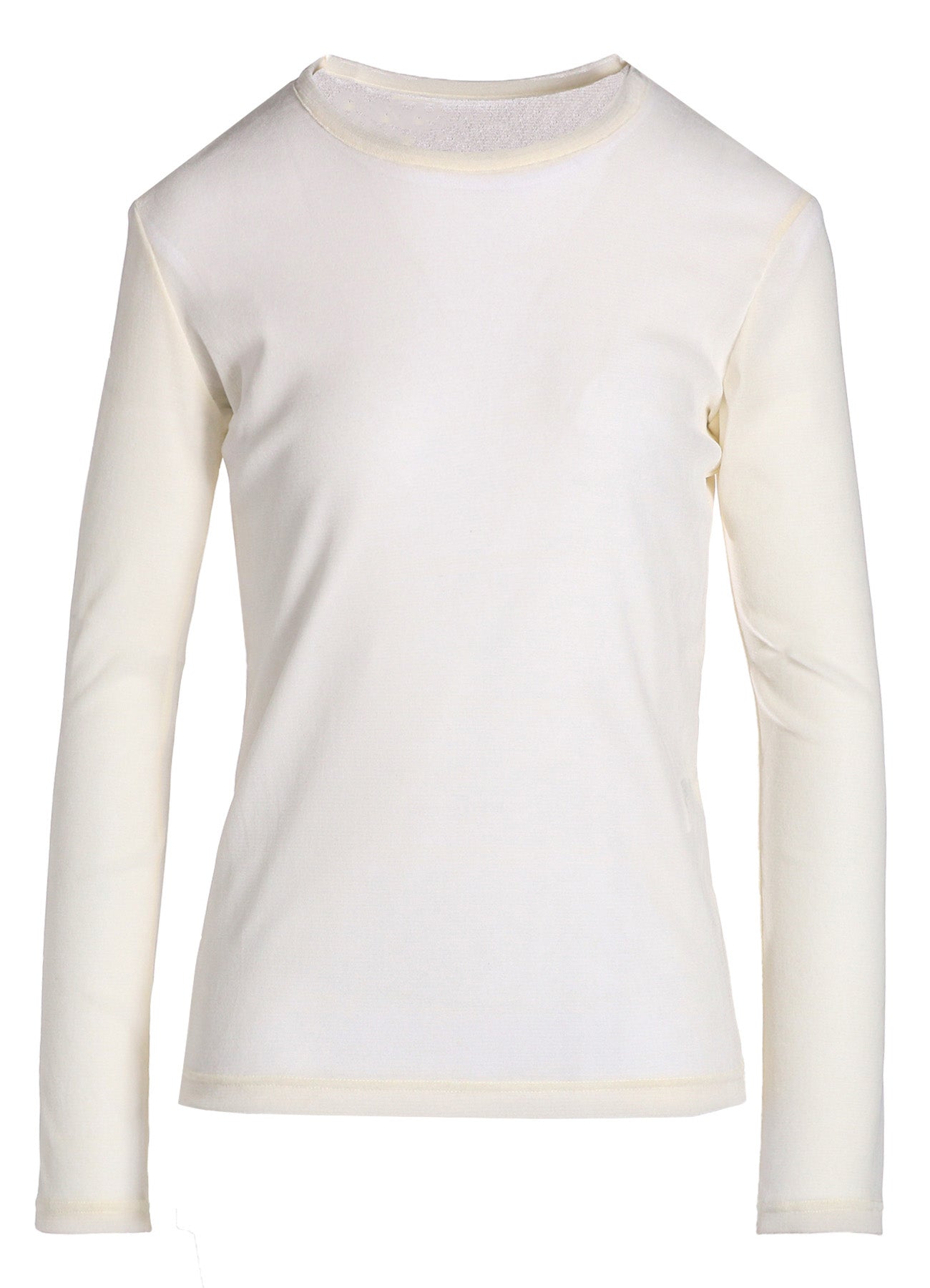 This long-sleeve top made from tulle material features a supple, glossy fabric, making it suitable for various occasions. Its sleek silhouette makes it ideal as an inner wear for dresses or jackets.