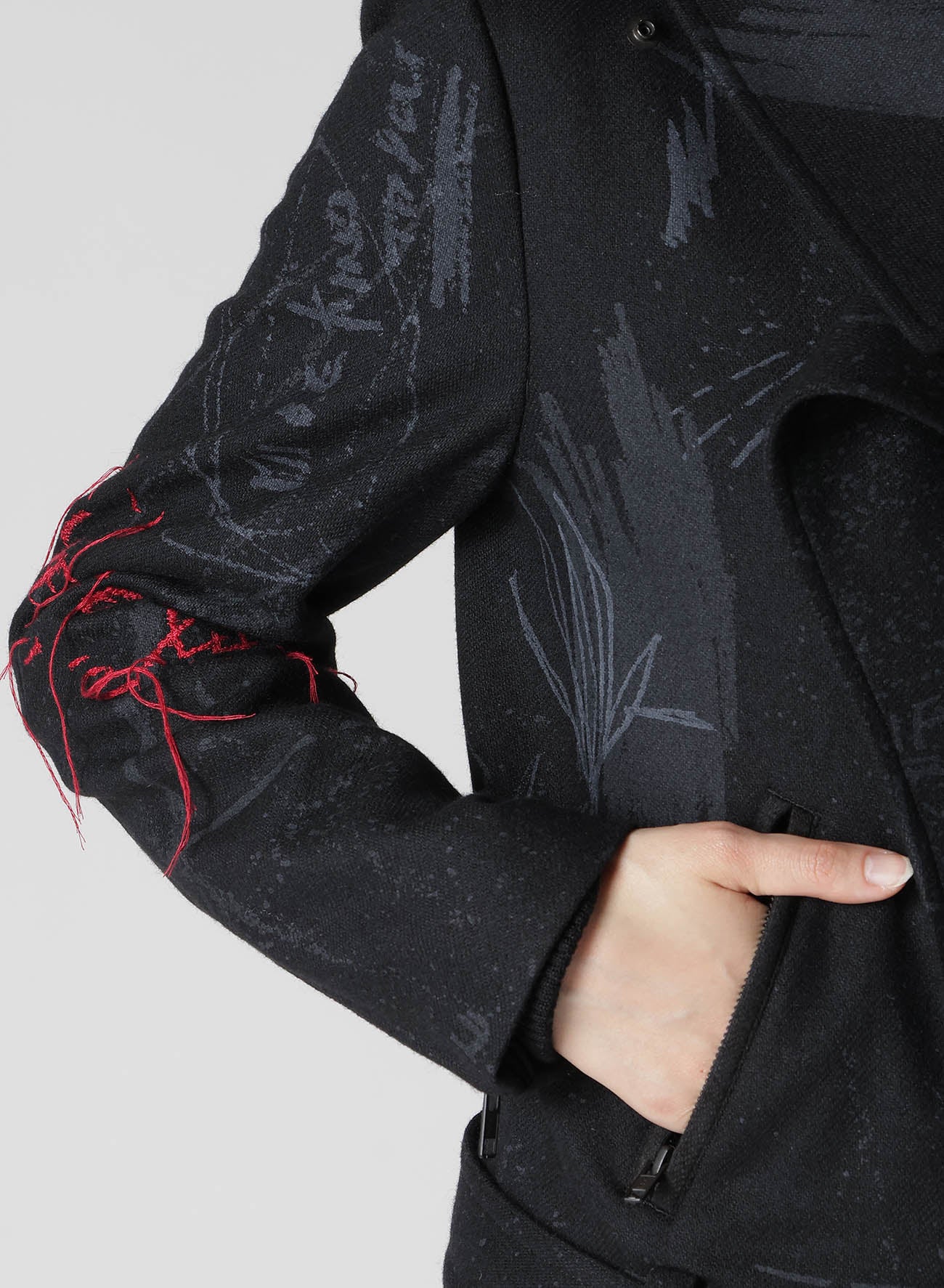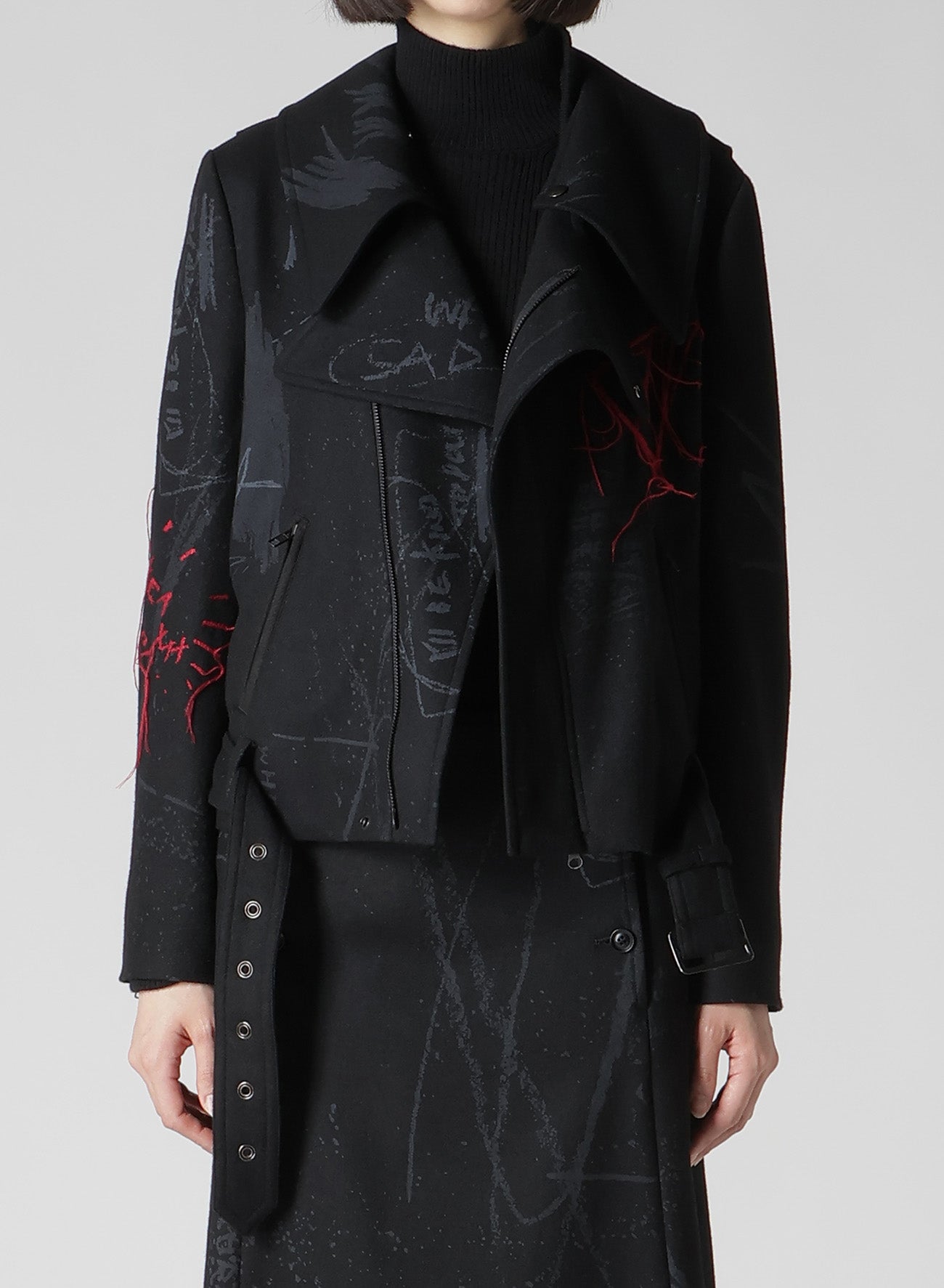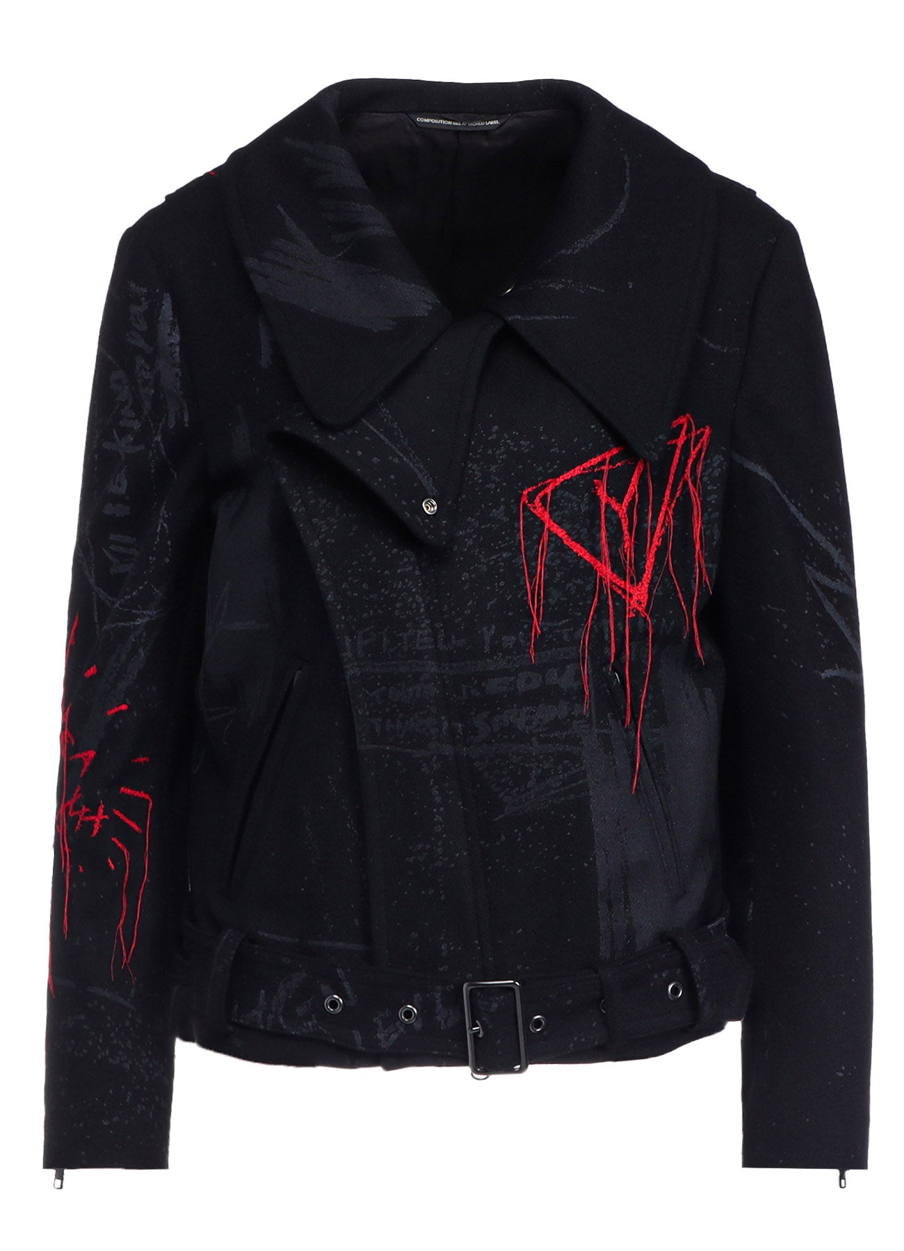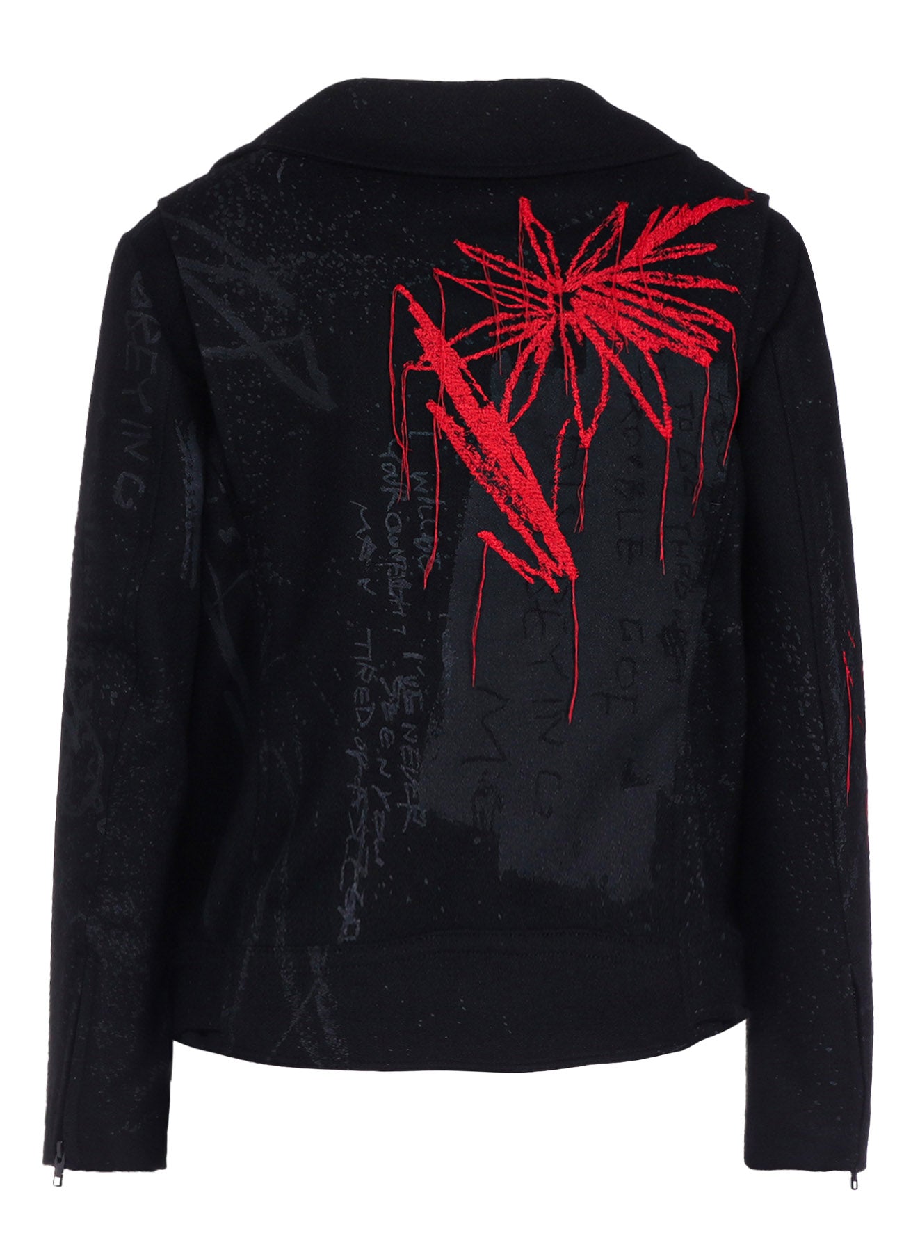 This motorcycle jacket made of wool flannel stands out with printed lyrics and a "Y" logo, topped by red embroidery. It features a unique collar design and a concealed zipper front for a sleek look. Ideal for those seeking distinctive style and craftsmanship.