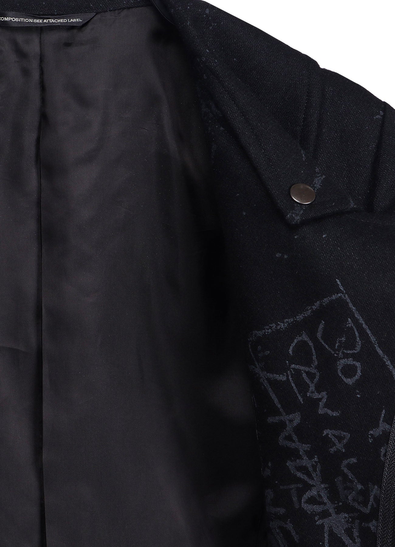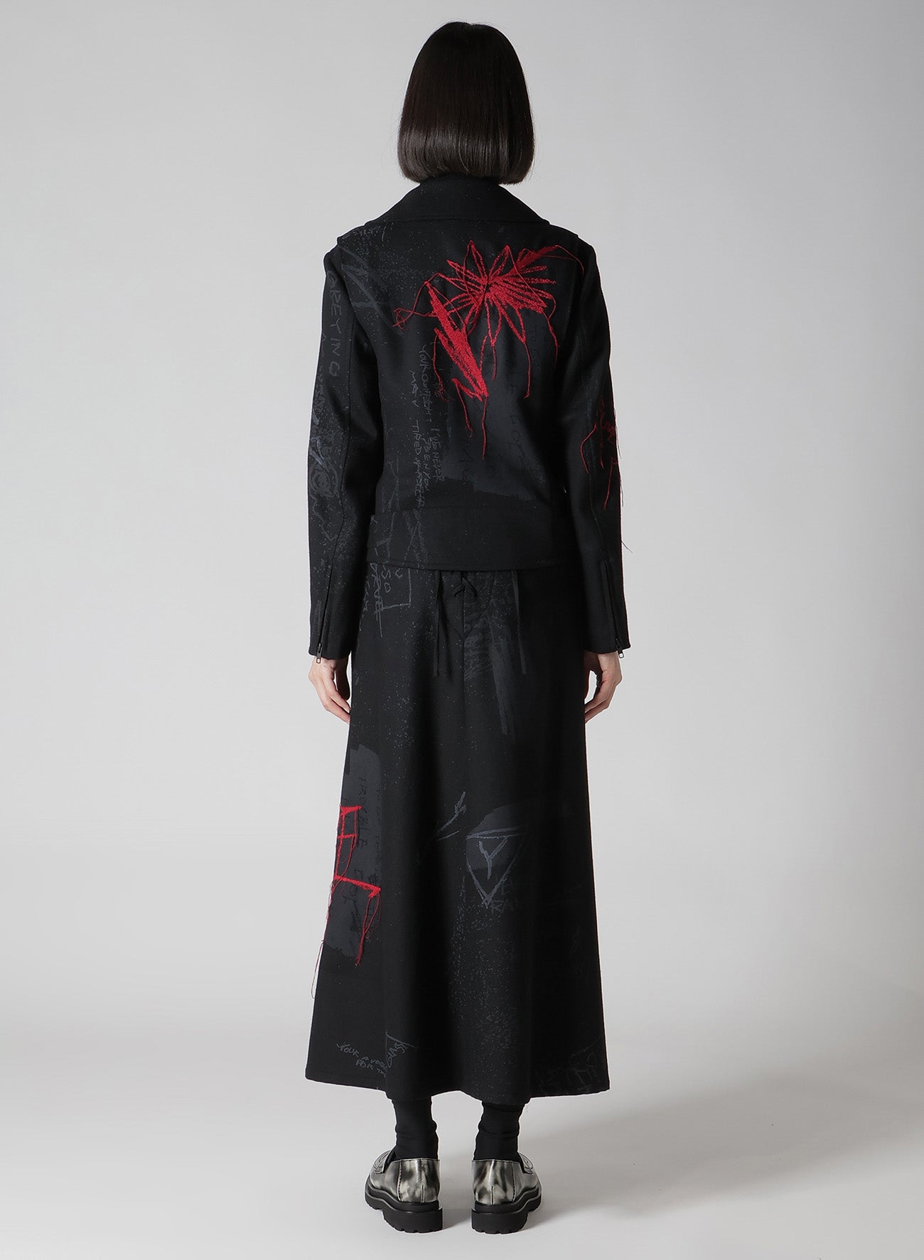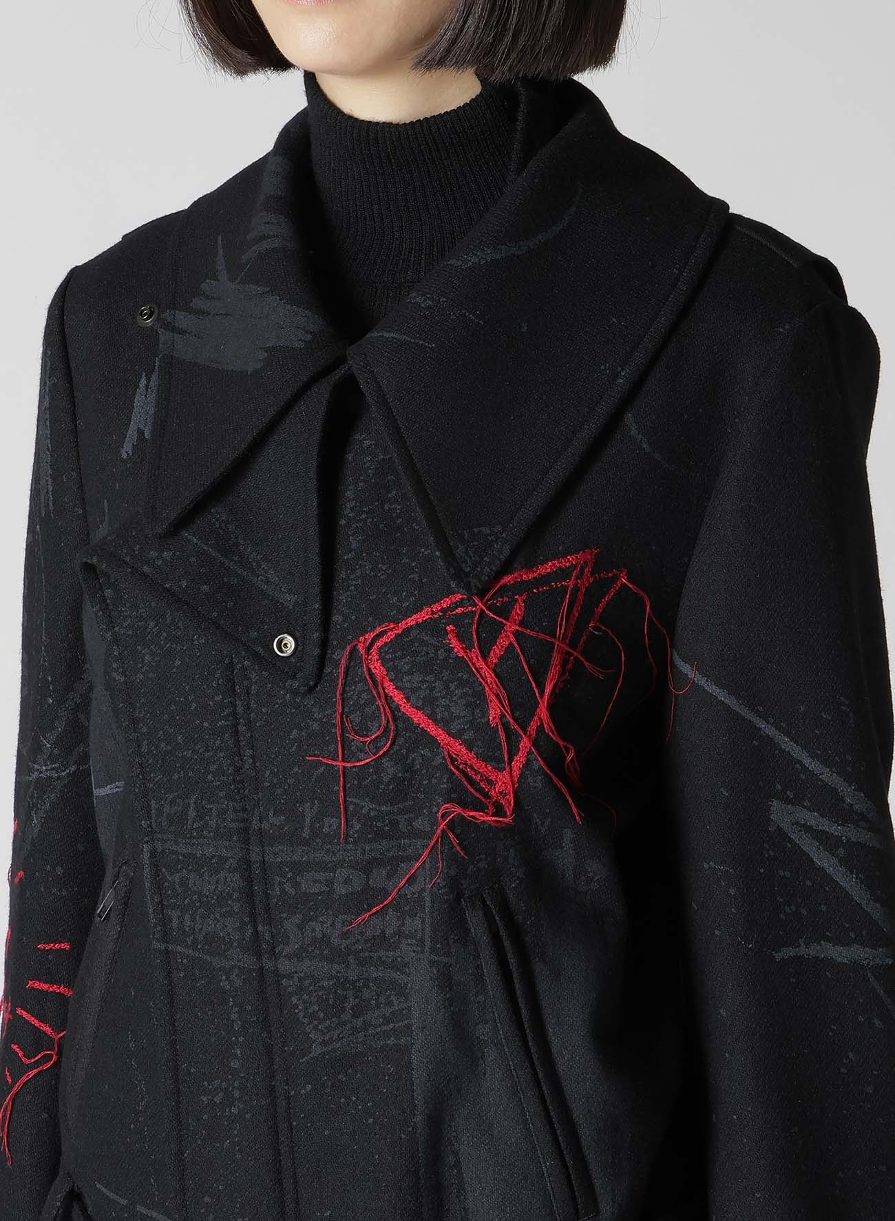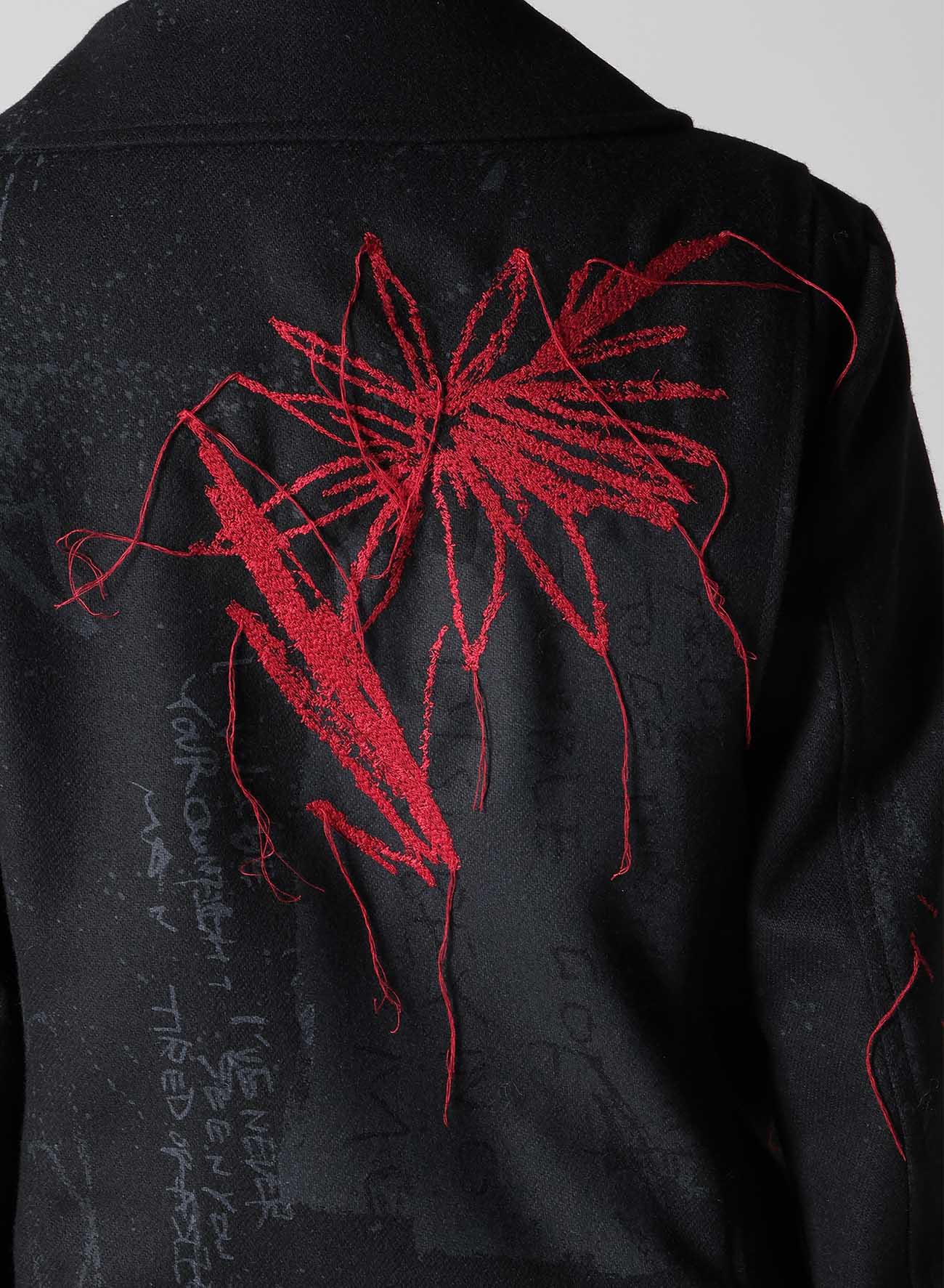 This motorcycle jacket made of wool flannel stands out with printed lyrics and a "Y" logo, topped by red embroidery. It features a unique collar design and a concealed zipper front for a sleek look. Ideal for those seeking distinctive style and craftsmanship.