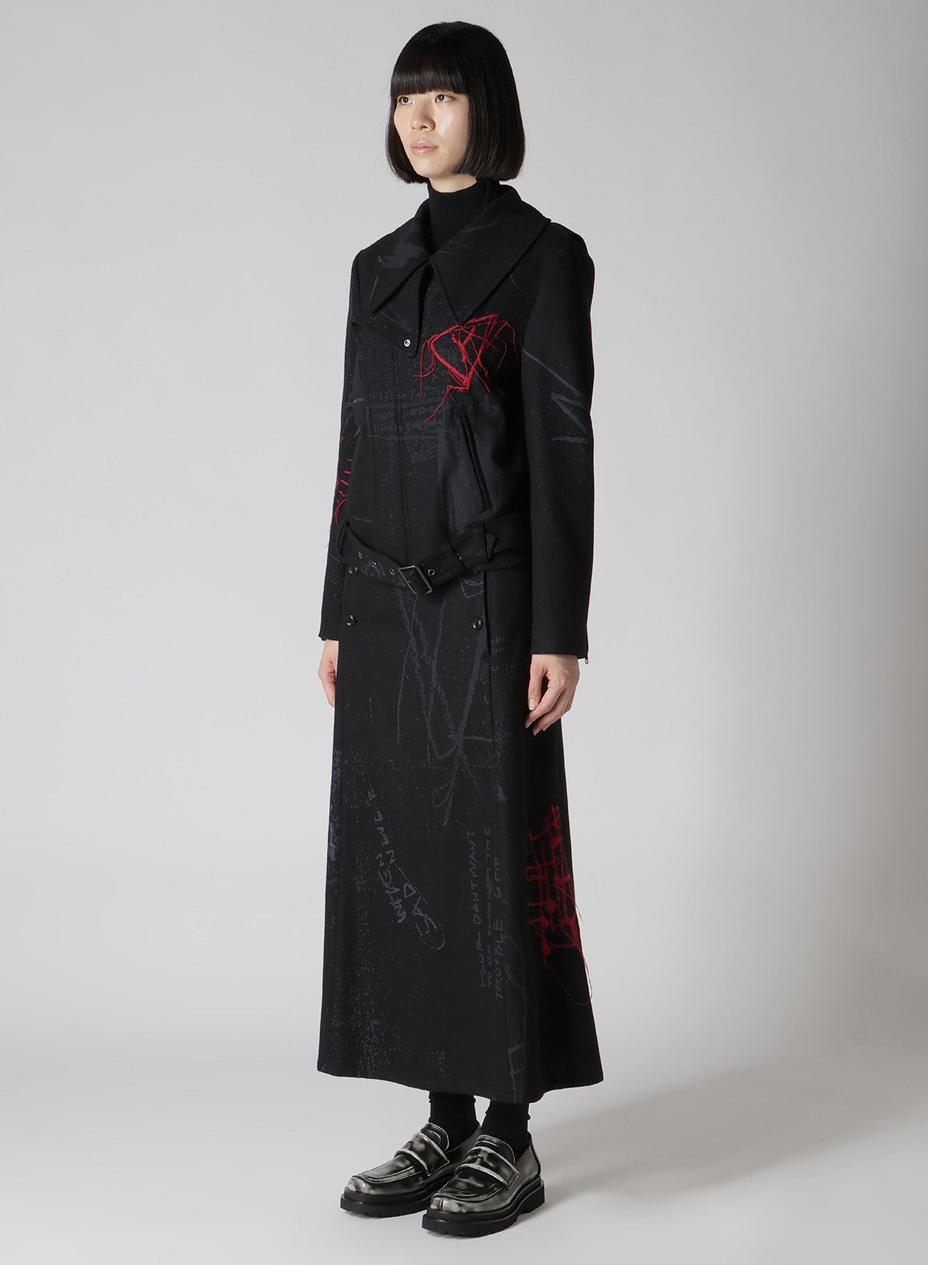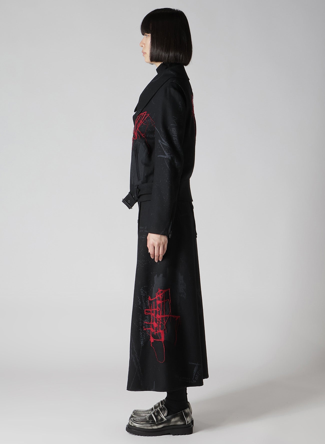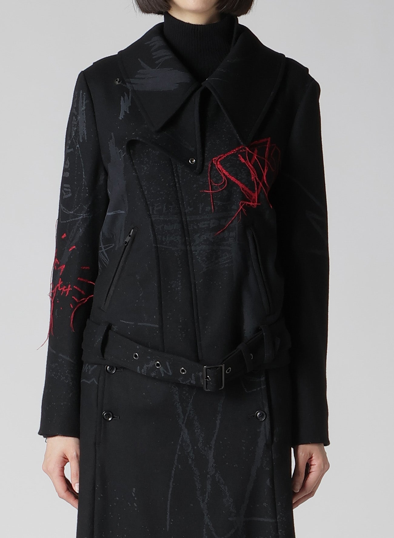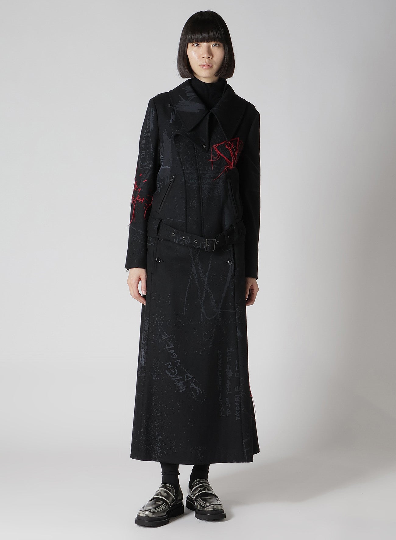 This motorcycle jacket made of wool flannel stands out with printed lyrics and a "Y" logo, topped by red embroidery. It features a unique collar design and a concealed zipper front for a sleek look. Ideal for those seeking distinctive style and craftsmanship.