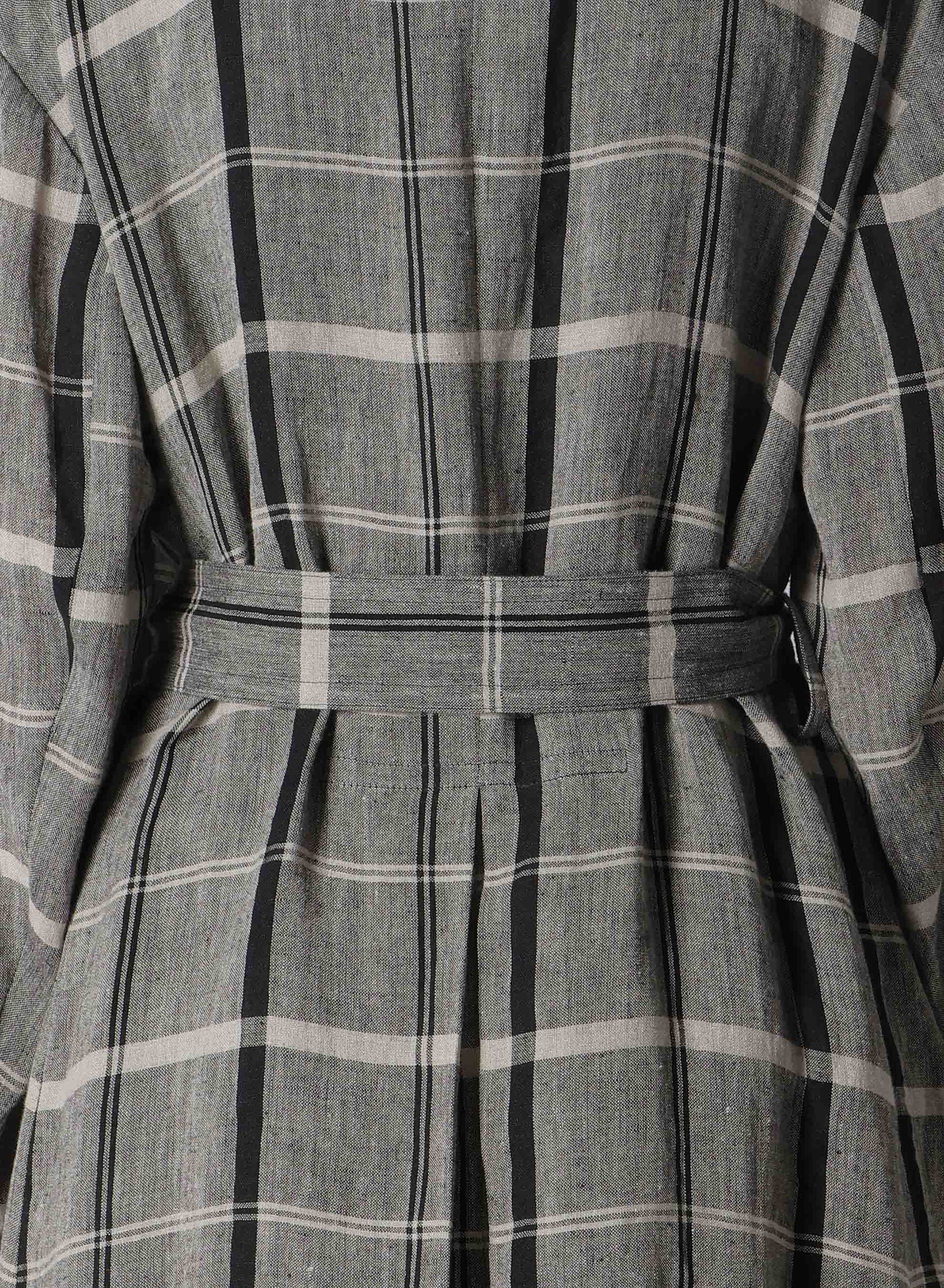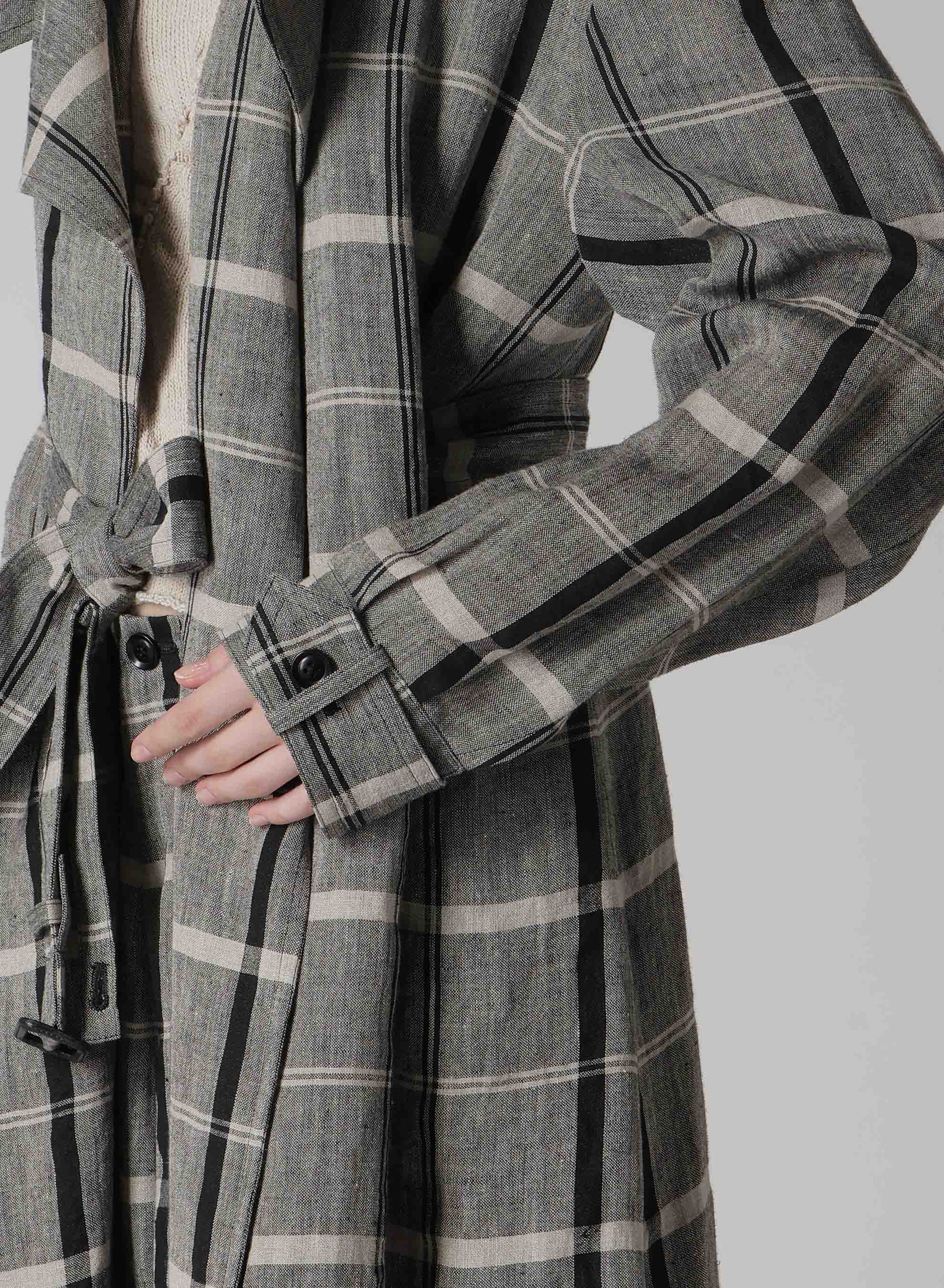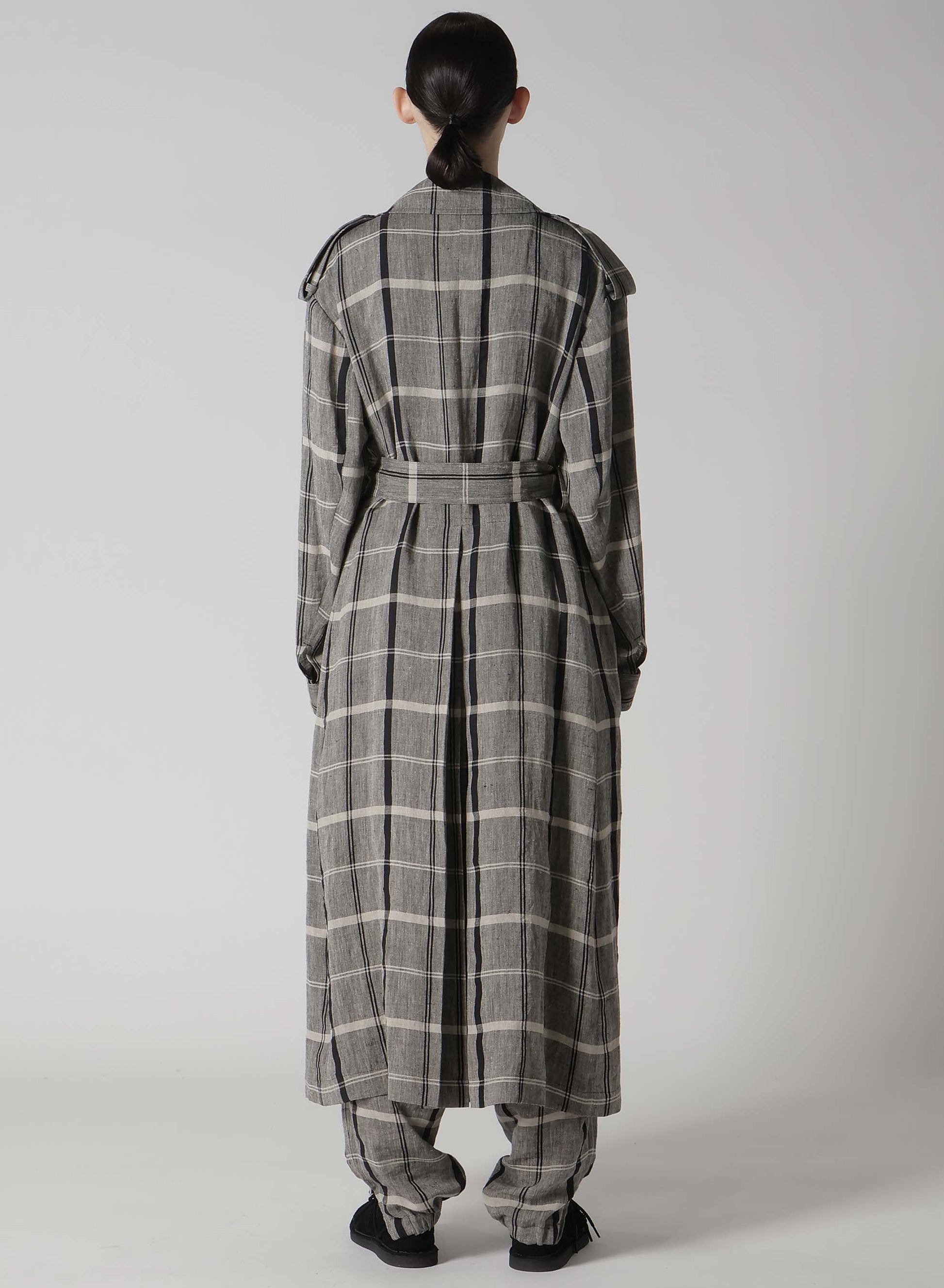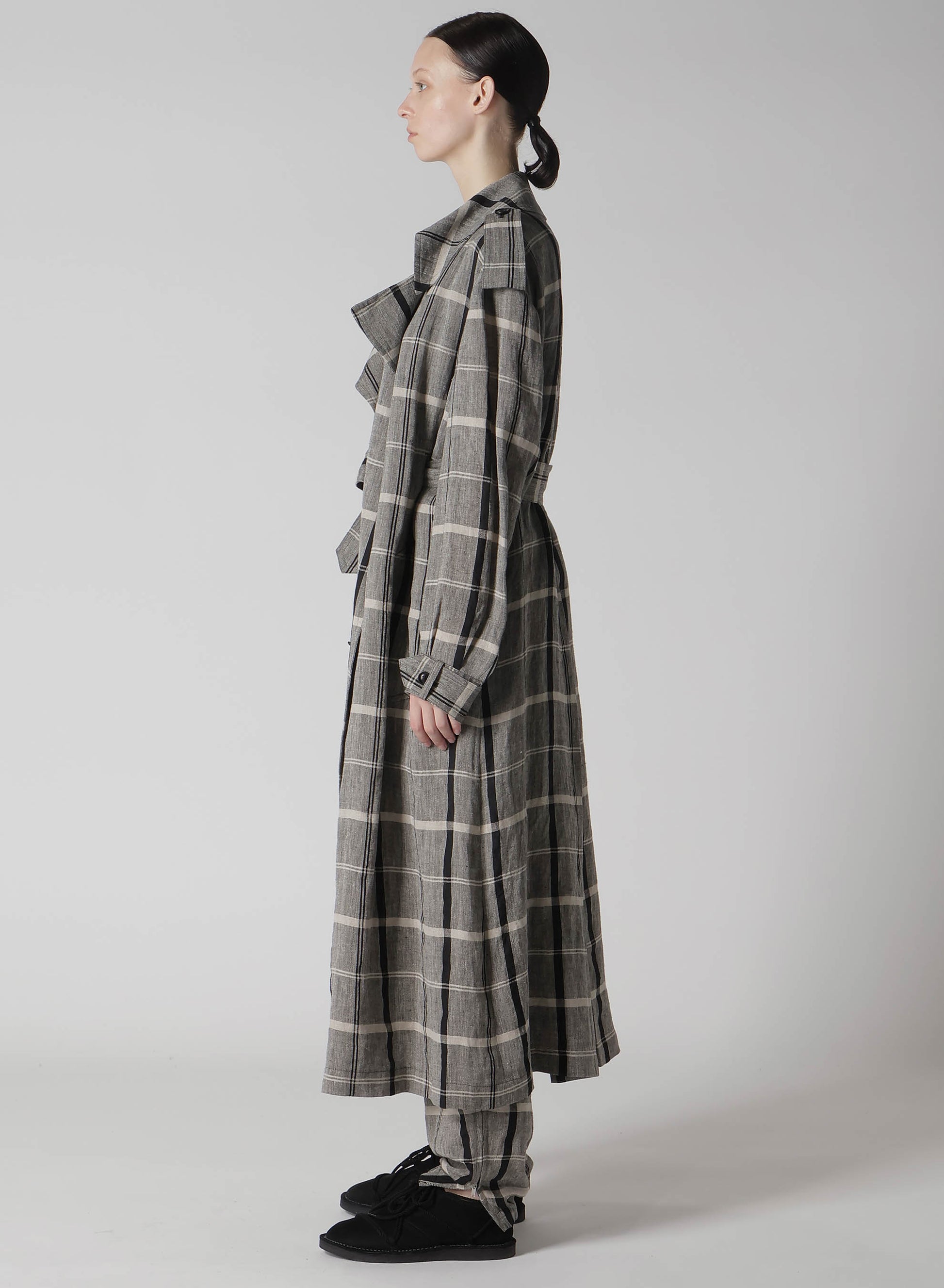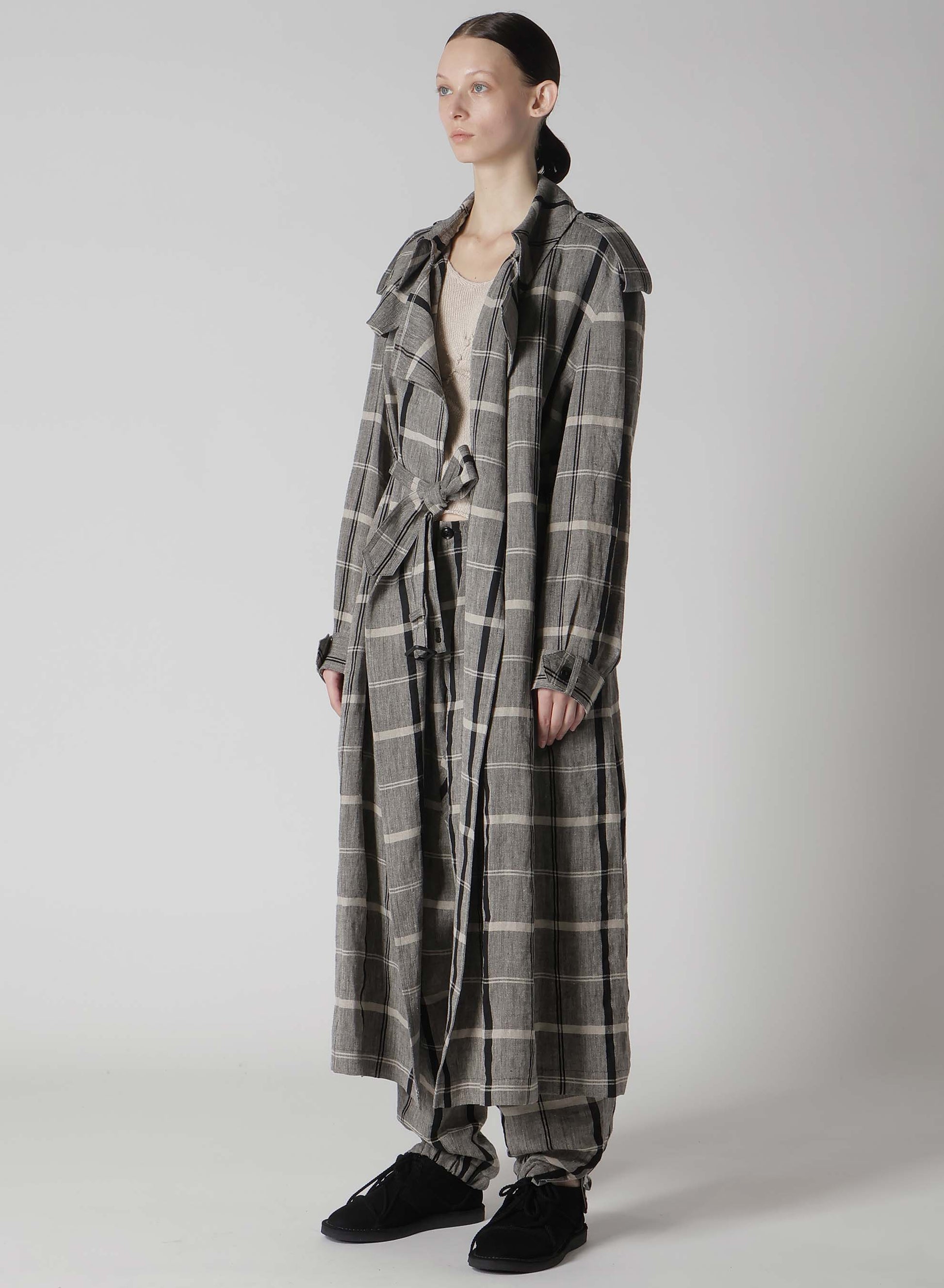This is a linen trench coat with a check pattern, finished with a soft feel due to tumbler processing. It features a belt closure instead of front buttons. The flowing drapery from the collar to the hem adds presence. Note that any surface irregularities are characteristic of linen.