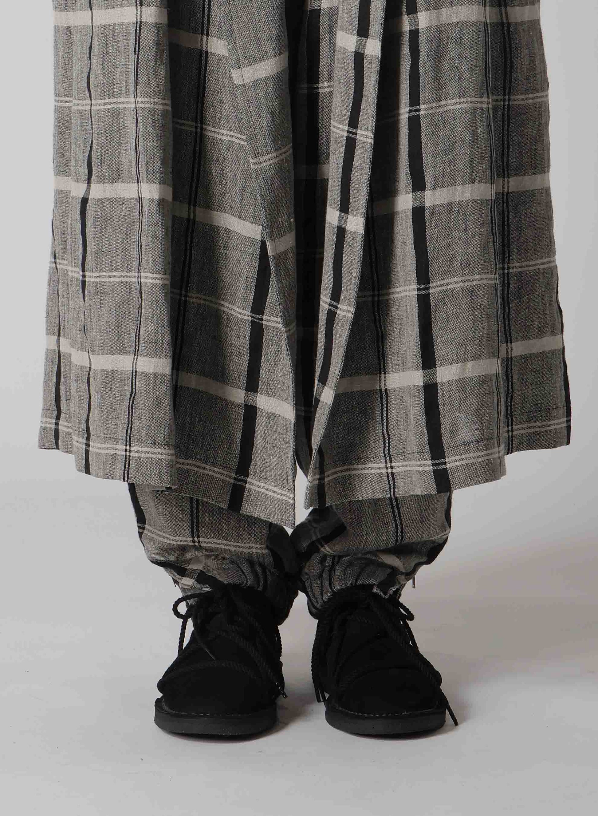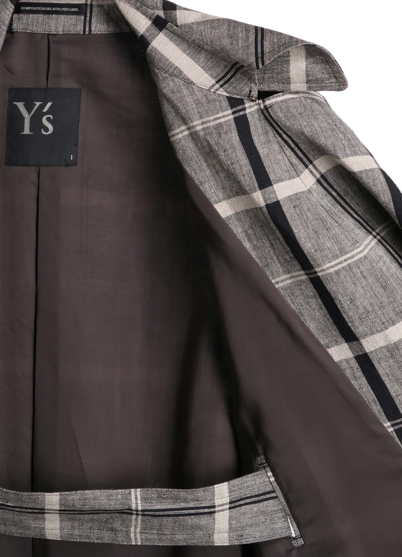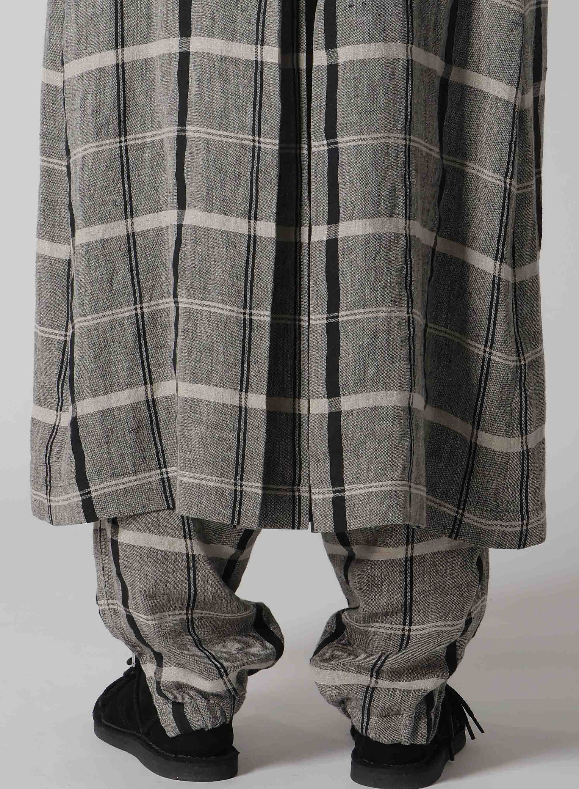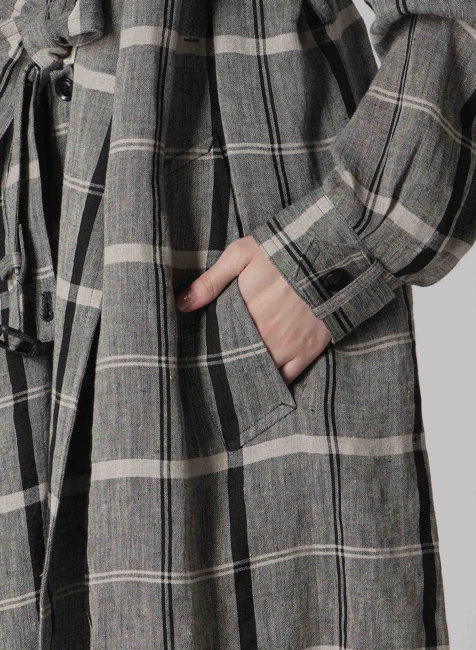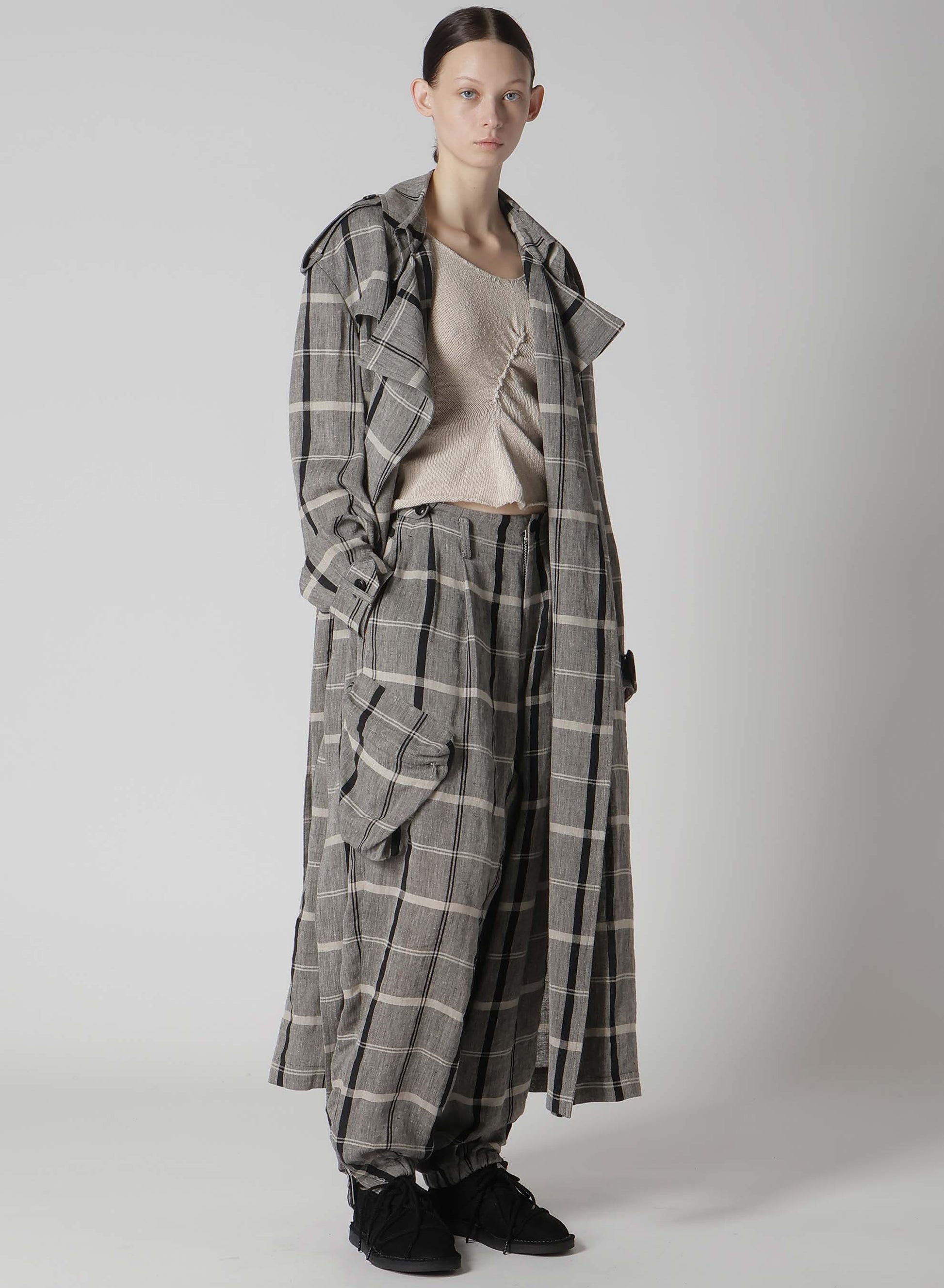 This is a linen trench coat with a check pattern, finished with a soft feel due to tumbler processing. It features a belt closure instead of front buttons. The flowing drapery from the collar to the hem adds presence. Note that any surface irregularities are characteristic of linen.
