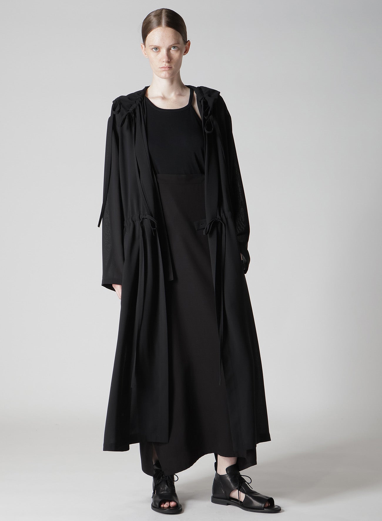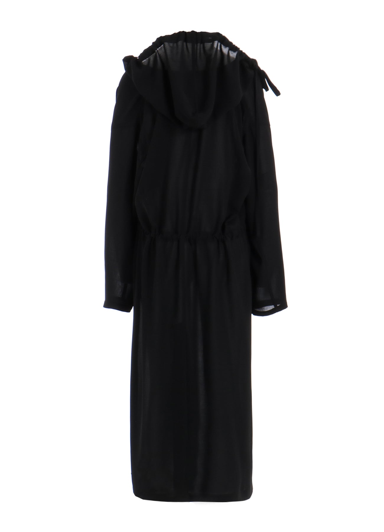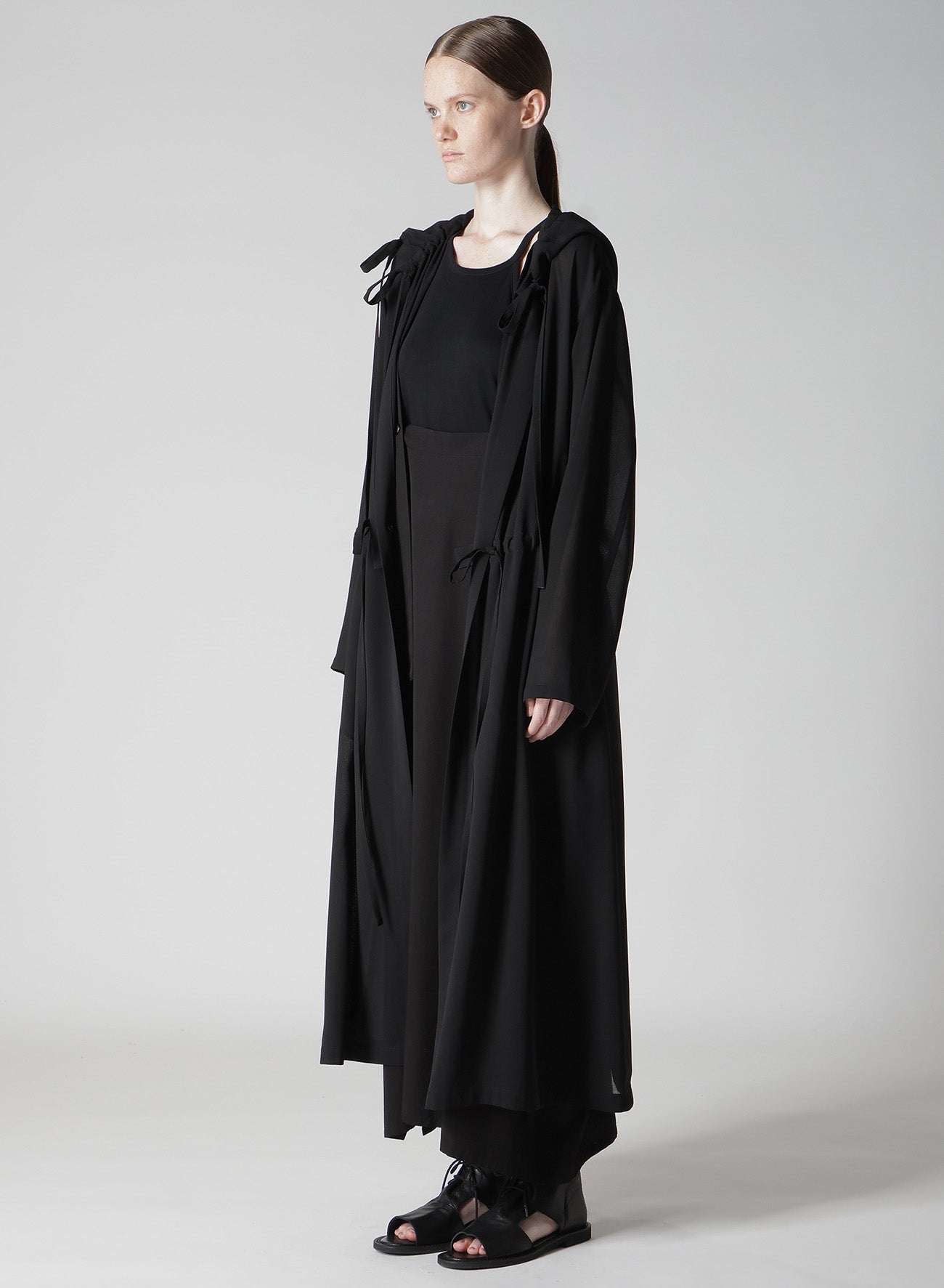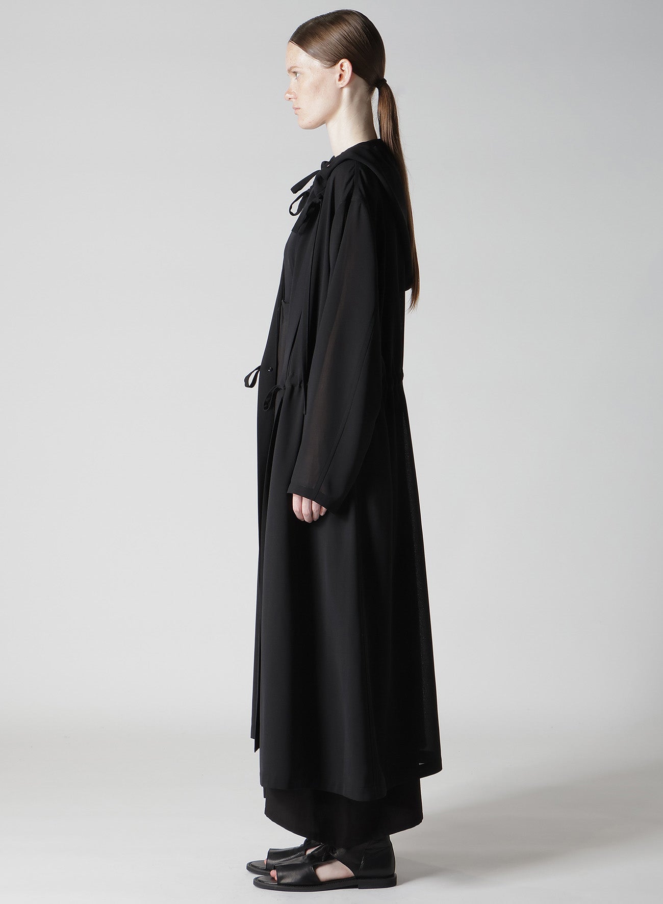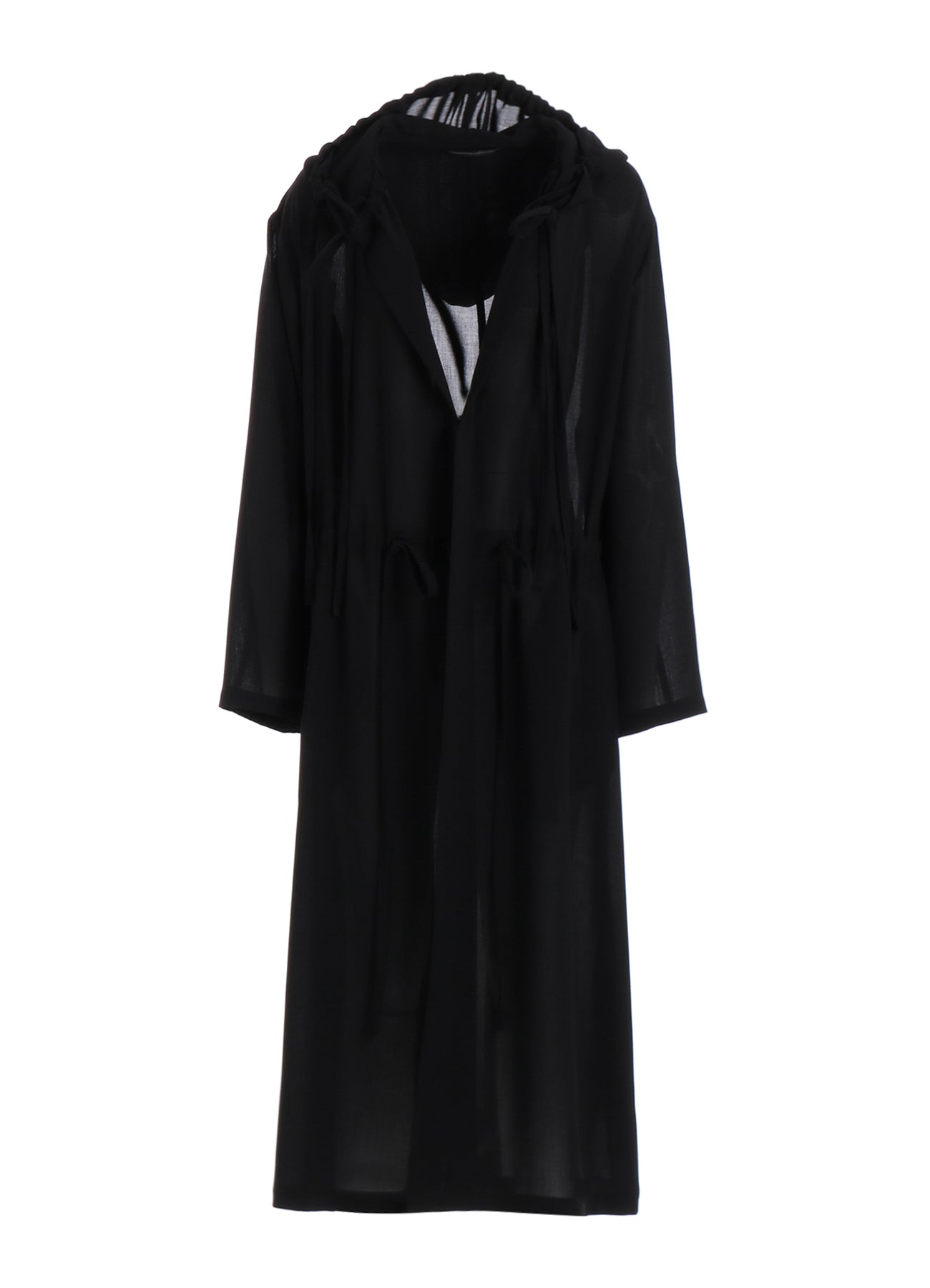 This Y's hoodie coat made from strong-twist fabric features a textured surface and moderate sheerness. It flaunts an abundant design with drawstrings at the hood, collar, and waist, capturing Y's distinguished aesthetic. This versatile garment adds stylish volume to any wardrobe.