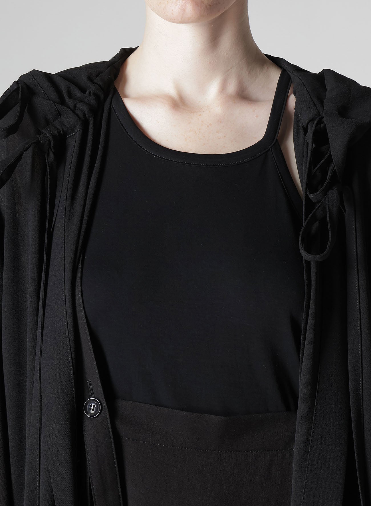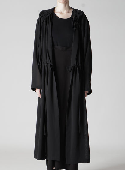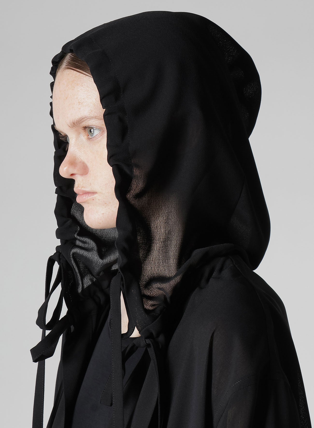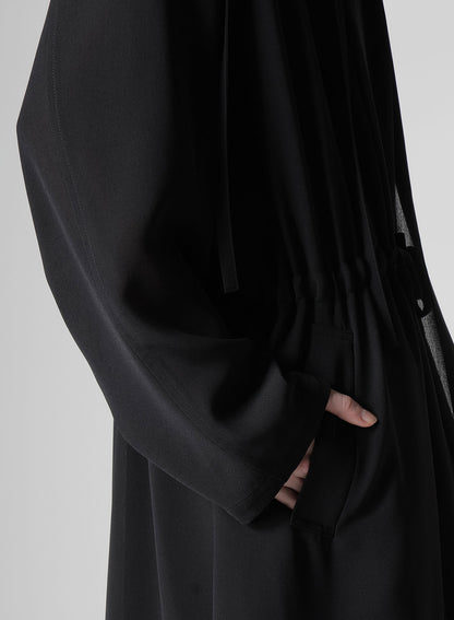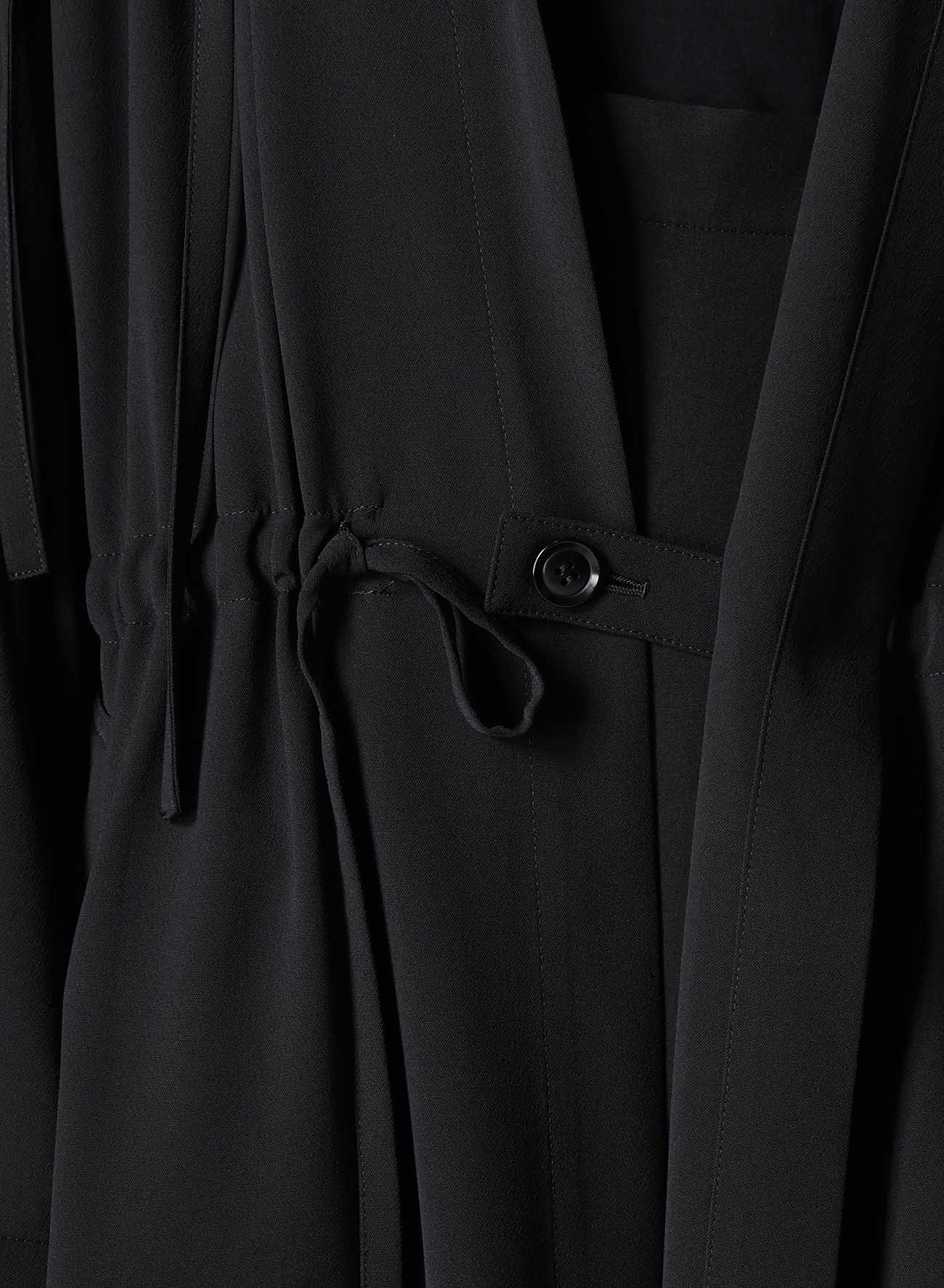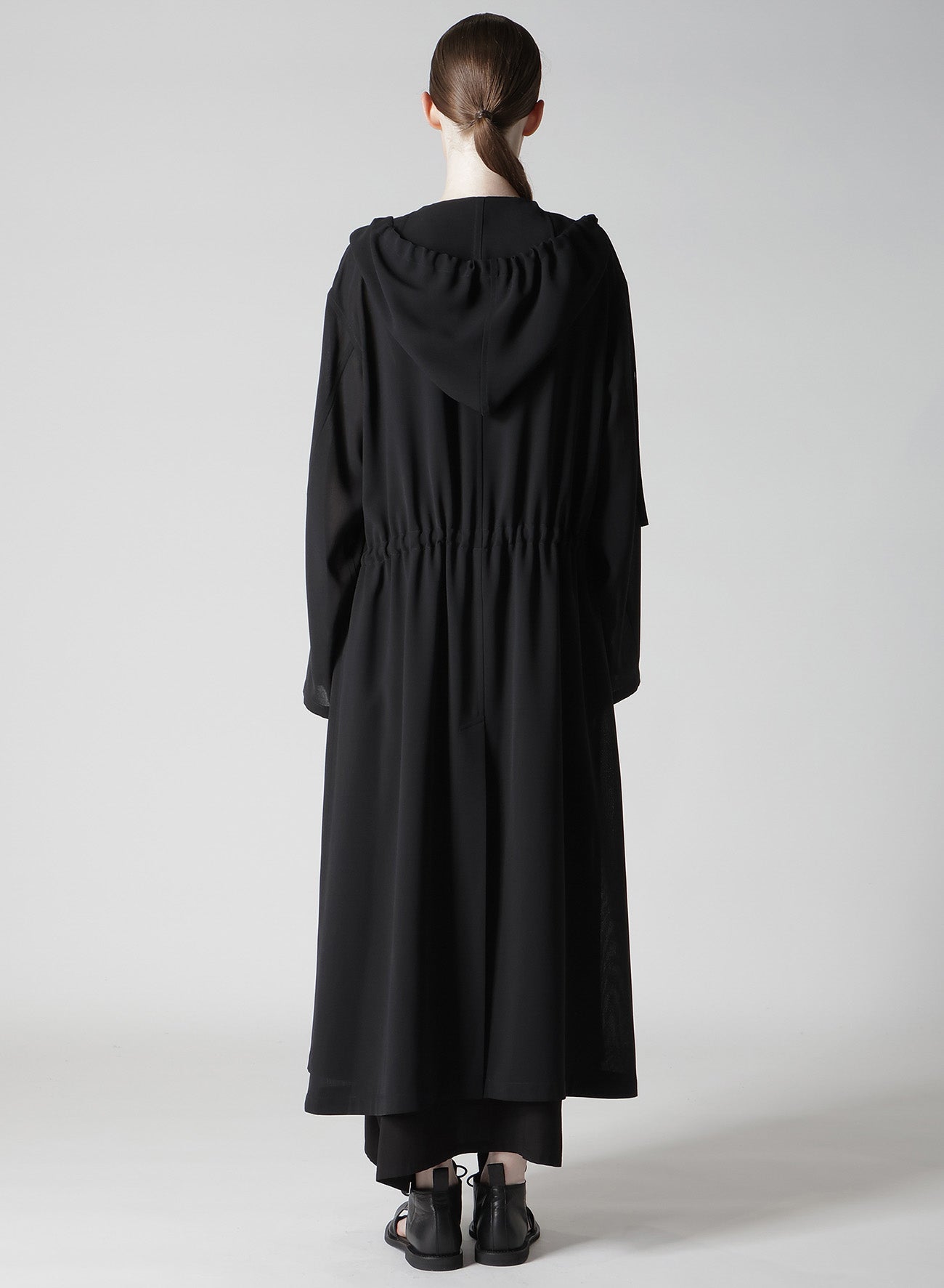 This Y's hoodie coat made from strong-twist fabric features a textured surface and moderate sheerness. It flaunts an abundant design with drawstrings at the hood, collar, and waist, capturing Y's distinguished aesthetic. This versatile garment adds stylish volume to any wardrobe.
