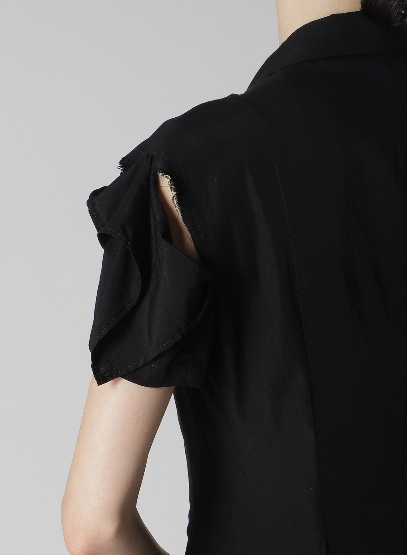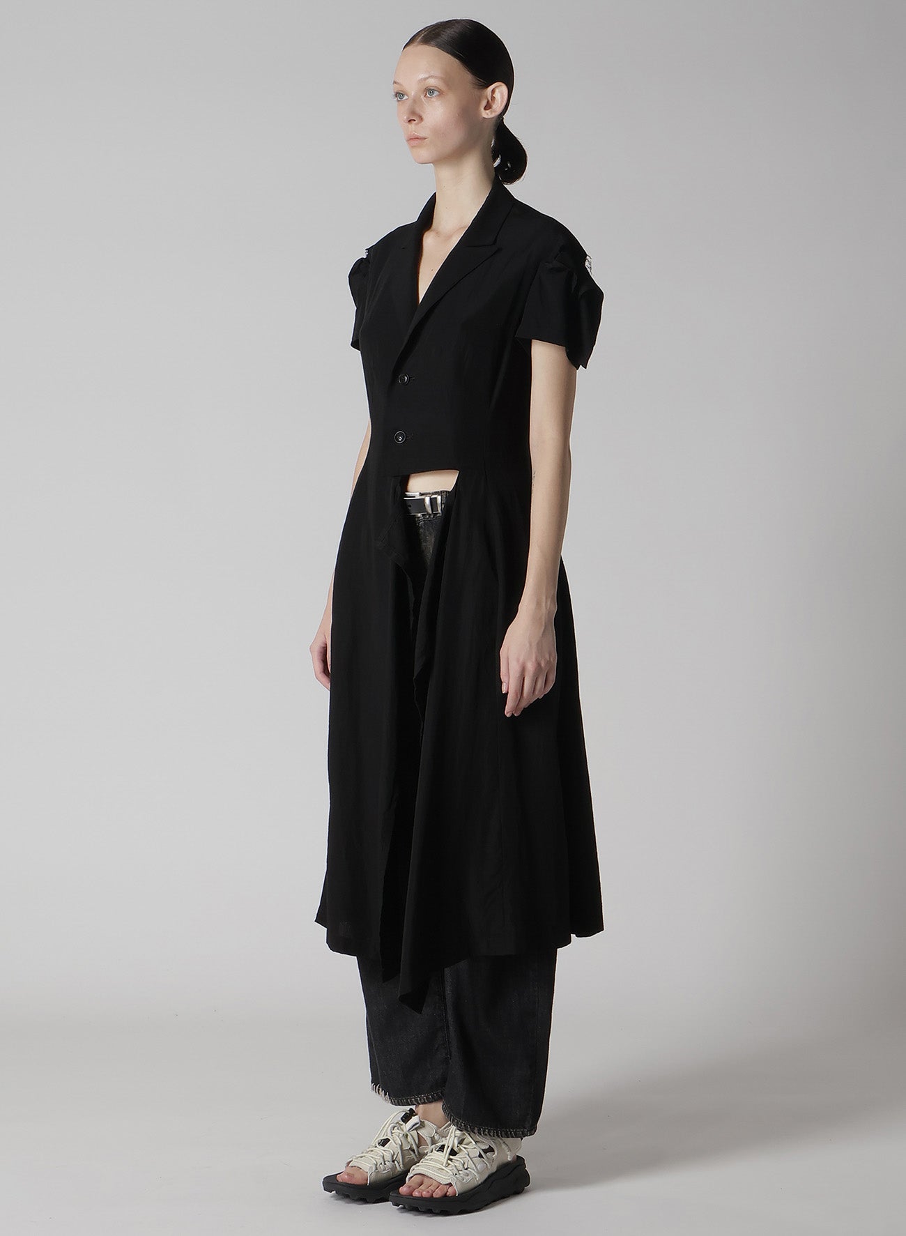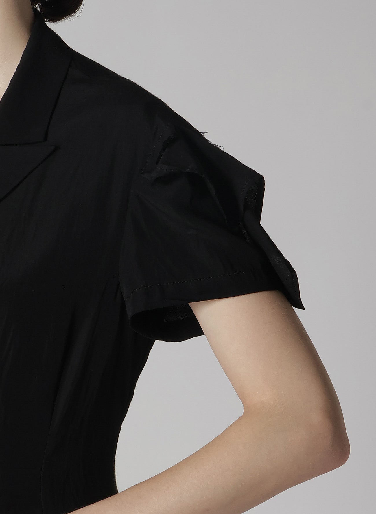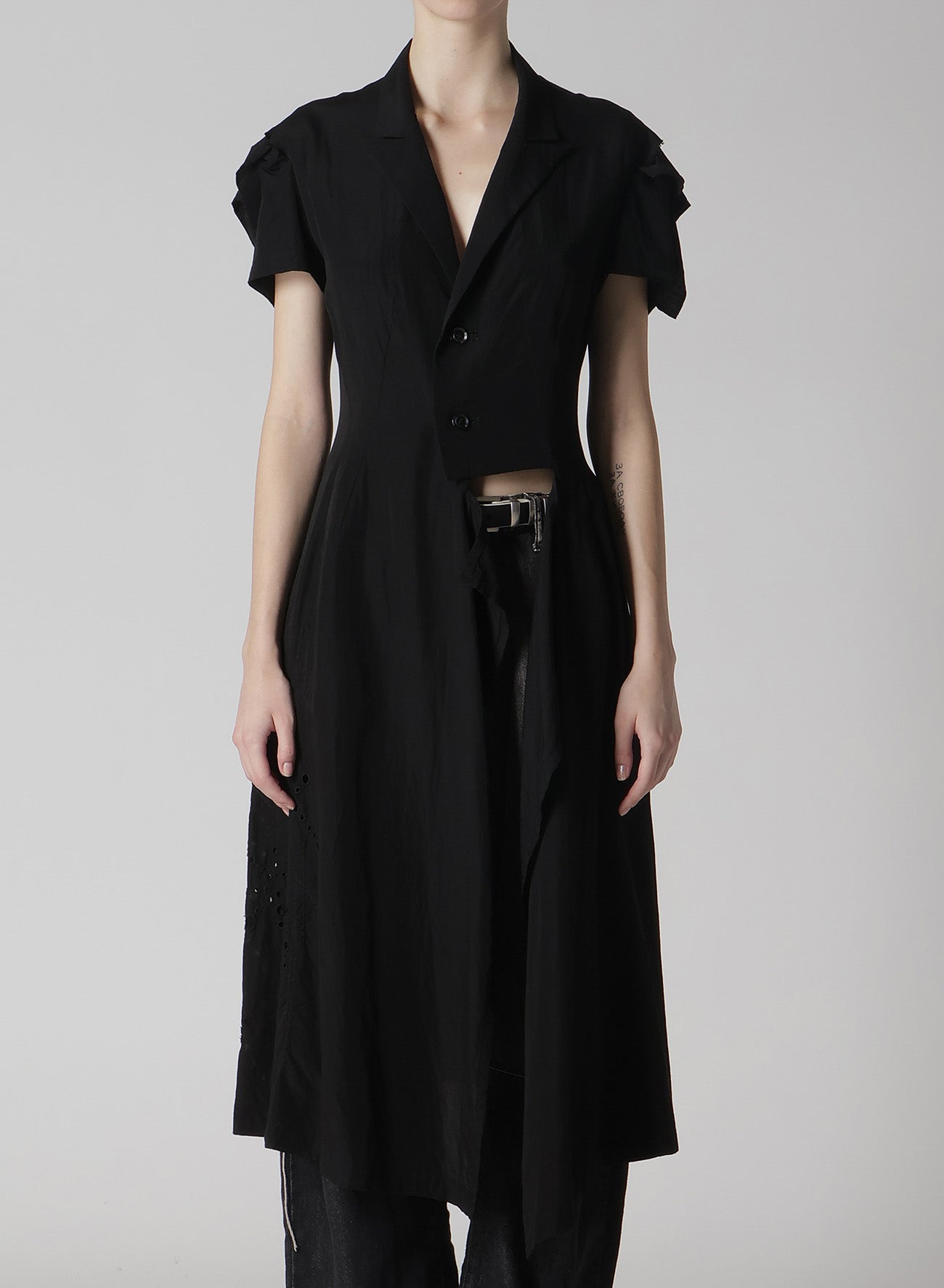 - Partial skin exposure due to slits on the left waist and sleeve cap.