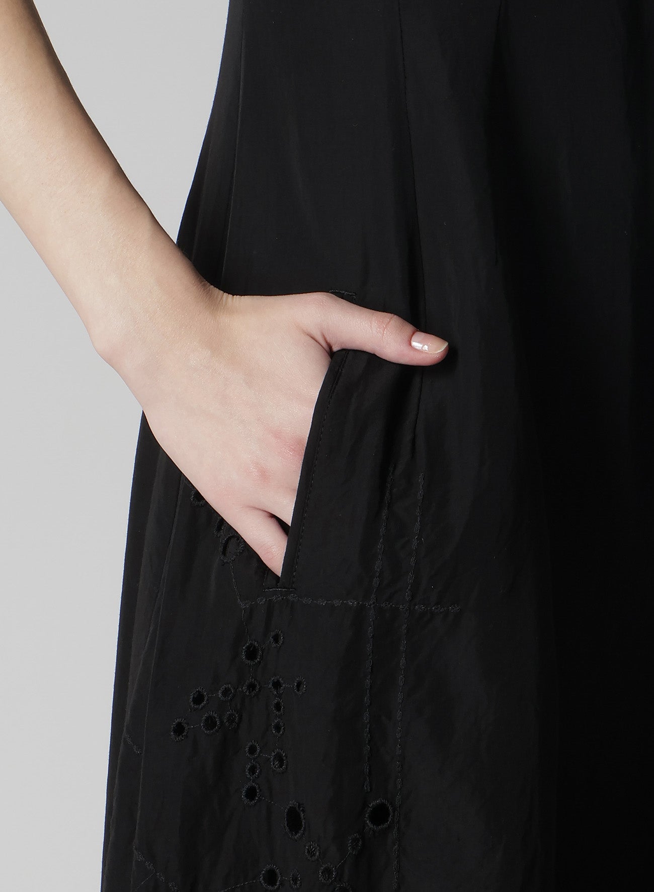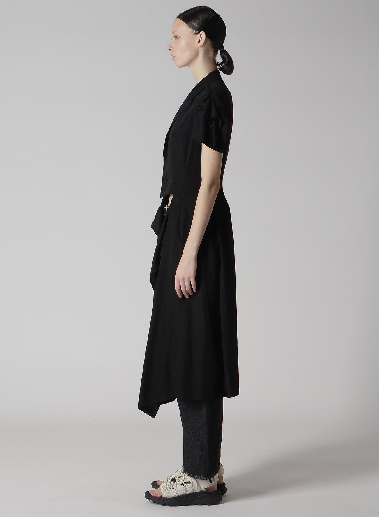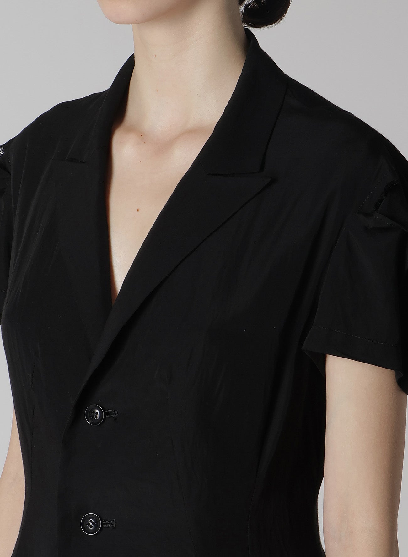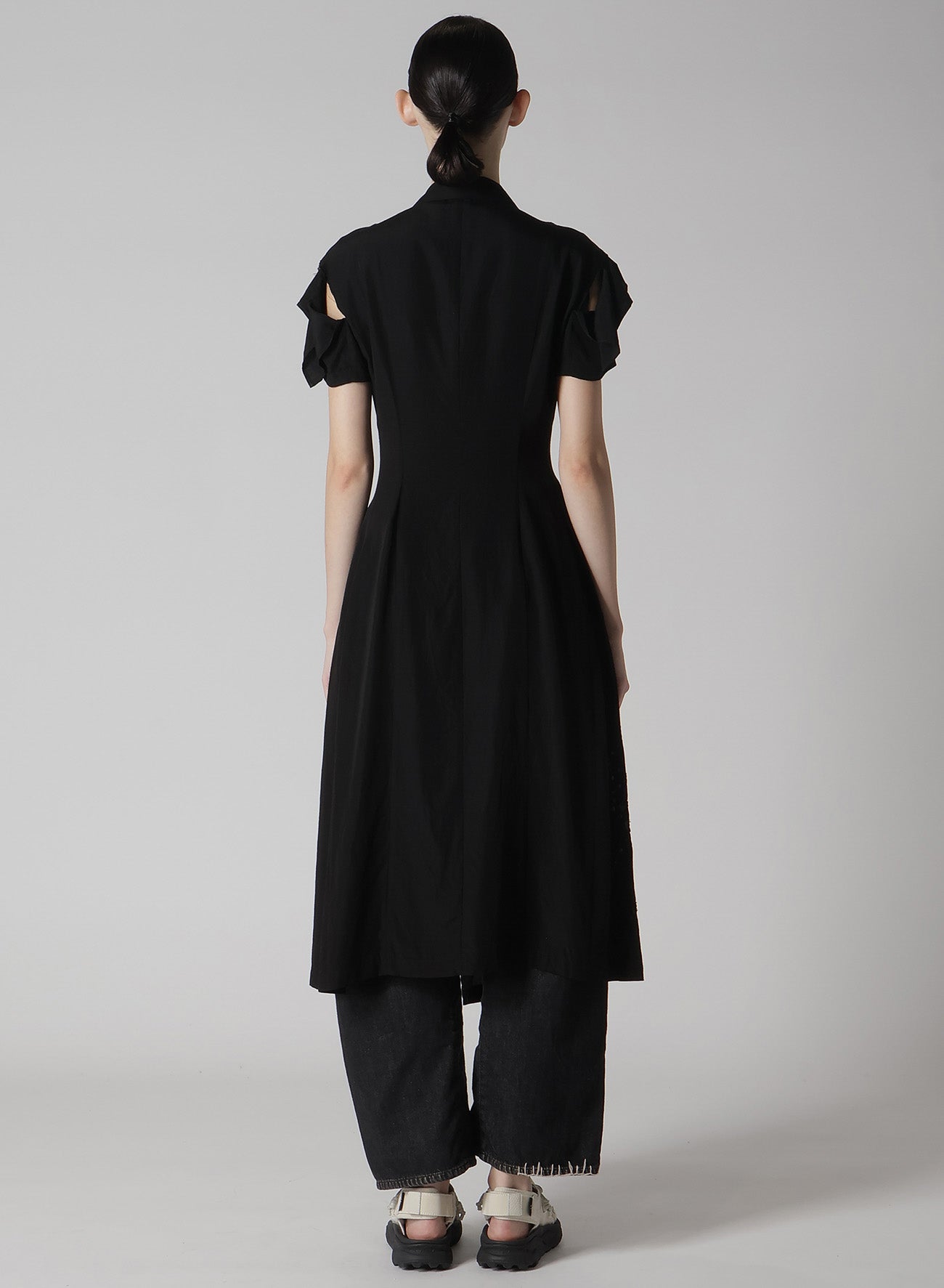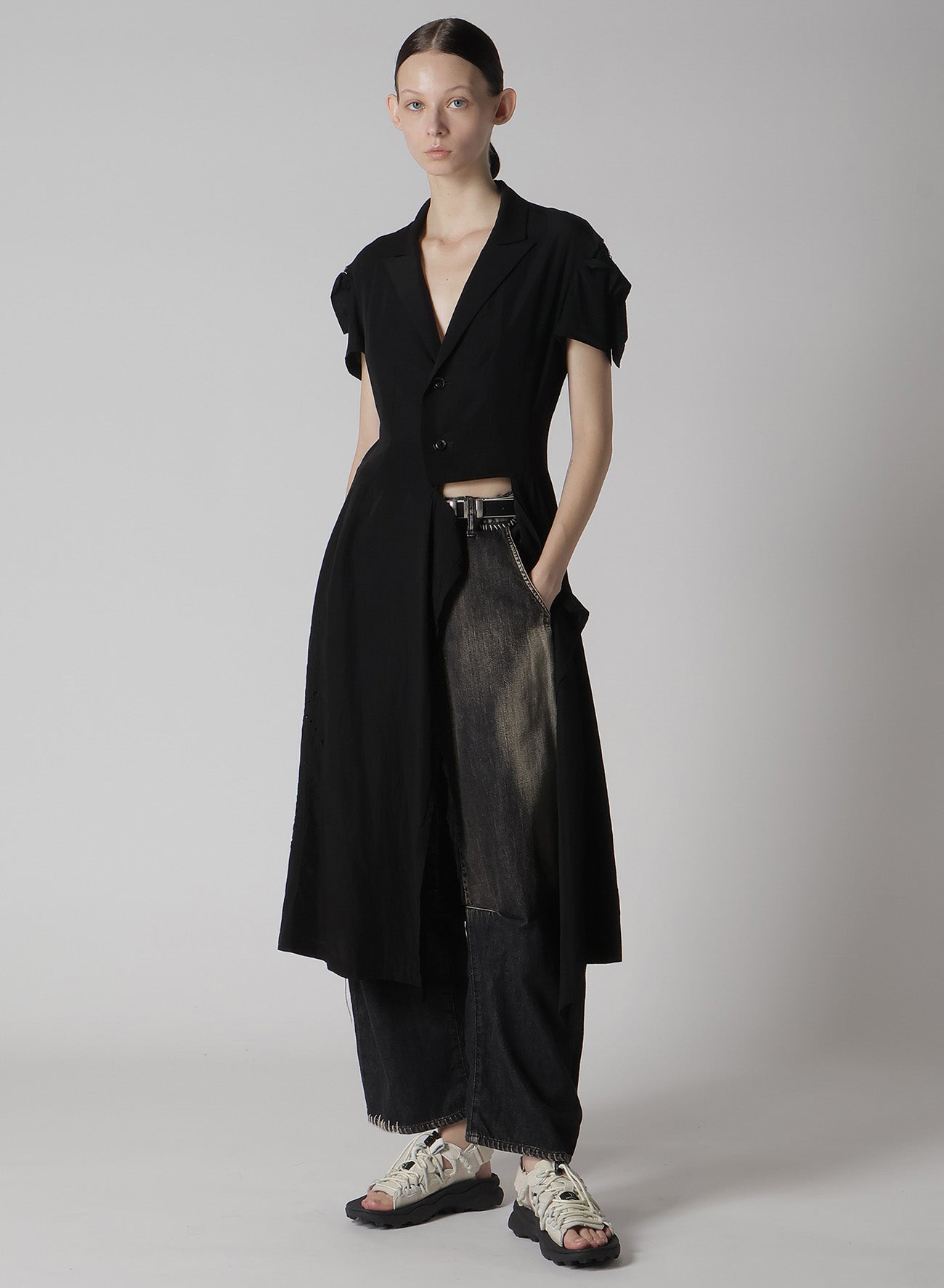 - Partial skin exposure due to slits on the left waist and sleeve cap.