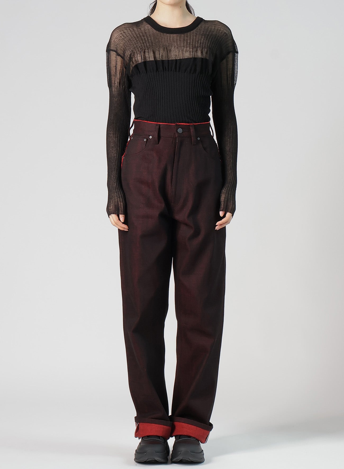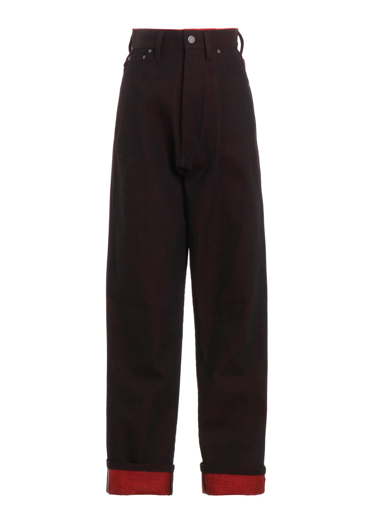 These high-waisted pants are crafted from unique denim, featuring red threads in the weft. The elongated hem can be rolled up, enhancing balance and adding an accent with the reverse side's color. Note that the model images use a sample item and may differ from the actual product. Refer to SIZE INFO for details.