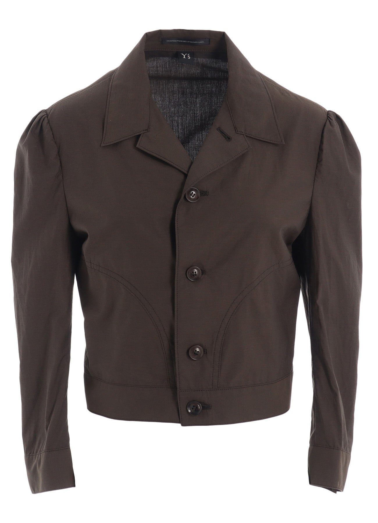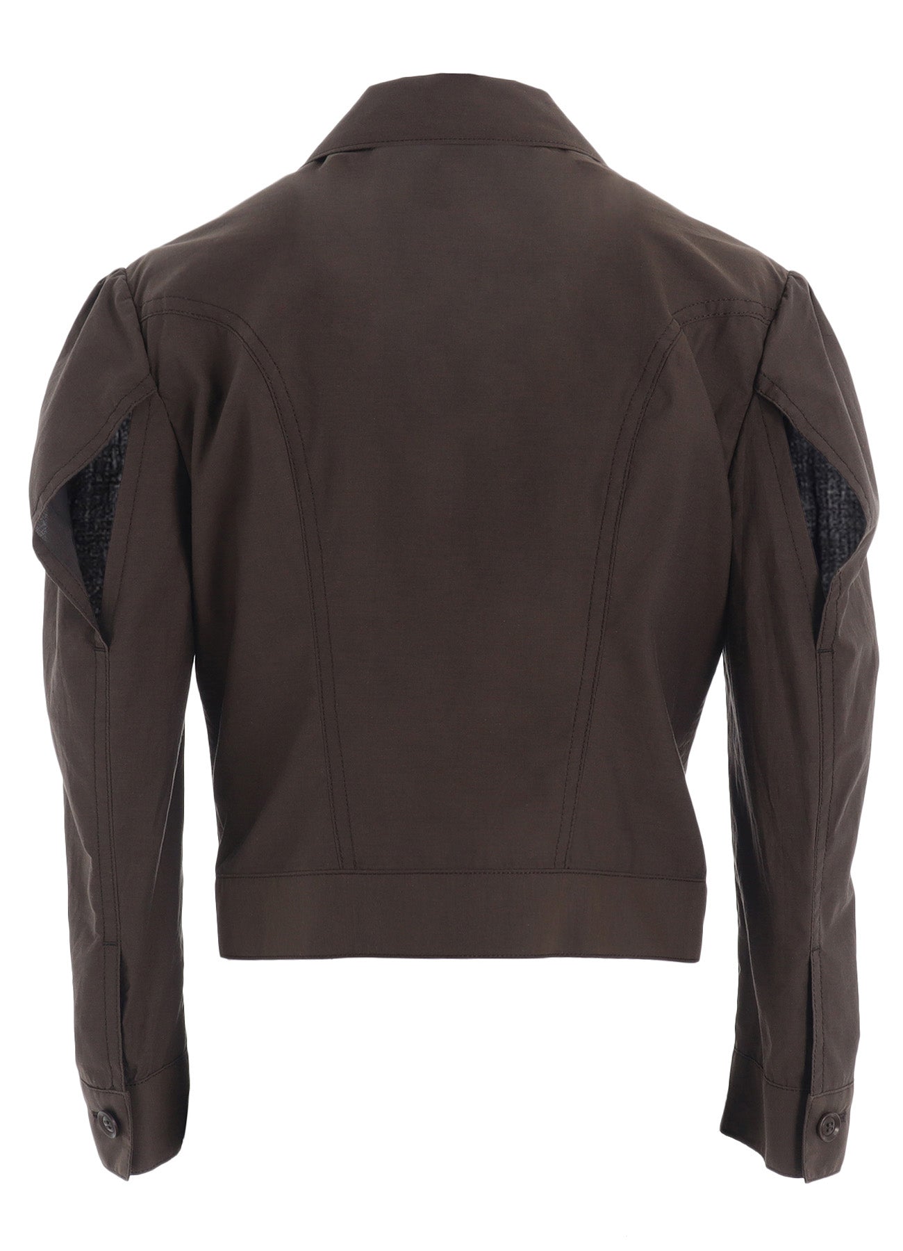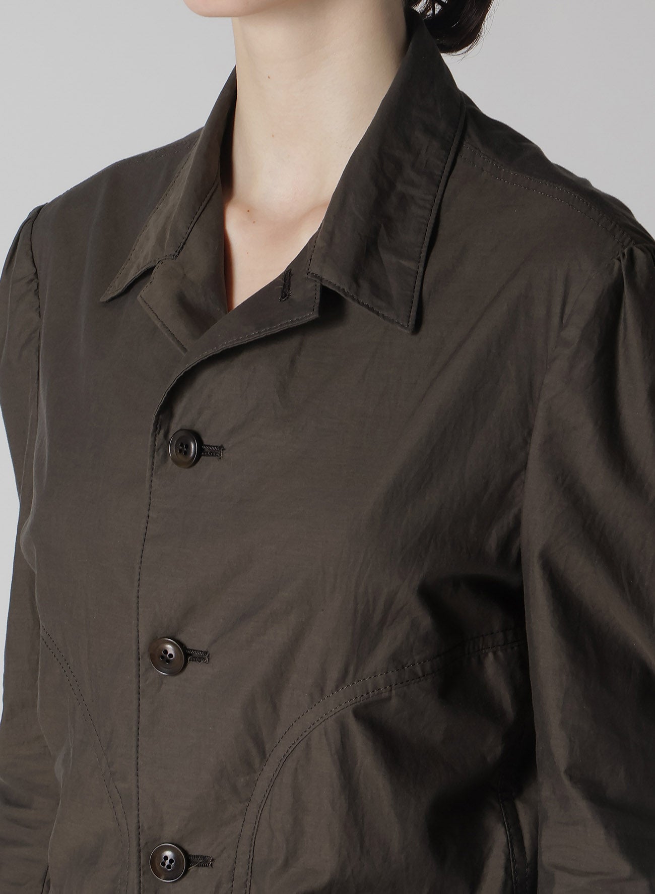 This jacket crafted from cotton typewriter fabric features the drapery of high-density weaving akin to rayon. The design is compactly fitted with an accent of visible sleeve seams.