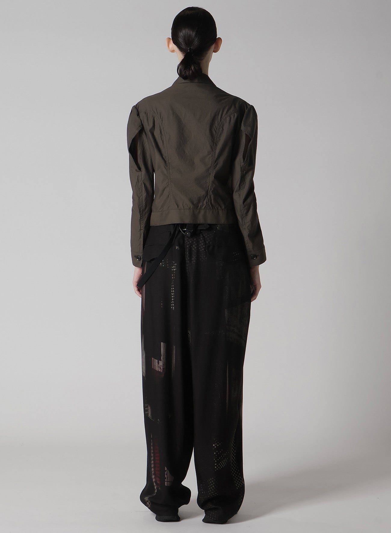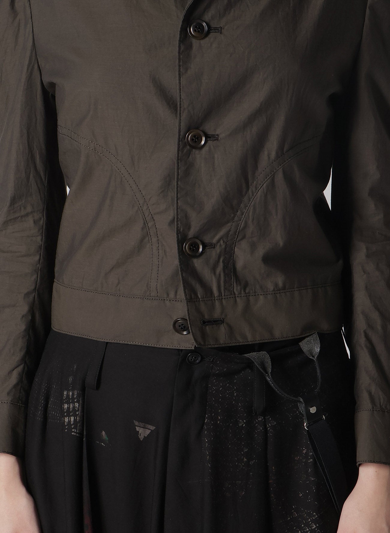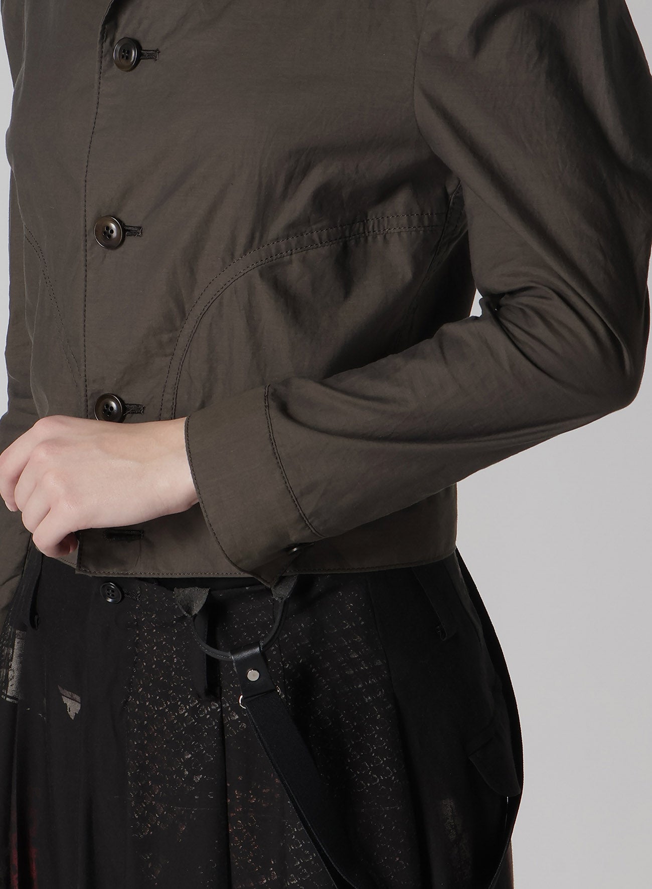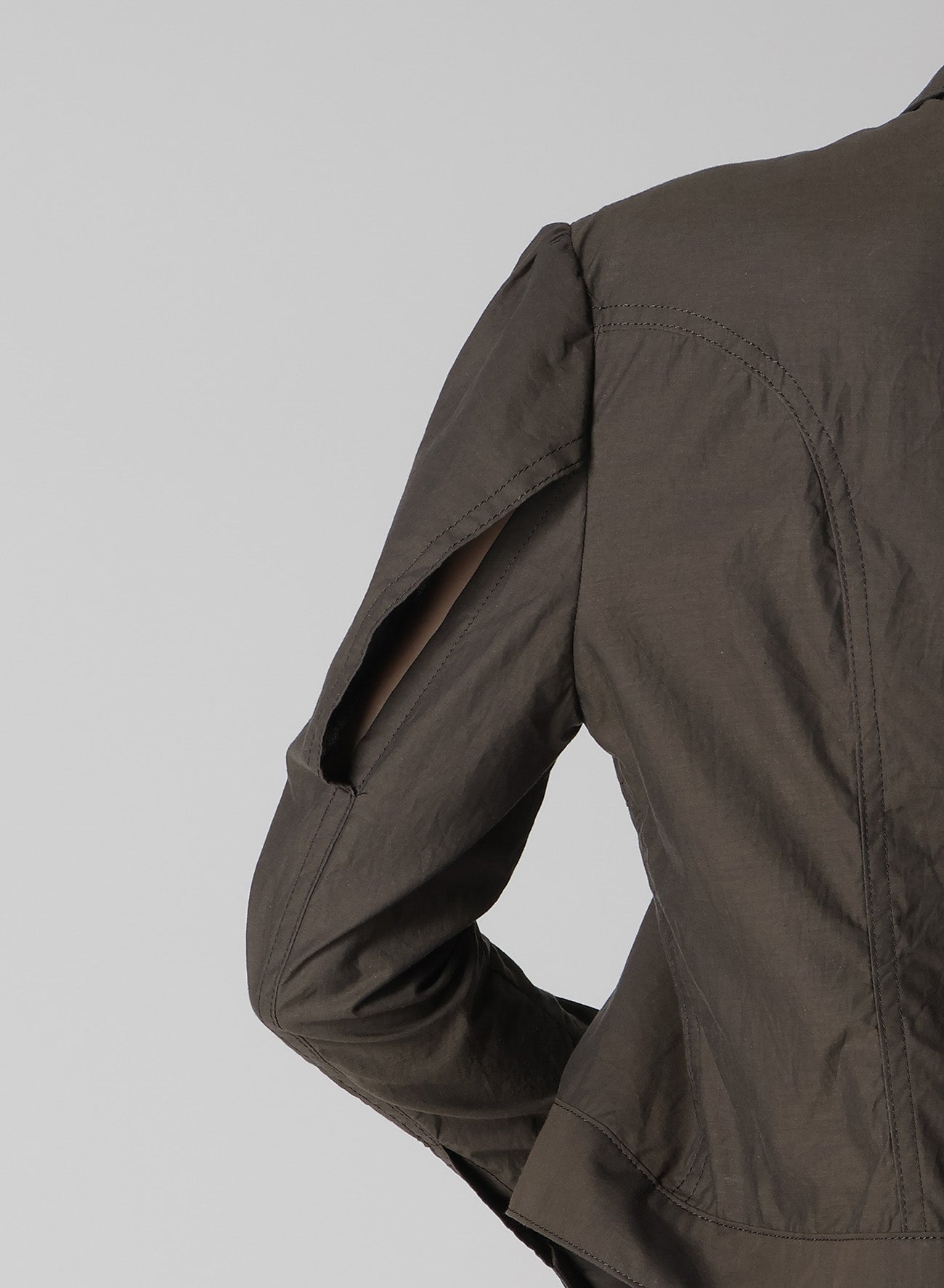 This jacket crafted from cotton typewriter fabric features the drapery of high-density weaving akin to rayon. The design is compactly fitted with an accent of visible sleeve seams.